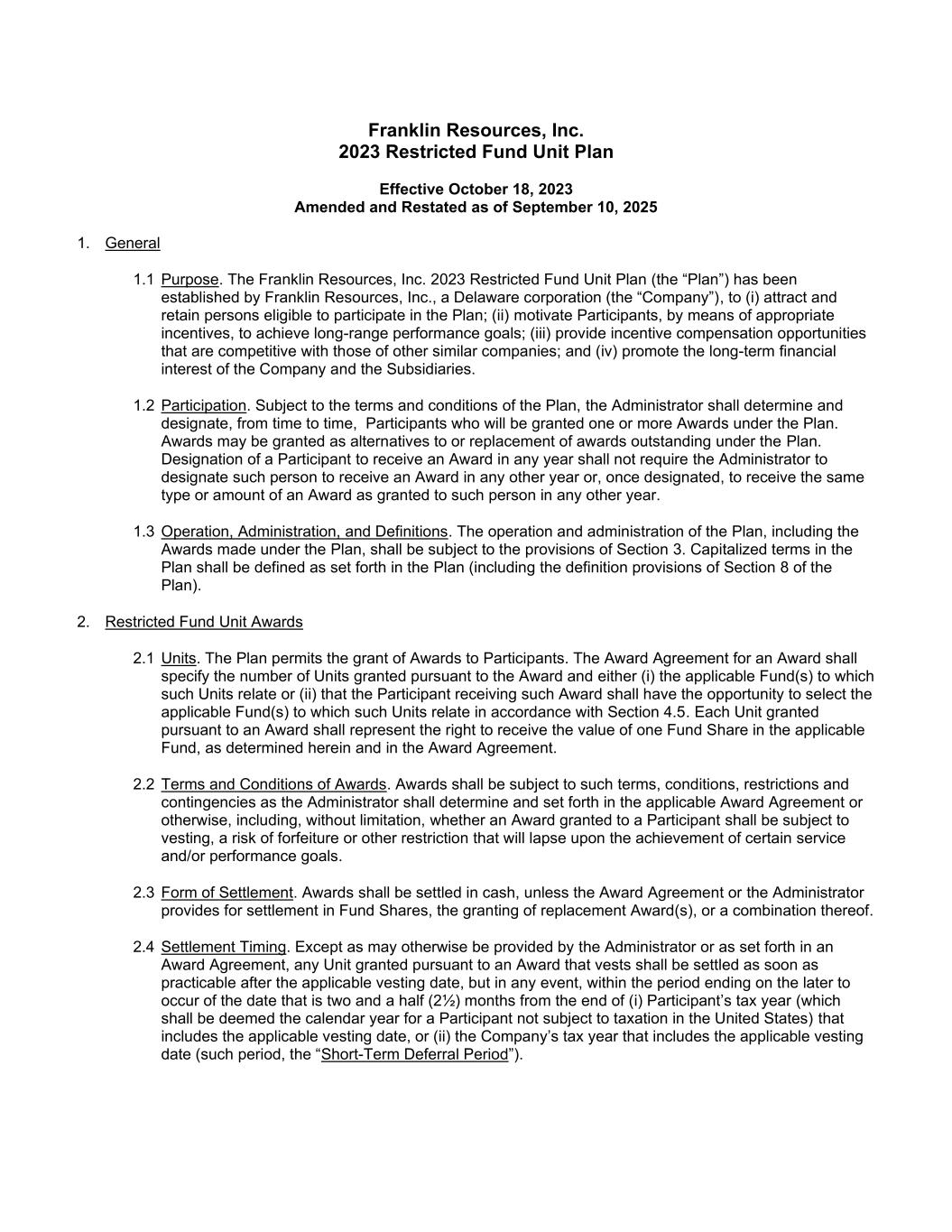 自2025年9月10日起经修订及重述的富兰克林资源公司 2023年受限制基金单位计划自2023年10月18日起生效1。一般1.1目的。富兰克林资源公司 2023年限制性基金单位计划(“计划”)已由特拉华州公司(“公司”)设立,旨在(i)吸引和留住有资格参与该计划的人员;(ii)通过适当的激励措施激励参与者实现长期业绩目标;(iii)提供与其他同类公司具有竞争力的激励薪酬机会;(iv)促进公司及子公司的长期财务利益。1.2参与。根据该计划的条款和条件,管理人应不时确定和指定根据该计划将获得一项或多项奖励的参与者。可授予奖励,作为该计划下未兑现奖励的替代或替代。指定参加者于任何年度领取奖状,不得规定署长须指定该人于任何其他年度领取奖状,或一经指定,须领取与在任何其他年度授予该人相同的奖状种类或金额。1.3运营、管理、定义。该计划的运营和管理,包括根据该计划作出的奖励,应遵守第3节的规定。计划中的大写术语应按计划中规定的定义(包括计划第8节的定义规定)。2.受限制基金单位奖励2.1个单位。该计划允许向参与者授予奖励。授标的授标协议须指明根据授标批出的单位数目,以及(i)与该等单位有关的适用基金或(ii)接受该等奖励的参与者有机会根据第4.5节选择与该等单位有关的适用基金。根据奖励授予的每个单位应代表有权获得适用基金中一个基金份额的价值,如本协议和奖励协议中所确定。2.2裁决条款和条件。授标应受管理人在适用的授标协议或其他方面确定和规定的条款、条件、限制和或有事项的约束,包括但不限于授予参与者的授标是否应受到归属、没收风险或其他限制,这些风险或限制将在实现某些服务和/或绩效目标时失效。2.3结算形式。奖励应以现金结算,除非奖励协议或管理人规定以基金份额结算、授予替代奖励或其组合。2.4结算时间。除署长另有规定或授标协议另有规定外,依据授标授予的任何归属单位,须在适用的归属日期后在切实可行范围内尽快结清,但无论如何,须在自(i)参与者的纳税年度(该年度应被视为参与者在美国无需缴税的日历年度)结束之日起两个半(2.5)个月的较后日期结束的期间内,包括适用的归属日期,或(ii)包括适用归属日期的公司纳税年度(该期间,“短期延期期”)。