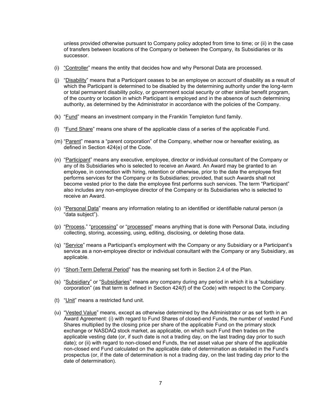 7除非根据不时采纳的公司政策另有规定;或(ii)在公司地点之间或公司、其附属公司或其继承者之间的转移情况下。“控制器”是指决定如何以及为什么处理个人数据的实体。“残疾”是指参与者因残疾而不再是雇员,因此参与者根据参与者受雇所在国家或地区的长期或完全永久残疾政策或政府社会保障或其他类似福利计划确定为残疾,并且在没有此种确定权力的情况下,由管理人根据公司政策确定。“基金”是指富兰克林邓普顿基金家族中的一家投资公司。“基金份额”是指一系列适用基金的适用类别的一份份额。“母公司”是指《守则》第424(e)节所定义的公司的“母公司”,无论是现在还是以后都存在。「参与者」指公司或其任何附属公司的任何行政人员、雇员、董事或个人顾问获选接受奖励。可在雇员首次为公司或其子公司提供服务的日期之前,就雇用、留用或其他方面向雇员授予奖励;但该等奖励不得在雇员首次提供此类服务的日期之前归属。“参与者”一词还包括公司或其子公司的任何非雇员董事,他们被选中接受奖励。“个人数据”是指与已识别或可识别的自然人(“数据主体”)有关的任何信息。“处理”、“处理”或“处理”是指对个人数据所做的任何事情,包括收集、存储、访问、使用、编辑、披露或删除这些数据。「服务」指参与者受雇于公司或任何附属公司,或参与者作为非雇员董事或个人顾问服务于公司或任何附属公司(如适用)。“短期延期期”具有该计划第2.4节规定的含义。“附属公司”或“附属公司”是指在其作为“附属公司”(该术语在《守则》第424(f)节中定义)的任何时期内就公司而言的任何公司。“单位”是指受限制的基金单位。“既得价值”是指,除非管理人另有决定或授标协议另有规定:(i)就封闭式基金的基金份额而言,已归属基金份额的数量乘以适用基金在适用的主要证券交易所或纳斯达克股票市场的每股收盘价(如适用),该基金随后在适用的归属日(如该日期不是交易日,则在该日期之前的最后一个交易日)进行交易;或(ii)就非封闭式基金而言,适用的非封闭式基金在基金招募说明书中详述的适用确定日(如确定日不是交易日,则在确定日前最后一个交易日)计算的每股资产净值。