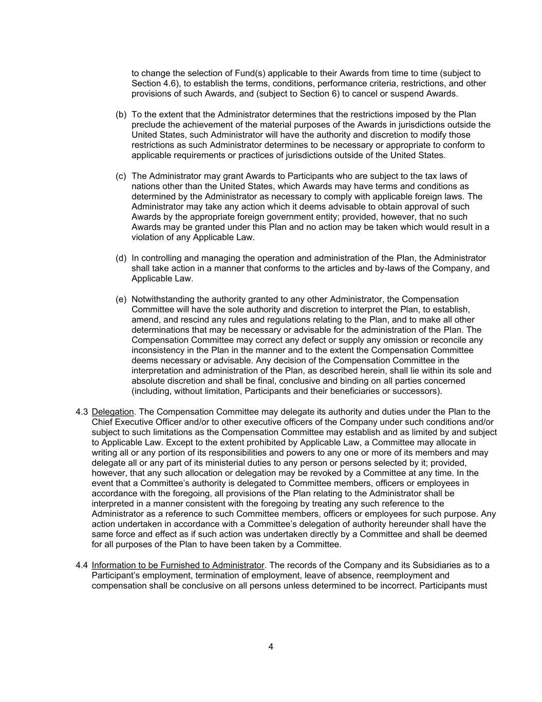4不时更改适用于其奖励的基金的选择(受第4.6节规限),确立该等奖励的条款、条件、业绩标准、限制及其他规定,并(受第6节规限)取消或暂停奖励。(b)如果管理人确定该计划施加的限制排除了在美国以外的司法管辖区实现裁决的实质性目的,则该管理人将有权和酌处权修改这些限制,因为该管理人认为这些限制是必要或适当的,以符合美国以外司法管辖区的适用要求或做法。(c)管理人可向受美国以外国家税法约束的参与者授予奖励,这些奖励可能具有由管理人为遵守适用的外国法律而确定的必要条款和条件。管理人可采取其认为可取的任何行动,以获得适当的外国政府实体对此类裁决的批准;但前提是不得根据本计划授予此类裁决,也不得采取会导致违反任何适用法律的行动。(d)管理人在控制和管理计划的运营和管理时,应以符合公司章程和细则以及适用法律的方式采取行动。(e)尽管授予任何其他管理人的权力,薪酬委员会将拥有解释计划、建立、修订和废除与计划有关的任何规则和条例以及作出管理计划可能必要或可取的所有其他决定的唯一权力和酌处权。薪酬委员会可按薪酬委员会认为必要或可取的方式及范围,更正计划中的任何缺陷或提供任何遗漏或调和计划中的任何不一致之处。薪酬委员会在本计划的解释和管理方面的任何决定,如本文所述,应在其唯一和绝对的酌处权范围内,并应是最终的、决定性的,并对所有相关方(包括但不限于参与者及其受益人或继任者)具有约束力。4.3代表团。薪酬委员会可根据薪酬委员会可能订立的条件和/或受适用法律限制的条件和/或限制,将其在计划下的权力和职责授予首席执行官和/或公司的其他执行官。除适用法律禁止的范围外,委员会可将其全部或任何部分职责和权力以书面分配给其任何一名或多名成员,并可将其全部或任何部分部级职责转授给其选定的任何人或多人;但委员会可随时撤销任何此类分配或转授。如果委员会的权力按照上述规定下放给委员会成员、官员或雇员,则应以符合上述规定的方式解释计划中与管理人有关的所有条款,将任何对管理人的提及视为为此目的对这些委员会成员、官员或雇员的提及。根据委员会根据本协议授予的权力而采取的任何行动,其效力和效力应与此种行动由委员会直接采取的相同,并就本计划的所有目的而言,应被视为由委员会采取。4.4向管理员提供的信息。公司及其子公司关于参与者受雇、终止雇佣、休假、再就业和补偿的记录,除非被确定为不正确,否则对所有人都是结论性的。参与者必须