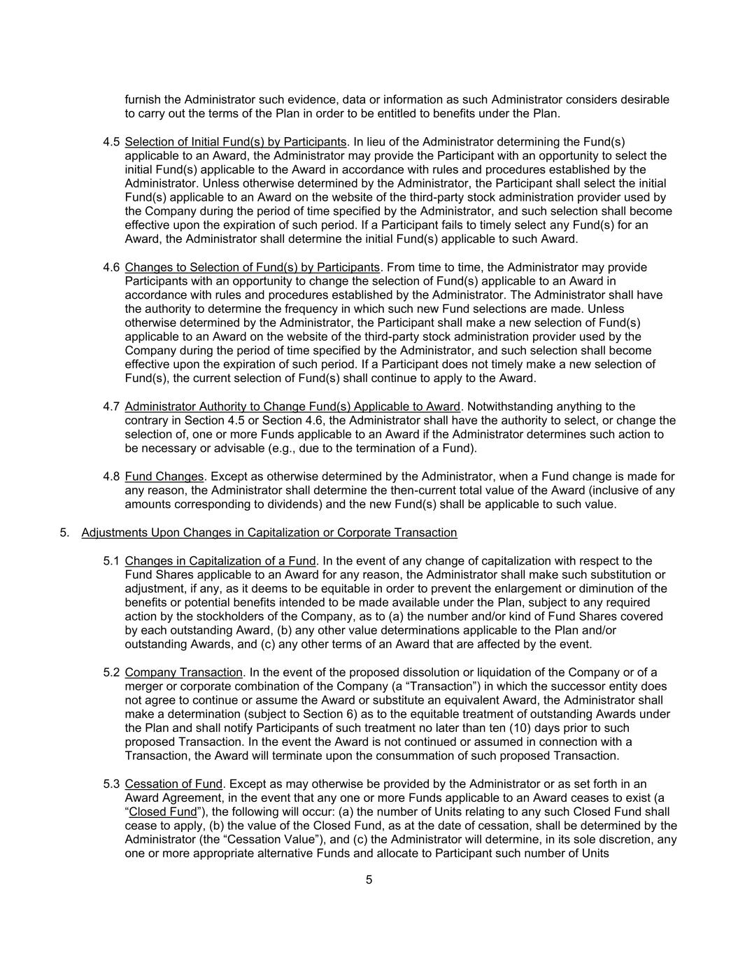 5向管理人提供该管理人认为执行计划条款所需的证据、数据或信息,以便有权获得计划下的福利。4.5参与者选择初始基金。代替管理人确定适用于某一裁决的基金,管理人可向参与者提供机会,根据管理人制定的规则和程序选择适用于该裁决的初始基金。除非管理人另有决定,参与者应在管理人指定的期限内在公司使用的第三方股票管理提供商的网站上选择适用于某项奖励的初始基金,该选择应在该期限届满时生效。如参与者未能及时为某一奖项选择任何基金,则管理人应确定适用于该奖项的初始基金。4.6参与者选择基金的变更。管理人可不时向参与者提供机会,根据管理人制定的规则和程序,改变适用于某一裁决的基金的选择。管理人有权决定此类新基金选择的频率。除非管理人另有决定,参与者应在管理人指定的期限内在公司使用的第三方股票管理提供商的网站上重新选择适用于某一奖项的基金,该选择应在该期限届满时生效。如参赛者未及时作出新的基金评选,则现行的基金评选应继续适用于该奖项。4.7适用于授标的变更基金的管理人权力。尽管第4.5节或第4.6节中有任何相反的规定,如果管理人确定此类行动是必要的或可取的(例如,由于基金终止),则管理人应有权选择或更改适用于裁决的一个或多个基金的选择。4.8基金变动。除管理人另有决定外,当因任何理由进行基金变更时,管理人应确定当时的奖励总价值(包括与股息相对应的任何金额),新的基金应适用于该价值。5.资本化或公司交易变动时的调整5.1基金资本化变动。如因任何理由而发生适用于某项奖励的基金份额的任何资本化变动,管理人须作出其认为公平的替代或调整(如有的话),以防止根据该计划拟提供的利益或潜在利益的扩大或减少,但须符合公司股东的任何规定行动,有关(a)每项未偿还奖励所涵盖的基金份额的数量和/或种类,(b)适用于该计划和/或未偿还奖励的任何其他价值确定,及(c)受该事件影响的任何其他奖项条款。5.2公司交易。如果公司的拟议解散或清算,或公司的合并或公司合并(“交易”)中的继承实体不同意继续或承担裁决或替代同等裁决,则管理人应就计划下未偿裁决的公平待遇作出决定(在符合第6条的情况下),并应不迟于该拟议交易前十(10)天将此种待遇通知参与者。如果与交易有关的奖励没有继续或承担,则奖励将在该拟议交易完成时终止。5.3停止基金。除管理人另有规定或授标协议另有规定外,如适用于某项授标的任何一项或多项基金(“封闭式基金”)不复存在,将发生以下情况:(a)与任何该等封闭式基金有关的单位数量应停止适用,(b)封闭式基金在终止之日的价值应由管理人确定(“终止价值”),以及(c)管理人将全权酌情决定,任何一个或多个适当的替代基金,并向参与者分配该数量的单位