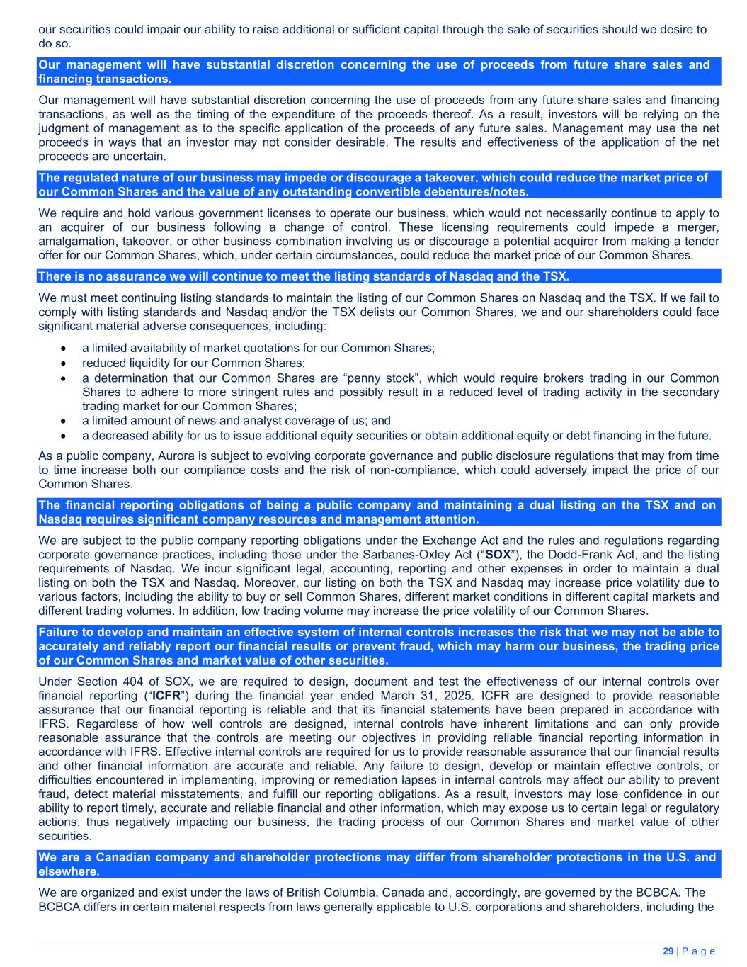 29 | P A G E我们的管理层将对未来股份出售和融资交易所得款项的使用拥有重大酌处权。我们业务的受监管性质可能会阻碍或阻止收购,这可能会降低我们普通股的市场价格和任何未偿还的可转换债券/票据的价值。作为一家上市公司并保持在多伦多证券交易所和纳斯达克双重上市的财务报告义务要求公司资源和管理层给予重大关注。未能制定和维护有效的内部控制系统会增加我们可能无法准确可靠地报告我们的财务业绩或防止欺诈的风险,这可能会损害我们的业务、我们普通股的交易价格和其他证券的市场价值。我们是一家加拿大公司,股东保护可能不同于美国和其他地区的股东保护。如果我们希望这样做,我们的证券可能会削弱我们通过出售证券筹集额外或充足资本的能力。我们的管理层将对未来任何股份出售和融资交易所得款项的用途以及所得款项的支出时间拥有重大酌处权。因此,投资者将依赖管理层对未来任何出售收益的具体应用的判断。管理层可能会以投资者可能认为不可取的方式使用净收益。所得款项净额的运用结果及有效性不确定。我们要求并持有各种政府许可来经营我们的业务,这些许可不一定会在控制权变更后继续适用于我们业务的收购方。这些许可要求可能会阻碍涉及我们的合并、合并、收购或其他业务合并,或阻止潜在收购方对我们的普通股提出要约收购,在某些情况下,这可能会降低我们普通股的市场价格。无法保证我们将继续符合纳斯达克和多伦多证券交易所的上市标准。我们必须满足持续上市标准,才能维持我们的普通股在纳斯达克和多伦多证券交易所的上市。如果我们未能遵守上市标准,而纳斯达克和/或多伦多证券交易所将我们的普通股退市,我们和我们的股东可能会面临重大的不利后果,包括:我们普通股的市场报价有限;我们普通股的流动性减少;确定我们的普通股是“仙股”,这将要求交易我们普通股的经纪商遵守更严格的规则,并可能导致我们普通股的二级交易市场交易活动水平降低;对我们的新闻和分析师报道数量有限;以及我们未来发行额外股本证券或获得额外股权或债务融资的能力下降。作为一家上市公司,Aurora受制于不断变化的公司治理和公开披露法规,这可能会不时增加我们的合规成本和不合规风险,这可能会对我们普通股的价格产生不利影响。我们遵守《交易法》和有关公司治理实践的规则和条例规定的上市公司报告义务,包括《萨班斯-奥克斯利法案》(“SOX”)、《多德-弗兰克法案》以及纳斯达克的上市要求。为了维持在多伦多证券交易所和纳斯达克的双重上市,我们产生了大量的法律、会计、报告和其他费用。此外,我们在多伦多证券交易所和纳斯达克的上市可能会由于各种因素而增加价格波动,包括买卖普通股的能力、不同资本市场的不同市场条件和不同的交易量。此外,低交易量可能会增加我们普通股的价格波动。根据SOX第404节,我们被要求在截至2025年3月31日的财政年度设计、记录和测试我们对财务报告(“ICFR”)的内部控制的有效性。ICFR旨在合理保证我们的财务报告是可靠的,其财务报表是按照国际财务报告准则编制的。无论控制设计得有多好,内部控制都有固有的局限性,只能合理保证这些控制符合我们根据国际财务报告准则提供可靠财务报告信息的目标。我们需要有效的内部控制,以合理保证我们的财务业绩和其他财务信息准确可靠。任何未能设计、开发或维持有效控制,或在实施、改进或补救内部控制失误方面遇到困难,都可能影响我们防止欺诈的能力, 发现重大错报,履行报告义务。因此,投资者可能对我们报告及时、准确和可靠的财务和其他信息的能力失去信心,这可能使我们面临某些法律或监管行动,从而对我们的业务、我们普通股的交易过程和其他证券的市场价值产生负面影响。我们是根据加拿大不列颠哥伦比亚省的法律组织和存在的,因此,受BCBCA管辖。BCBCA在某些重大方面与一般适用于美国公司和股东的法律不同,包括