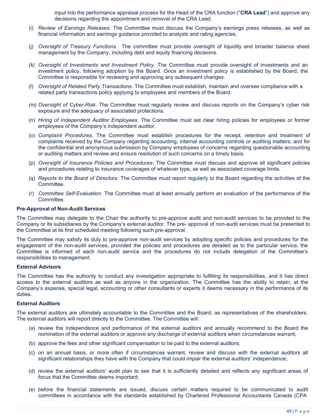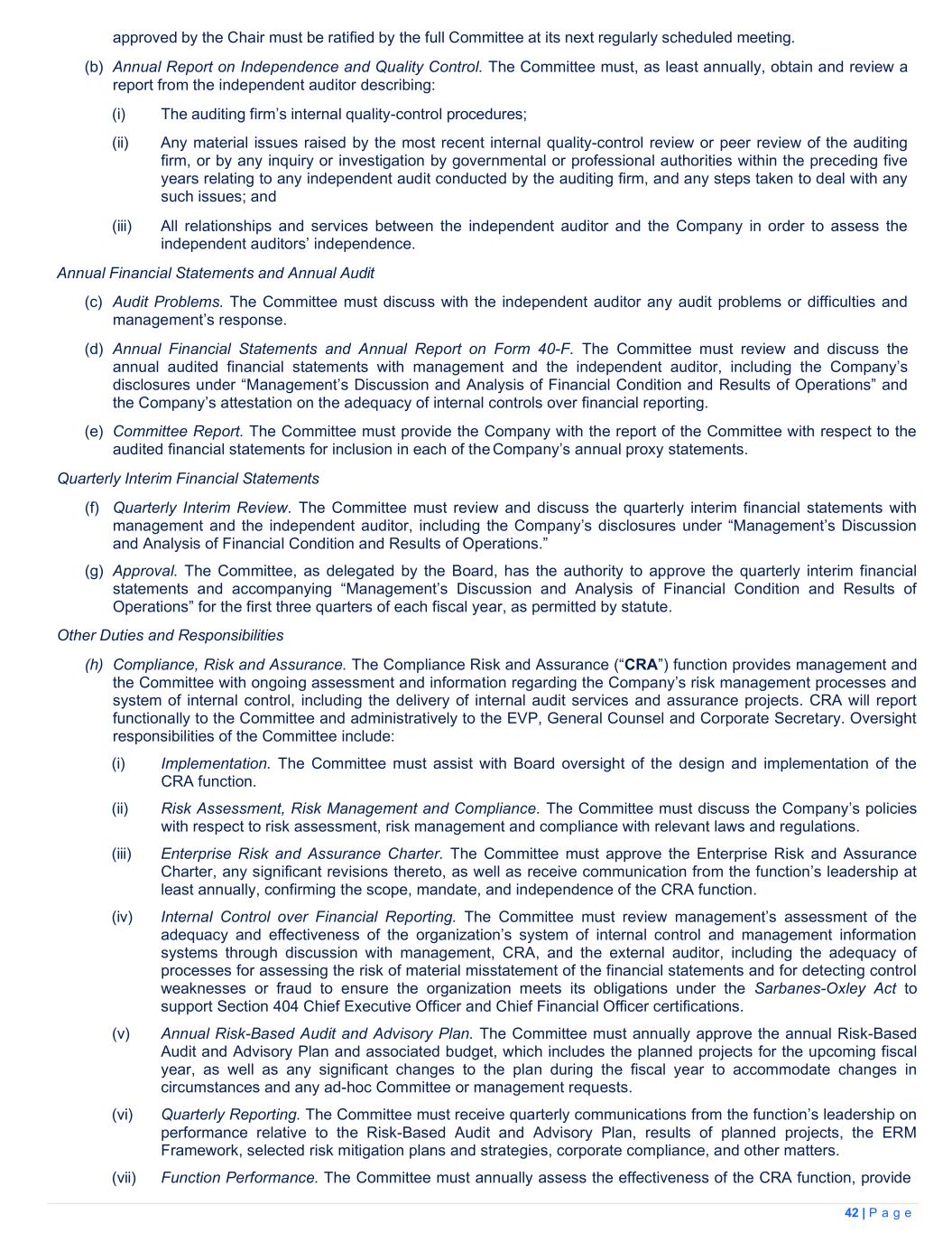 42 |主席批准的P A G E必须在下一次定期会议上得到全体委员会的批准。(b)独立性和质量控制年度报告。委员会必须至少每年从独立审计员那里获得并审查一份报告,说明:(一)审计事务所的内部质量控制程序;(二)最近一次对审计事务所进行的内部质量控制审查或同行审查,或政府或专业当局在过去五年内就审计事务所进行的任何独立审计提出的任何重大问题,以及为处理任何此类问题而采取的任何步骤;(三)独立审计员与公司之间的所有关系和服务,以评估独立审计员的独立性。年度财务报表和年度审计(c)审计问题。委员会必须与独立审计员讨论任何审计问题或困难以及管理层的回应。(d)表格40-F的年度财务报表和年度报告。委员会必须与管理层和独立审计师审查和讨论年度经审计的财务报表,包括公司在“管理层对财务状况和经营成果的讨论和分析”项下的披露,以及公司对财务报告内部控制是否充分的证明。(e)委员会报告。委员会必须向公司提供委员会关于经审计财务报表的报告,以纳入公司的每一份年度代理报表。季度中期财务报表(f)季度中期审查。委员会必须与管理层和独立审计师审查和讨论季度中期财务报表,包括公司在“管理层对财务状况和经营业绩的讨论和分析”下的披露。(g)批准。经董事会授权,委员会有权在法规允许的情况下批准每个财政年度前三个季度的季度中期财务报表和随附的“管理层对财务状况和经营成果的讨论和分析”。其他职责(h)合规、风险和保证。合规风险和保证(“CRA”)职能为管理层和委员会提供有关公司风险管理流程和内部控制系统的持续评估和信息,包括内部审计服务和保证项目的交付。CRA将在职能上向委员会报告,在行政上向执行副总裁、总法律顾问和公司秘书报告。委员会的监督职责包括:(一)执行情况。委员会必须协助董事会监督CRA职能的设计和实施。(二)风险评估、风险管理和合规。委员会必须讨论公司在风险评估、风险管理和遵守相关法律法规方面的政策。(iii)企业风险和保证章程。委员会必须批准《企业风险和保证章程》及其任何重大修订,并至少每年收到该职能领导的信息,确认CRA职能的范围、任务和独立性。(四)财务报告内部控制。委员会必须通过与管理层、CRA和外部审计师的讨论,审查管理层对组织内部控制系统和管理信息系统的充分性和有效性的评估,包括评估财务报表重大错报风险和发现控制弱点或欺诈的流程的充分性,以确保组织履行《萨班斯-奥克斯利法案》规定的支持第404节首席执行官和首席财务官认证的义务。(五)年度基于风险的审计和咨询计划。委员会必须每年批准年度基于风险的审计和咨询计划及相关预算,其中包括下一个财政年度的计划项目,以及该财政年度内计划的任何重大变化,以适应情况变化和任何特设委员会或管理层的要求。(vi)季度报告。委员会必须每季度收到职能领导层关于基于风险的审计和咨询计划、计划中项目的结果、ERM框架、选定的风险缓解计划和战略、公司合规以及其他事项相关绩效的信息通报。(七)功能性能。委员会必须每年评估CRA职能的有效性,提供