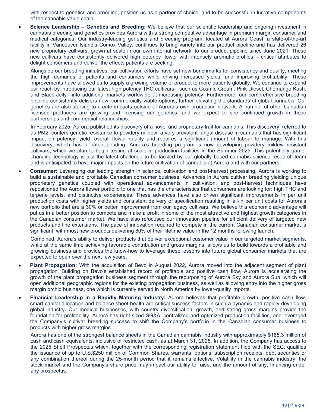 10 | P A G E在遗传和育种方面,将我们定位为首选合作伙伴,并在大麻价值链中利润丰厚的组成部分取得成功。科学领导力–遗传学和育种:我们相信,我们在大麻育种和遗传学方面的科学领导地位和持续投资为Aurora在高利润率的消费和医疗类别中提供了强大的竞争优势。我们位于温哥华岛Comox山谷最先进设施Aurora Coast的行业领先的遗传和育种计划继续为我们的产品管道带来多样性,自2021年6月以来,已向我们的产品管道交付了26个新的专有品种,这些品种是在我们自己的内部网络中大规模种植的。这些新品种始终提供具有强烈芳香特征的高效花卉——这是取悦消费者并提供患者所寻求的效果的关键属性。除了我们的育种举措,我们的种植努力为一致性和质量树立了新的标杆,满足了患者和消费者的高需求,同时推动了产量的提高,并提高了盈利能力。这些改进使我们能够向全球更多患者提供越来越多的产品。我们继续扩大我们的业务范围,将我们最新的高效THC品种——如Cosmic Cream、Pink Diesel、Chemango Kush和Black Jelly ——以越来越高的效力引入全球其他市场。此外,我们全面的育种管道不断提供新的、商业上可行的选择,进一步提高了全球大麻的标准。我们的基因也开始在Aurora自己的生产网络之外产生影响。许多其他加拿大许可生产商正在种植并许可我们的基因,我们预计这些合作伙伴关系和商业关系将继续增长。2025年2月,Aurora公布了其发现的大麻的一种新的专有特性。这一被称为PM2的发现赋予了对白粉病的遗传抗性,白粉病是一种在大麻中非常普遍的真菌疾病,对效力、产量、整体花的质量都有重大影响,并且需要大量的劳动力来管理。有了这项正在申请专利的发现,Aurora的育种计划现在正在开发抗白粉病的品种,我们计划在2025年夏季开始在生产设施中进行大规模测试。这种可能改变游戏规则的技术只是我们全球大麻科学研究团队要应对的最新挑战,预计将对Aurora和我们的合作伙伴未来的大麻种植产生重大影响。Consumer:凭借我们在科学、种植和收获后加工方面的领先实力,Aurora正致力于建立一个可持续和盈利的加拿大消费者业务。Aurora品种育种的进步产生了独特的专有基因,再加上种植方面的运营进步,以及收获后技术已将Aurora花卉组合重新定位为具有消费者正在寻找的特征:高THC和叔烯水平,以及独特的体验。这些进步还推动了单位生产成本的显着改善,产量更高,规格交付一致,导致Aurora新产品组合的单位成本全部增加,比我们的传统品种提高了30%或更好。我们相信,这种经济优势将使我们处于更有利的地位,可以在加拿大消费市场中一些最具吸引力和最高增长的类别中竞争并获利。我们还重新聚焦了我们的创新管道,以高效交付有针对性的新产品和产品线扩展。在当前的加拿大消费市场上竞争所需的创新步伐是显着的,大多数新产品在推出后的12个月内交付了其生命周期价值的80%。结合起来,Aurora能够在我们的目标细分市场提供提供卓越的客户价值的产品,同时实现有利的贡献和毛利率,这使我们能够朝着盈利和不断增长的业务发展,并提供了将这些经验教训用于预计将在未来几年打开的未来全球消费市场的专业知识。植物繁殖:随着2022年8月收购Bevo,Aurora进入植物繁殖的相邻环节。基于Bevo既定的盈利和正现金流记录,Aurora正在通过重新利用Aurora Sky和Aurora Sun加速植物繁殖业务部门的增长,这将为现有的繁殖业务打开更多的地理区域,并允许进入毛利率更高的兰花业务, 一种目前在北美由质量较低的进口产品提供服务。快速成熟行业中的财务领导地位:Aurora认为,在这样一个充满活力且快速发展的全球行业中,盈利增长、正现金流、明智的资本配置和资产负债表健康是关键的成功因素。我们的医疗业务,具有国家多元化、成长性,以及强劲的毛利率为盈利提供了基础。Aurora拥有合适规模的SG & A、集中和优化的生产设施,并利用公司品种育种的成功,将公司在加拿大消费者业务的投资组合转向毛利率更高的产品。截至2025年3月31日,Aurora拥有约1.853亿美元的现金和现金等价物,包括受限制的现金,是加拿大大麻行业中资产负债表最强劲的公司之一。此外,公司还可以获得2025年货架招股说明书,该招股说明书连同向SEC提交的相应注册声明,符合在其仍然有效的25个月期间发行最多2.5亿美元的普通股、认股权证、期权、认购收据、债务证券或其任何组合的资格。大麻行业、股票市场和公司股价的波动可能会影响我们根据任何招股说明书筹集资金的能力以及任何融资的金额。