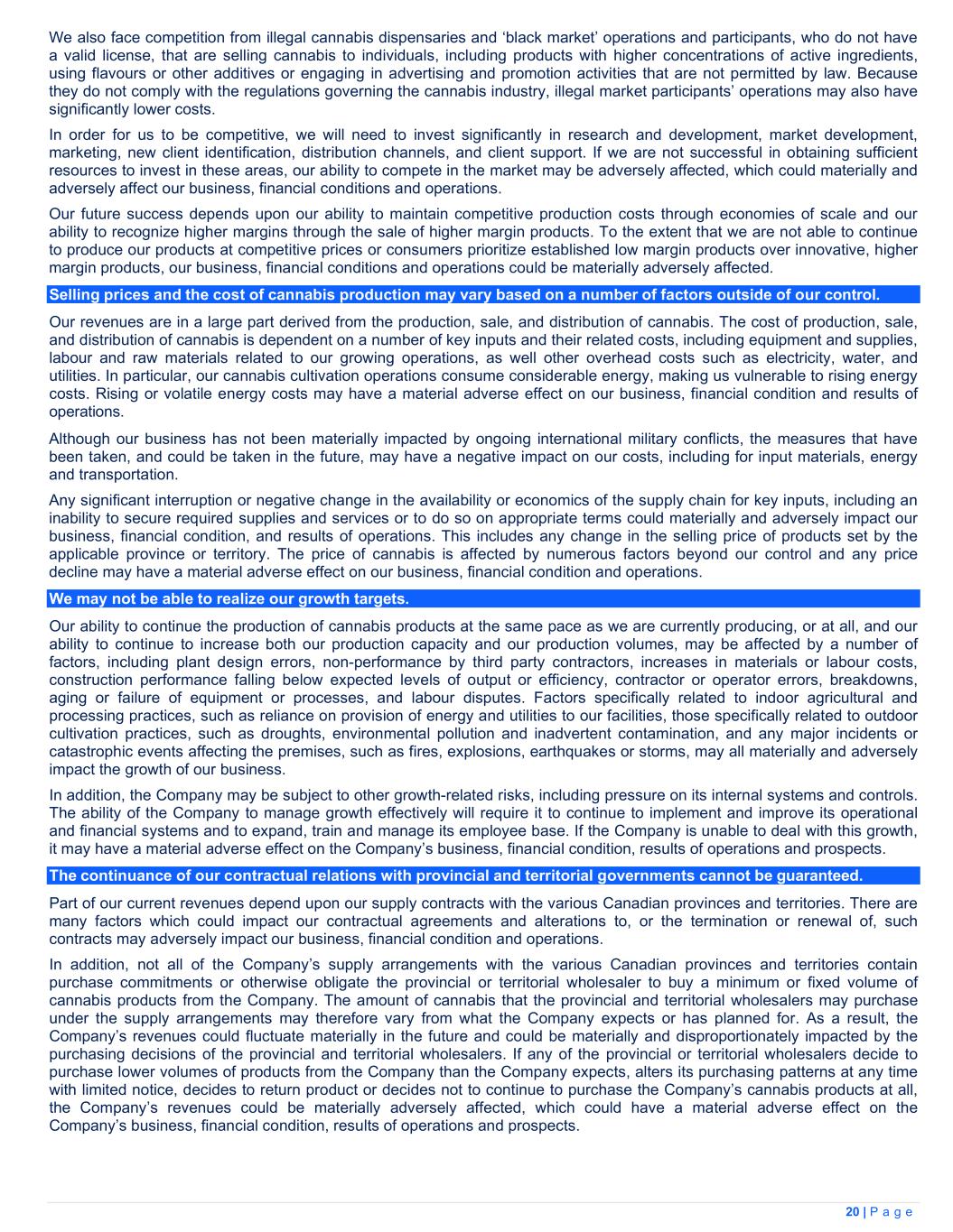 20 | P A G E销售价格和大麻生产成本可能会因我们无法控制的一些因素而有所不同。我们可能无法实现我们的增长目标。我们与省、地区政府的合同关系的延续是不能保证的。我们还面临来自非法大麻药房和‘黑市’操作和参与者的竞争,他们没有有效的许可证,向个人出售大麻,包括活性成分浓度较高的产品,使用香精或其他添加剂,或从事法律不允许的广告和促销活动。由于不遵守大麻行业的监管规定,非法市场参与者的操作也可能具有显着更低的成本。为了使我们具有竞争力,我们将需要在研发、市场开发、市场营销、新客户识别、分销渠道和客户支持方面进行大量投资。如果我们未能成功获得足够的资源在这些领域进行投资,我们在市场上的竞争能力可能会受到不利影响,这可能会对我们的业务、财务状况和运营产生重大不利影响。我们未来的成功取决于我们通过规模经济保持有竞争力的生产成本的能力,以及我们通过销售利润率更高的产品确认更高利润率的能力。如果我们无法继续以具有竞争力的价格生产我们的产品,或者消费者优先考虑既定的低利润率产品而不是创新的、利润率更高的产品,我们的业务、财务状况和运营可能会受到重大不利影响。我们的收入在很大程度上来自大麻的生产、销售和分销。大麻的生产、销售和分销成本取决于许多关键投入及其相关成本,包括与我们不断增长的业务相关的设备和用品、劳动力和原材料,以及其他间接费用,如电力、水和公用事业。特别是,我们的大麻种植业务消耗了相当大的能源,使我们容易受到能源成本上涨的影响。能源成本上升或波动可能对我们的业务、财务状况和经营业绩产生重大不利影响。尽管我们的业务并未受到持续的国际军事冲突的重大影响,但已经采取和未来可能采取的措施可能会对我们的成本产生负面影响,包括投入材料、能源和运输方面的成本。关键投入的供应链可用性或经济性的任何重大中断或负面变化,包括无法获得所需的供应和服务或无法以适当的条件这样做,都可能对我们的业务、财务状况和经营业绩产生重大不利影响。这包括适用省份或地区设定的产品销售价格的任何变化。大麻价格受到我们无法控制的众多因素的影响,任何价格下跌都可能对我们的业务、财务状况和运营产生重大不利影响。我们继续以与目前生产相同的速度生产大麻产品的能力,或根本无法生产,以及我们继续提高产能和产量的能力,可能受到多种因素的影响,包括工厂设计错误、第三方承包商不履约、材料或劳动力成本增加、施工绩效低于预期的产量或效率水平、承包商或操作员错误、故障、设备或工艺的老化或故障以及劳资纠纷。与室内农业和加工实践特别相关的因素,例如依赖向我们的设施提供能源和公用事业,与户外种植实践特别相关的因素,例如干旱、环境污染和无意污染,以及影响场所的任何重大事件或灾难性事件,例如火灾、爆炸、地震或风暴,都可能对我们的业务增长产生重大不利影响。此外,公司可能面临其他与增长相关的风险,包括内部系统和控制方面的压力。公司有效管理增长的能力将要求其继续实施和改善其运营和财务系统,并扩大、培训和管理其员工基础。如果公司无法应对这种增长,可能会对公司的业务、财务状况、经营业绩和前景产生重大不利影响。我们目前的部分收入取决于我们与加拿大各省和地区的供应合同。有许多因素可能会影响我们的合同协议和变更, 或终止或续签,此类合同可能会对我们的业务、财务状况和运营产生不利影响。此外,并非所有公司与加拿大各省和地区的供应安排都包含采购承诺或以其他方式要求省或地区批发商从公司购买最低或固定数量的大麻产品。因此,省和地区批发商根据供应安排可能购买的大麻数量可能与公司的预期或计划有所不同。因此,该公司的收入在未来可能会出现重大波动,并可能受到省和地区批发商的采购决定的重大和不成比例的影响。如果任何省或地区批发商决定从公司购买的产品数量低于公司预期,在有限通知的情况下随时改变其购买模式,决定退货或决定根本不继续购买公司的大麻产品,公司的收入可能会受到重大不利影响,这可能会对公司的业务、财务状况、经营业绩和前景产生重大不利影响。