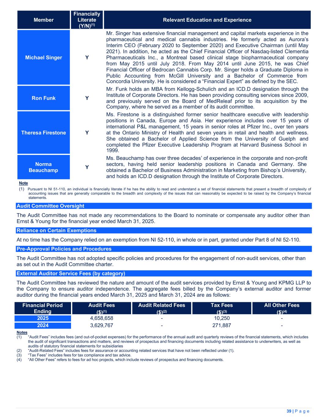 39 | PAG E审计委员会监督依赖某些豁免的预先批准政策和程序外部审计师服务费(按类别)成员财务素养(Y/N)(1)相关教育和经验Michael Singer Y Singer先生在制药和医用大麻行业拥有丰富的财务管理和资本市场经验。他曾担任极光临时CEO(2020年2月至2020年9月)和执行主席(至2021年5月)。此外,他还曾于2015年5月至2018年7月在纳斯达克上市的Clementia Pharmaceuticals Inc.担任首席财务官,该公司是一家位于蒙特利尔的临床阶段生物制药公司。2014年5月至2015年6月,他在Bedrocan Cannabis Corp.担任首席财务官。Singer先生拥有麦吉尔大学公共会计研究生文凭和康考迪亚大学商学学士学位。他被认为是SEC定义的“金融专家”。Ron Funk Y Funk先生拥有Kellogg-Schulich的MBA学位,并通过公司董事协会获得ICD.D称号。他自2009年以来一直提供咨询服务,此前曾在MedReleaf被公司收购之前担任董事会成员,担任审计委员会成员。Theresa Firestone Y Firestone女士是一位杰出的前高级医疗保健主管,曾在加拿大、欧洲和亚洲担任领导职务。她的经验包括超过15年的国际损益管理、15年在辉瑞公司担任高级职务、在安大略省卫生部任职超过十年以及七年的零售和健康与保健工作。她获得圭尔夫大学应用科学学士学位,并于1999年在哈佛商学院完成了辉瑞高管领导力项目。Norma Beauchamp Y Beauchamp女士在企业和非营利部门拥有超过30年的经验,曾在加拿大和德国担任高级领导职务。她获得了Bishop’s University市场营销领域的工商管理学士学位,并通过公司董事协会持有ICD.D称号。注(1)根据NI 51-110,如果个人有能力阅读和理解一组财务报表,这些财务报表呈现的会计问题的复杂性通常与公司财务报表可以合理预期提出的问题的广度和复杂性相当。审计委员会没有向董事会提出任何建议,以提名或补偿截至2025年3月31日止财政年度的除安永会计师事务所以外的任何审计师。公司在任何时候都没有依赖根据NI52-110第8部分授予的NI52-110的全部或部分豁免。除《审计委员会章程》规定的情况外,审计委员会未就聘用非审计服务采取具体政策和程序。审计委员会已审查安永会计师事务所和毕马威会计师事务所向公司提供的审计服务的性质和金额,以确保审计师的独立性。截至2025年3月31日及2024年3月31日止财政年度,公司外聘核数师及前核数师收取的费用总额如下:财政期间期末审计费用(美元)(1)审计相关费用(美元)(2)税费(美元)(3)所有其他费用(美元)(4)20254,658,658-10,250-20243,629,767-271,887-附注(1)“审计费用”包括财务报表年度审计和季度审查的执行费用(以及自付费用),其中包括对重大交易和事项的审计,以及对招股说明书和融资文件的审查,包括对承销商的相关协助,以及子公司法定财务报表审计(2)“审计相关费用”包括未在(1)项下体现的鉴证或会计相关服务费用。(三)“税费”包括税务合规、税务咨询等费用。(4)“所有其他费用”是指专案项目的费用,包括对招股说明书和融资文件的审查。