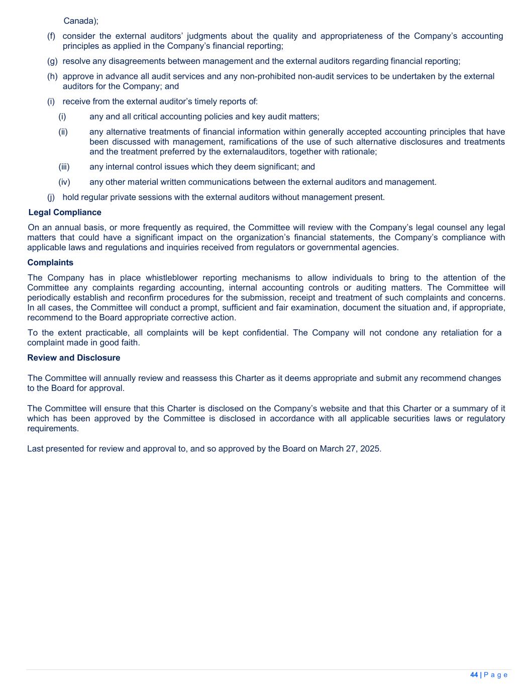 44 | P A G E Canada);(f)考虑外部审计师对公司财务报告中应用的公司会计原则的质量和适当性的判断;(g)解决管理层与外部审计师之间有关财务报告的任何分歧;(h)提前批准外部审计师将为公司提供的所有审计服务和任何非禁止的非审计服务;(i)从外部审计师处及时收到以下方面的报告:(i)任何和所有关键会计政策和关键审计事项;(ii)在公认会计原则范围内对财务信息的任何替代处理已与管理层讨论过的、使用此类替代披露和处理的后果以及外部审计师首选的处理方式,以及理由;(iii)他们认为重要的任何内部控制问题;(iv)外部审计师与管理层之间的任何其他重要书面通信。(j)在管理层不在场的情况下与外聘审计员定期举行非公开会议。法律合规情况委员会将每年或根据要求更频繁地与公司法律顾问一起审查可能对组织财务报表、公司遵守适用法律法规的情况以及从监管机构或政府机构收到的询问产生重大影响的任何法律事项。投诉公司已建立举报人举报机制,允许个人将有关会计、内部会计控制或审计事项的任何投诉提请委员会注意。委员会将定期建立并重新确认提交、接收和处理此类投诉和关切事项的程序。在所有情况下,委员会都将进行迅速、充分和公平的审查,记录情况,并酌情向审计委员会建议适当的纠正行动。在切实可行范围内,所有投诉将予保密。对于善意提出的投诉,公司不会纵容任何报复行为。审查和披露委员会将每年审查和重新评估其认为适当的《宪章》,并将任何建议的修改提交理事会批准。委员会将确保在公司网站上披露本章程,并确保根据所有适用的证券法或监管要求披露本章程或经委员会批准的章程摘要。最后提交审议批准,并于2025年3月27日获得董事会批准。