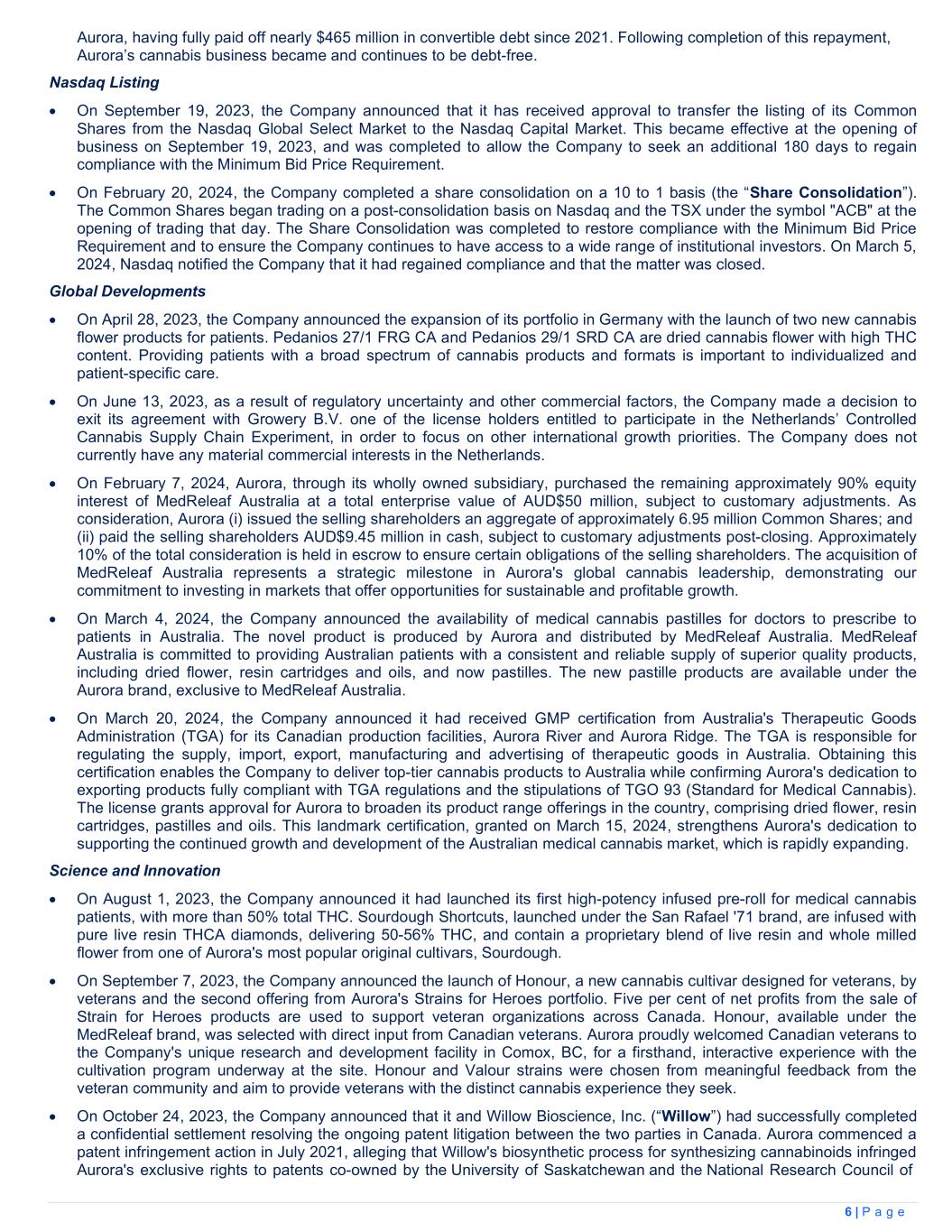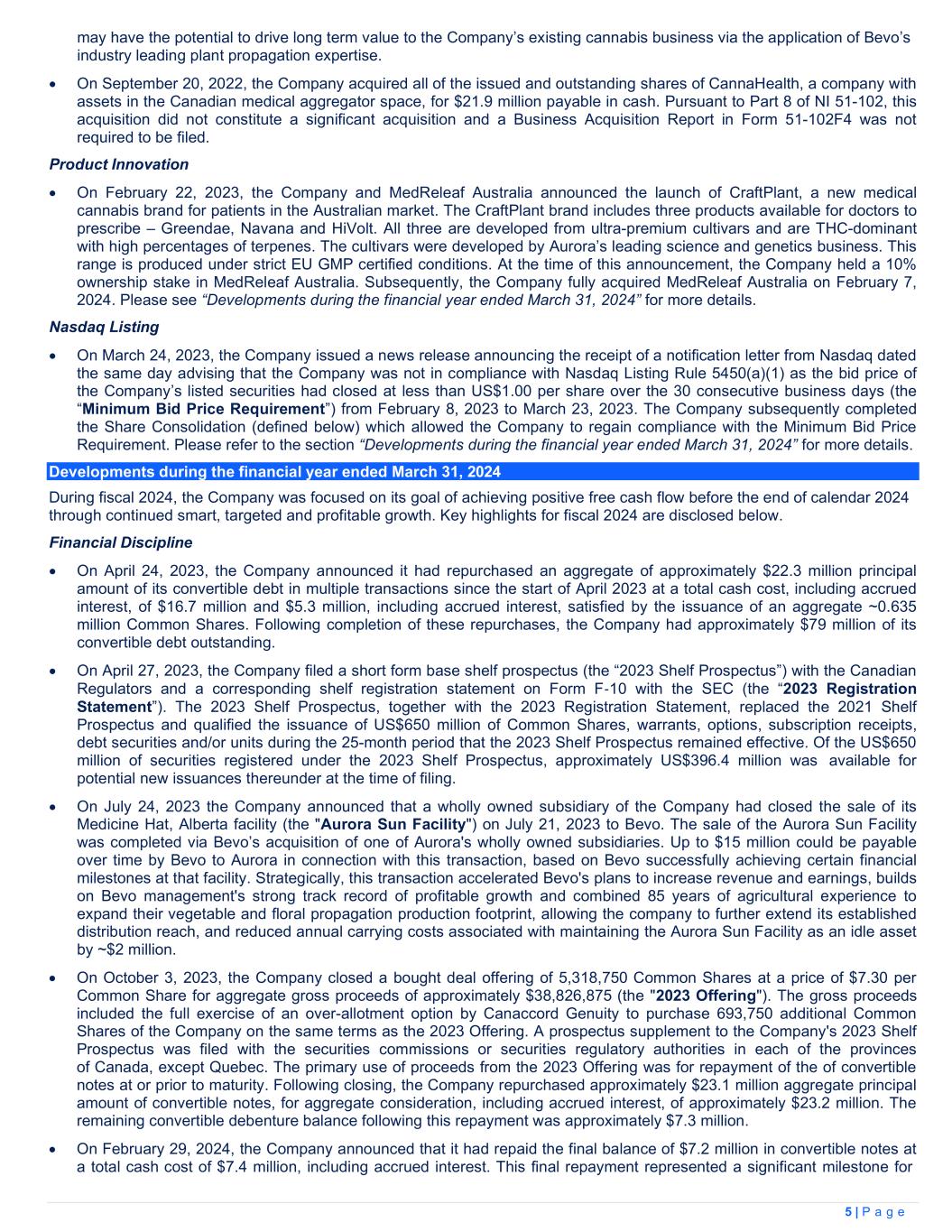 5 |通过应用Bevo行业领先的植物繁殖专业知识,P A G E可能有潜力为公司现有的大麻业务带来长期价值。2022年9月20日,公司以现金支付的2190万美元收购了CannaHealth的所有已发行流通股,CannaHealth是一家在加拿大医疗聚合领域拥有资产的公司。根据NI 51-102第8部分,此次收购不构成重大收购,无需提交51-102F4表格中的业务收购报告。产品创新2023年2月22日,公司与MedReleaf Australia宣布推出面向澳大利亚市场患者的全新医用大麻品牌CraftPlant。CraftPlant品牌包括三种可供医生开处方的产品—— Greendae、Navana和HiVolt。这三种都是从超优质品种发展而来的,并且是THC显性的,蝶烯的百分比很高。这些品种是由Aurora领先的科学和遗传学业务开发的。该系列是在严格的欧盟GMP认证条件下生产的。在本公告发布时,公司持有MedReleaf Australia 10%的所有权股权。随后,公司于2024年2月7日全面收购MedReleaf Australia。更多详情请见“截至2024年3月31日止财政年度的发展”。于2023年3月24日在纳斯达克上市,公司发布新闻稿,宣布收到纳斯达克于同日发出的通知函,告知由于公司上市证券的买入价在2023年2月8日至2023年3月23日期间的连续30个营业日内(“最低买入价要求”)的收盘价低于每股1.00美元,因此公司不符合《纳斯达克上市规则》第5450(a)(1)条的规定。公司随后完成了股份合并(定义见下文),这使公司得以重新遵守最低投标价格要求。详情请参阅「截至2024年3月31日止财政年度的发展」一节。截至2024年3月31日财政年度的发展情况在2024财政年度,公司专注于其目标,即通过持续的智能、有针对性的盈利增长,在2024年日历年底之前实现正的自由现金流。2024财年的主要亮点披露如下。财务纪律2023年4月24日,该公司宣布,自2023年4月开始以来,已在多笔交易中回购了本金总额约为2230万美元的可转换债券,总现金成本(包括应计利息)为1670万美元,包括应计利息在内的530万美元,通过发行总计约63.5万股普通股来满足。在完成这些回购后,该公司有大约7900万美元的可转换债务未偿还。2023年4月27日,公司向加拿大监管机构提交了简式基本货架招股说明书(“2023年货架招股说明书”),并向SEC提交了F-10表格的相应货架注册声明(“2023年注册声明”)。2023年储架招股章程连同2023年注册声明,取代了2021年储架招股章程,并在2023年储架招股章程保持有效的25个月期间,对发行6.5亿美元的普通股、认股权证、期权、认购收据、债务证券和/或单位进行了限定。在2023年货架招股说明书下登记的6.5亿美元证券中,截至提交时,约有3.964亿美元可用于根据该招股说明书进行的潜在新发行。2023年7月24日,公司宣布,公司全资附属公司已于2023年7月21日完成向Bevo出售其位于艾伯塔省梅迪辛哈特的设施(“Aurora Sun设施”)。Aurora Sun设施的出售是通过Bevo收购Aurora的全资子公司之一完成的。根据Bevo在该设施成功实现某些财务里程碑的情况,随着时间的推移,Bevo可能会就此次交易向Aurora支付高达1500万美元的款项。从战略上讲,这笔交易加速了Bevo增加收入和收益的计划,建立在Bevo管理层盈利增长的强劲记录之上,并结合85年的农业经验扩大了他们的蔬菜和花卉繁殖生产足迹,使该公司能够进一步扩展其既定的分销范围,并将与将Aurora Sun设施作为闲置资产进行维护相关的年度持有成本降低了约200万美元。2023年10月3日, 该公司以每股普通股7.30美元的价格完成了531.875万股普通股的买入交易发行,总收益约为38,826,875美元(“2023年发行”)。所得款项总额包括Canaccord Genuity全额行使超额配股权,以按照与2023年发售相同的条款购买公司693,750股额外普通股。向加拿大各省(魁北克省除外)证券委员会或证券监管机构提交了公司2023年货架招股说明书的招股说明书补充文件。2023年发售所得款项的主要用途是在到期时或之前偿还可换股票据。收盘后,该公司回购了本金总额约为2310万美元的可转换票据,总对价(包括应计利息)约为2320万美元。此次偿还后剩余的可转换债券余额约为730万美元。2024年2月29日,公司宣布已偿还最终余额720万美元的可转换票据,总现金成本为740万美元,包括应计利息。这笔最后还款代表了一个重要的里程碑