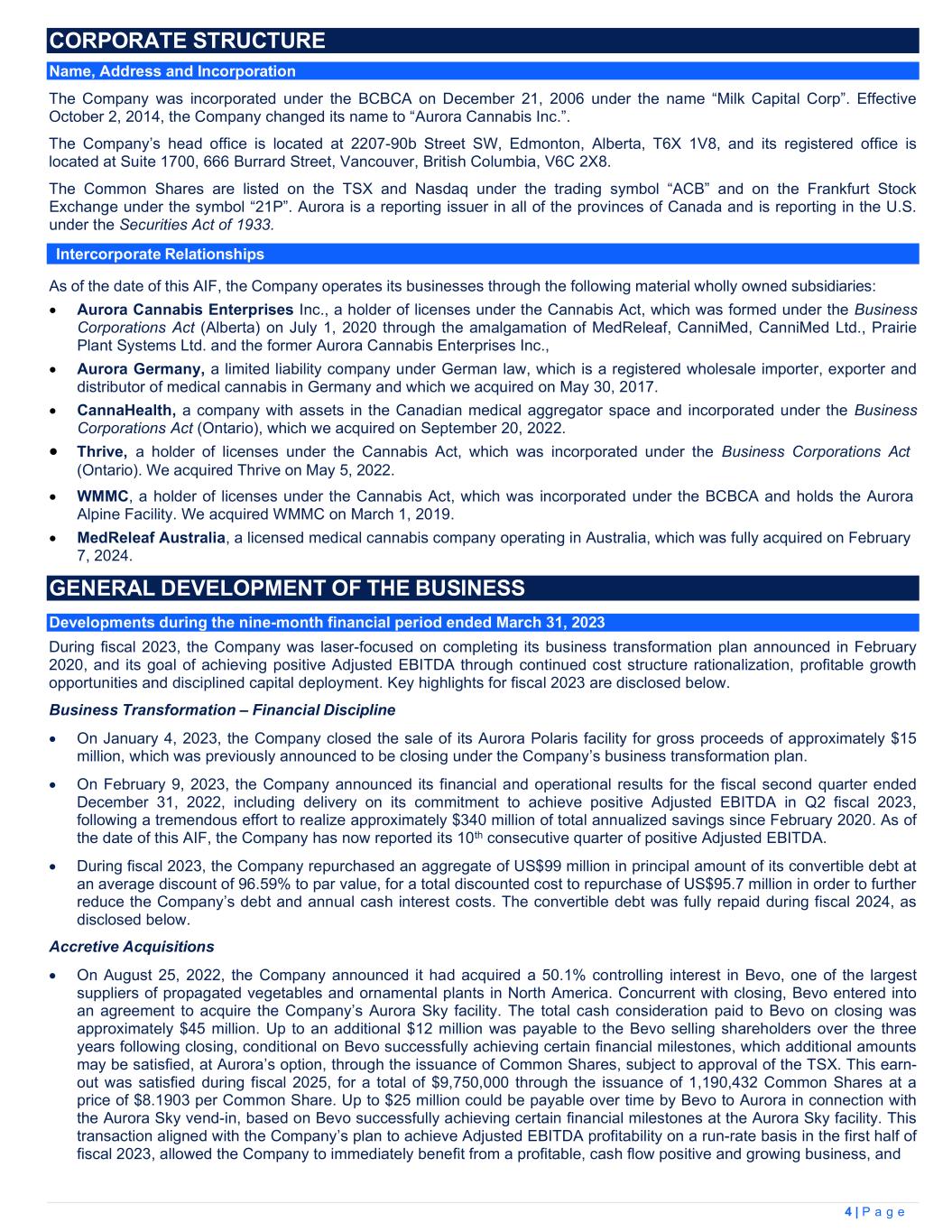 4 | P A G E名称、地址和公司间关系截至2023年3月31日止九个月财政期间业务发展的一般发展公司于2006年12月21日根据BCBCA注册成立,名称为“Milk Capital Corp”。自2014年10月2日起,公司更名为“Aurora Cannabis Inc.”。公司总部位于2207-90b Street SW,Edmonton,Alberta,T6X 1V8,注册办事处位于Suite 1700,666 Burrard Street,Vancouver,British Columbia,V6C 2X8。这些普通股在多伦多证券交易所和纳斯达克上市,交易代码为“ACB”,在法兰克福证券交易所上市,交易代码为“21P”。Aurora是加拿大所有省份的报告发行人,根据1933年《证券法》在美国进行报告。截至本次AIF之日,公司通过以下材料全资子公司经营业务:Aurora Cannabis Cannabis Enterprises Inc.,一家根据《大麻法》持有许可证的公司,该公司于2020年7月1日根据《商业公司法》(艾伯塔省)通过MedReleaf、CanniMed、CanniMed Ltd.、Prairie Plant Systems Ltd.和原德国法律下的有限责任公司Aurora Cannabis Aurora Cannabis Enterprises Inc.合并而成,Aurora Germany是一家在德国注册的医用大麻批发进口商、出口商和分销商,我们于2017年5月30日收购了该公司。CannaHealth,一家在加拿大医疗聚合器领域拥有资产并根据《商业公司法》(安大略省)注册成立的公司,我们于2022年9月20日收购了该公司。Thrive,根据《大麻法》持有许可证,根据《商业公司法》(安大略省)注册成立。我们于2022年5月5日收购了Thrive。WMMC,根据《大麻法》持有许可证,根据BCBCA注册成立,持有Aurora Alpine设施。我们在2019年3月1日收购了WMMC。MedReleaf Australia,一家在澳大利亚经营的持牌医用大麻公司,于2024年2月7日被完全收购。2023财年,公司专注于完成2020年2月宣布的业务转型计划,通过持续的成本结构合理化、盈利增长机会和有纪律的资本部署,实现调整后EBITDA为正的目标。2023财年的主要亮点披露如下。业务转型–财务纪律2023年1月4日,公司完成了其Aurora Polaris设施的出售,总收益约为1500万美元,此前宣布将根据公司的业务转型计划完成出售。2023年2月9日,公司公布了截至2022年12月31日的第二财季的财务和运营业绩,其中包括兑现其在2023财年第二季度实现正的调整后EBITDA的承诺,此前该公司付出了巨大努力,自2020年2月以来实现了约3.4亿美元的年化总节余。截至本次AIF之日,该公司现已连续第10个季度报告调整后EBITDA为正。2023财年期间,公司以较面值平均折价96.59%的价格回购了本金总额为9900万美元的可转换债券,回购总贴现成本为9570万美元,以进一步降低公司的债务和年度现金利息成本。可转换债券已在2024财年全部偿还,如下文所披露。Accretive Acquisitions 2022年8月25日,公司宣布收购Bevo 50.1%的控股权,Bevo是北美最大的繁殖蔬菜和观赏植物供应商之一。在关闭的同时,Bevo签订了一项协议,以收购该公司的Aurora Sky设施。交割时支付给Bevo的总现金对价约为4500万美元。在交易完成后的三年内,向Bevo出售股东支付了高达1200万美元的额外款项,条件是Bevo成功实现了某些财务里程碑,Aurora可以选择通过发行普通股来支付额外金额,但须经TSX批准。这一收益在2025财年期间得到满足,通过以每股普通股8.1903美元的价格发行1,190,432股普通股,总额为9,750,000美元。基于Bevo在Aurora Sky设施成功实现某些财务里程碑,Bevo可能会随着时间的推移向Aurora支付与Aurora Sky出售相关的高达2500万美元。这项交易符合公司在2023财年上半年实现按运行率计算的调整后EBITDA盈利能力的计划,使公司能够立即受益于盈利、现金流为正且不断增长的业务,以及公司结构