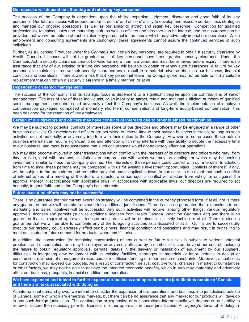 23 | P A G E对高级管理人员的依赖我们的某些董事和高级管理人员可能因其他业务关系而产生利益冲突。未来的执行努力可能不会成功。我们已经并打算进一步将我们的业务和运营扩展到加拿大以外的司法管辖区,这样做存在相关风险。公司的成功取决于关键人员的能力、专业知识、判断力、酌处权和诚意。我们未来的成功将取决于我们的董事和高级管理人员制定和执行我们的业务战略以及管理我们正在进行的运营的能力,以及我们吸引和留住关键人员的能力。对合格专业人员、技术、销售和营销人员以及管理人员和董事的竞争可能非常激烈,无法保证我们将能够在未来吸引或留住关键人员,这可能会对我们的运营产生不利影响。虽然就业和咨询协议是惯例,但这些协议无法保证这些个人的持续服务。此外,作为《大麻法》下的持牌生产商,某些关键人员必须获得加拿大卫生部的安全许可。在所有关键人员获得安全许可之前,不会发放许可证。根据《大麻法》,安全许可的有效期不能超过五年,必须在到期前续签。无法保证我们现有或未来的任何关键人员将能够获得或更新此类许可。关键人员未能维持或更新其安全许可可能会对我们的业务、财务状况和运营造成重大不利影响。还有一种风险是,如果关键人员离开公司,我们可能找不到合适的替代者,能够及时获得安全许可,或者根本找不到。公司的成功及其战略重点在很大程度上取决于高级管理层的贡献。任何这些人的流失,或无法吸引、留住和激励足够数量的合格高级管理人员,都可能对公司的业务产生不利影响。此外,还为关键员工的留用设计了由货币短期薪酬和长期股权薪酬组成的员工薪酬包。由于我们的一些董事和高级职员可能从事一系列其他业务活动,我们可能会受到潜在利益冲突的影响。我们的董事和高级管理人员被允许将时间用于他们的外部商业利益,只要此类活动不会对他们对公司的职责产生重大或不利的干扰。然而,在某些情况下,这些外部商业利益可能需要大量时间和注意力,这可能会干扰他们将必要时间投入我们业务的能力,并且无法保证此类事件不会对我们的运营产生不利影响。我们还可能参与与其董事和高级管理人员的利益相冲突的其他交易,这些董事和高级管理人员可能会不时与我们可能正在与之交易的个人、机构或公司打交道,或者可能正在寻求与公司所希望的类似的投资。这些人的利益可能与我们的利益发生冲突。此外,这些人可能不时与我们竞争可用的投资机会。如果存在任何利益冲突,将受制于适用法律规定的程序和补救措施。特别是,如果在董事会会议上出现此种利益冲突,根据适用法律,有此种冲突的董事将放弃投票赞成或反对批准。根据适用的法律,我们的董事必须诚实、诚实并符合公司的最佳利益。无法保证我们目前的执行策略将以目前提议的形式完成,如果有的话,也无法保证我们将能够扩展到更多的司法管辖区。也无法保证我们的营销和销售计划的扩展将会成功。除其他外,任何此类活动都需要各种监管批准、许可证和许可(例如根据《大麻法》获得加拿大卫生部的额外许可证),并且无法保证及时或完全获得所有所需的批准、许可证和许可。也无法保证我们将能够按预期或完全完成上述任何活动。我们未能成功执行我们的战略可能会对我们的业务、财务状况和运营产生不利影响,并可能导致我们无法满足对产品的预期或未来需求,如果它出现的话。此外, 任何当前或未来设施的建设(或剩余建设)受到各种潜在问题和不确定性的影响,并可能受到我们无法控制的若干因素的延迟或不利影响,包括未能获得监管批准、许可、我们的供应商延迟交付或安装设备、难以将新设备与其现有设施整合、材料或劳动力短缺、设计或建设缺陷、管理资源被转移或资金不足或其他资源限制。而且,建设的实际成本可能会超出我们的预算。由于施工延误、成本超支、市场环境变化或其他因素,我们可能无法实现预期的经济利益,进而可能对我们的业务、前景、财务状况和运营产生重大不利影响。随着国际需求的增长,我们打算考虑将我们的业务和业务扩展到加拿大以外的司法管辖区,其中一些是新兴市场,但无法保证我们产品的任何市场将在任何此类外国司法管辖区发展。我们在国际上的业务的继续或扩展将取决于我们在这些司法管辖区更新或获得必要许可、执照或其他批准的能力。一家机构是否否认或推迟我们的成功将取决于吸引和留住关键人员。
