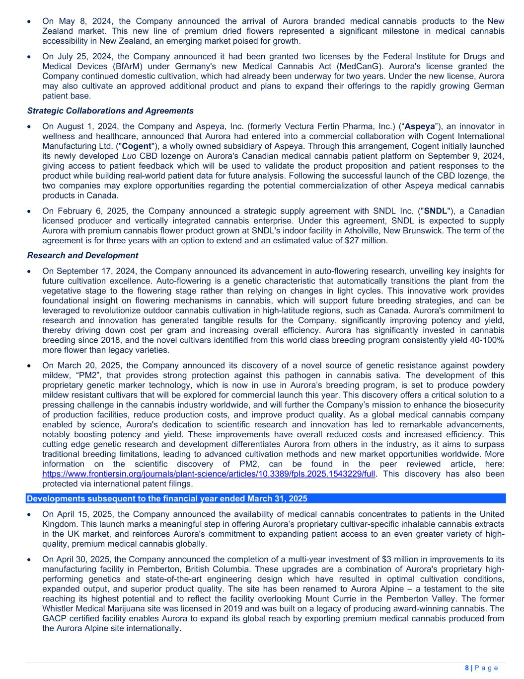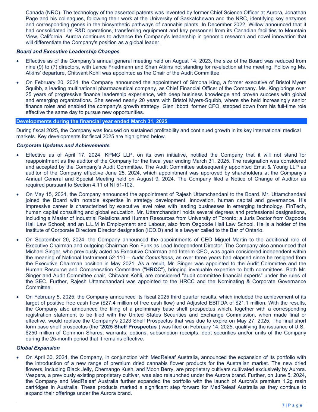 7 | P A G E加拿大(NRC)。所声称的专利的技术是由Aurora的前首席科学官Jonathan Page和他的同事发明的,跟随他们在萨斯喀彻温大学和NRC的工作,确定了大麻植物生物合成途径中的关键酶和相应基因。2022年12月,Willow宣布整合其研发业务,将设备和关键人员从其加拿大工厂转移到加利福尼亚州山景城。Aurora继续推进公司在基因组研究和新颖创新方面的领导地位,这将使公司作为全球领导者的地位与众不同。董事会和执行领导层变动自公司于2023年8月14日举行的年度股东大会起生效,董事会人数从九(9)名减少至(7)名董事,Lance Friedmann和Shan Atkins不能在会上竞选连任。Atkins女士离职后,Chitwant Kohli被任命为审计委员会主席。2024年2月20日,公司宣布任命跨国制药龙头企业百时美施贵宝的前高管Simona King为公司首席财务官。King女士拥有超过25年的进步财务领导经验,拥有深厚的业务知识,并在全球和新兴组织中证明了成功。她在百时美施贵宝服务了近20年,在那里她担任了越来越高级的财务职务,并促成了公司的增长战略。前首席财务官格伦·伊博特(Glen Ibbott)辞去全职职务,同日生效,以寻求新的机会。截至2025年3月31日财政年度的发展情况在2025财年,公司专注于持续盈利能力和在主要国际医疗市场的持续增长。下文重点介绍了2025财年的主要发展情况。公司更新和成就自2024年4月17日起生效,毕马威会计师事务所主动通知公司,其将不会再次被任命为公司截至2025年3月31日止财政年度的审计师。该辞呈已获公司审核委员会审议及接纳。审计委员会随后任命安永会计师事务所为公司审计师,自2024年6月25日起生效,该任命已在公司于2024年8月9日举行的年度股东大会和特别会议上获得股东批准。公司根据NI 51-102第4.11节的要求提交了变更审计师的通知。2024年5月15日,公司宣布任命Rajesh UttamChandani为董事会成员。UttamChandani先生以在战略制定、创新、人力资本和治理方面的显着专长加入董事会。他令人印象深刻的职业生涯的特点是在新兴技术、金融科技、人力资本咨询和全球教育领域的领先企业担任高管级职务。UttamChandani先生拥有多个学位和专业称号,包括多伦多大学的劳资关系和人力资源硕士;奥斯古德霍尔法学院的法学博士;以及同样来自奥斯古德霍尔法学院的就业和劳工法学硕士。他是公司董事协会董事指定(ICD.D)的持有人,并且是安大略省律师协会的律师。2024年9月20日,公司宣布任命首席执行官Miguel Martin担任执行主席和即将离任的董事长Ron Funk担任首席独立董事。该公司还宣布,此前担任执行主席兼临时首席执行官的Michael Singer再次被认为是National Instrument 52-110 –审计委员会所指的独立人士,因为他自2021年5月辞去执行主席一职以来已经过去了三年多。因此,辛格先生被任命为审计委员会和人力资源与薪酬委员会(“HRCC”)的成员,为这两个委员会带来了宝贵的专业知识。根据SEC的规定,Singer先生和审计委员会主席Chitwant Kohli都被视为“审计委员会财务专家”。此外,Rajesh UttamChandani被任命为HRCC和提名与公司治理委员会成员。2025年2月5日,公司公布了2025财年第三季度业绩,其中包括实现了正的自由现金流(2740万美元的自由现金流)和2110万美元的调整后EBITDA的目标。有了这一结果,该公司还宣布提交一份初步的基本货架招股说明书,该招股说明书连同一份将向美国证券交易委员会提交的相应注册声明,一旦最终确定或生效,将取代公司原定于2025年5月27日到期的2023年货架招股说明书。最终简式基架招股说明书(“2025-SHEF招股说明书”)于2025年2月14日备案, 合格发行2.5亿美元的普通股、认股权证、期权、认购收据、债务证券和/或在其保持有效的25个月期间内的公司单位。全球扩张2024年4月30日,该公司与MedReleaf Australia宣布扩大其产品组合,为澳大利亚市场推出一系列新的优质干大麻花产品。新的干花,包括黑果冻、Chemango Kush、Moon Berry,是Aurora独家培育的专有品种。Vespera,以前已有的专利品种,也以Aurora品牌重新推出。此外,2024年6月5日,公司和MedReleaf Australia进一步扩大了产品组合,在澳大利亚推出了Aurora的优质1.2g树脂墨盒。这些产品标志着MedReleaf Australia向前迈出了重要的一步,因为它们继续以Aurora品牌扩展其产品。