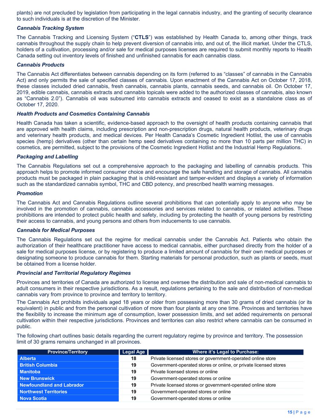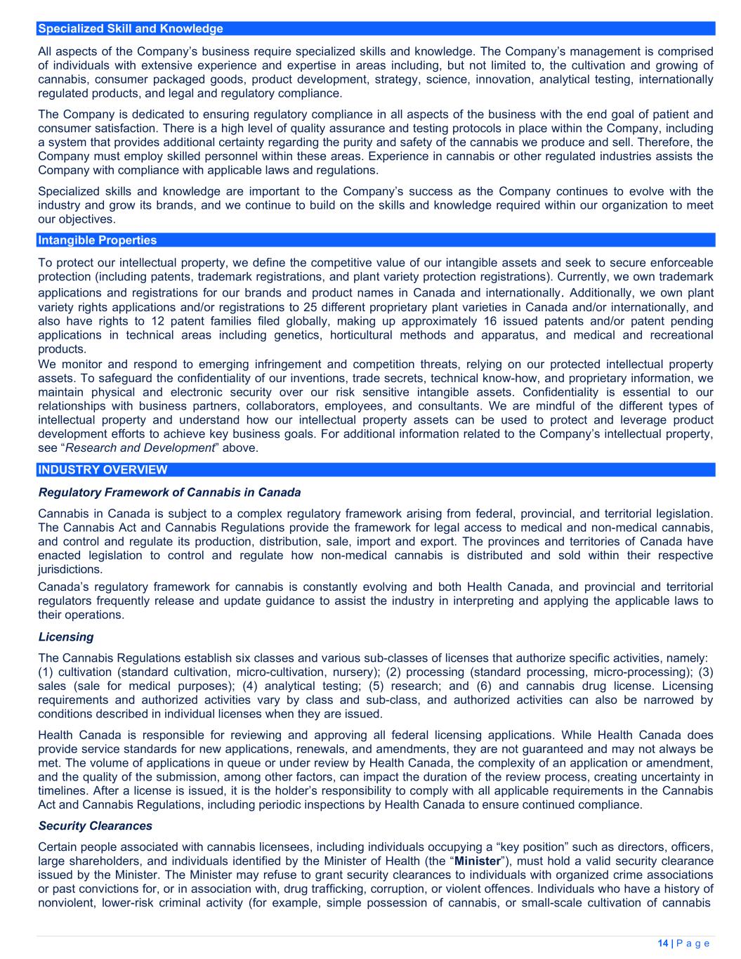 14 | P A G E无形资产行业概览公司业务的各个方面都需要专门的技能和知识。公司管理层由在包括但不限于大麻种植和种植、包装消费品、产品开发、战略、科学、创新、分析测试、国际监管产品以及法律和监管合规等领域拥有丰富经验和专业知识的个人组成。公司致力于确保业务各个方面的监管合规,最终目标是患者和消费者满意。公司内部有高水平的质量保证和测试协议,包括提供关于我们生产和销售的大麻的纯度和安全性的额外确定性的系统。因此,公司必须在这些领域内聘用技术人员。在大麻或其他受监管行业的经验有助于公司遵守适用的法律法规。随着公司继续与行业一起发展并发展其品牌,专业技能和知识对公司的成功非常重要,我们将继续利用组织内所需的技能和知识来实现我们的目标。为了保护我们的知识产权,我们定义了我们无形资产的竞争价值,并寻求获得可强制执行的保护(包括专利、商标注册和植物品种保护注册)。目前,我们在加拿大和国际上拥有我们的品牌和产品名称的商标申请和注册。此外,我们在加拿大和/或国际上拥有25个不同专利植物品种的植物品种权申请和/或注册,还拥有全球提交的12个专利族的权利,包括在包括遗传学、园艺方法和仪器以及医疗和娱乐产品在内的技术领域的约16项已发布的专利和/或正在申请的专利。我们监控和应对新出现的侵权和竞争威胁,依靠我们受保护的知识产权资产。为保护我们的发明、商业秘密、技术诀窍和专有信息的机密性,我们维护对风险敏感的无形资产的物理和电子安全。保密对于我们与商业伙伴、合作者、员工和顾问的关系至关重要。我们关注不同类型的知识产权,并了解如何利用我们的知识产权资产来保护和利用产品开发努力来实现关键业务目标。有关公司知识产权的更多信息,请参见上文“研发”。加拿大大麻监管框架加拿大大麻受制于联邦、省和地区立法产生的复杂监管框架。《大麻法》和《大麻条例》为合法获得医用和非医用大麻提供了框架,并对其生产、分销、销售、进出口进行了控制和监管。加拿大各省和地区已颁布立法,以控制和规范非医用大麻在各自管辖范围内的分配和销售方式。加拿大对大麻的监管框架不断发展,加拿大卫生部、省和地区监管机构都经常发布和更新指南,以协助该行业解释适用法律并将其应用于其运营。许可《大麻条例》确立了授权特定活动的六个类别和各种子类别的许可,即:(1)种植(标准种植、微型种植、苗圃);(2)加工(标准加工、微型加工);(3)销售(医疗用途销售);(4)分析测试;(5)研究;(6)和大麻药物许可。许可要求和授权活动因类别和子类别而异,授权活动也可以通过发放时个别许可中描述的条件来缩小范围。加拿大卫生部负责审查和批准所有联邦许可申请。虽然加拿大卫生部确实为新申请、续展和修订提供了服务标准,但这些标准并不能得到保证,也不一定总能得到满足。加拿大卫生部排队或正在审查的申请数量、申请或修改的复杂性以及提交的质量等因素可能会影响审查过程的持续时间,从而造成时间安排的不确定性。颁发许可证后,持有者有责任遵守《大麻法》和《大麻条例》中的所有适用要求,包括加拿大卫生部的定期检查,以确保持续遵守。安全许可某些与大麻许可证持有人有关联的人, 包括董事、高级管理人员、大股东等占据“关键位置”的个人,以及卫生部部长(“部长”)认定的个人,必须持有部长签发的有效安全许可。部长可以拒绝向有组织犯罪协会或过去因贩毒、腐败或暴力犯罪而被定罪或与之有关联的个人授予安全许可。有非暴力、较低风险犯罪活动史的个人(例如,简单拥有大麻,或小规模种植大麻专业技能和知识