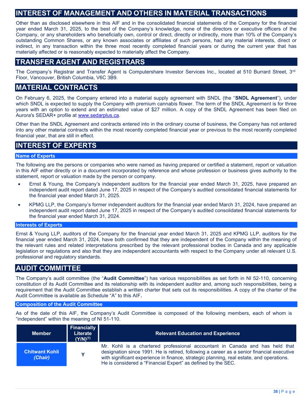 38 | P A G E转让代理人和注册官的重要合同专家的权益专家名称专家的权益审计委员会的组成除本AIF其他地方及公司截至2025年3月31日止财政年度的综合财务报表所披露的情况外,据公司所知,公司的任何董事或执行人员,或任何直接或间接实益拥有、控制或直接指挥公司已发行普通股超过10%的股东,或该等人士的任何已知联系人或联属公司,在最近完成的三个财政年度内或本年度内已对公司产生重大影响或合理预期将对公司产生重大影响的任何交易中拥有任何直接或间接的重大权益。该公司的注册商和转让代理是Computershare Investor Services Inc.,地址为510 Burrard Street,3rd Floor,Vancouver,British Columbia,V6C 3B9。于2025年2月6日,公司与SNDL订立材料供应协议(“SNDL协议”),据此,SNDL预期将向公司供应优质大麻花。该SNDL协议的期限为三年,并附有延期选择权,估计价值为2700万美元。SNDL协议的副本已在Aurora的SEDAR +个人资料上存档,网址为www.sedarplus.ca。除SNDL协议及于日常业务过程中订立的合约外,公司并无在最近完成的财政年度内或在最近完成的财政年度之前订立任何其他仍然有效的重大合约。以下是被指名为已在本AIF中直接或在以引用方式并入的文件中编制或认证报表、报告或估值的个人或公司,其专业或业务授权该个人或公司作出的报表、报告或估值。公司截至2025年3月31日止财政年度的独立核数师安永会计师事务所就公司截至2025年3月31日止财政年度的经审核综合财务报表编制了日期为2025年6月17日的独立审计报告。毕马威会计师事务所(KPMG LLP)是公司截至2024年3月31日止财政年度的前独立核数师,已就公司截至2024年3月31日止财政年度的经审核综合财务报表编制日期为2025年6月17日的独立审计报告。公司截至2025年3月31日止财政年度的核数师Ernst & Young LLP及截至2024年3月31日止财政年度的核数师KPMG LLP均已确认,根据加拿大相关专业机构及任何适用法例或规例所订明的相关规则及相关解释,彼等均独立于公司,且彼等亦为所有相关美国专业及监管准则下有关公司的独立会计师。公司的审计委员会(“审计委员会”)具有NI 52-110中规定的各种职责,涉及其审计委员会的组成及其与独立审计师的关系,并且在这些职责中,要求审计委员会建立一份载列其职责的书面章程。审计委员会章程副本可作为本AIF的附表“A”查阅。截至本次AIF召开之日,公司的审计委员会由以下成员组成,每位成员均为NI 51-110所指的“独立”成员。Member Financial Literate(Y/N)(1)相关教育和经验Chitwant Kohli(主席)Y Kohli先生是加拿大的一名特许专业会计师,自1991年以来一直担任该职务。他已退休,此前的职业生涯是高级财务主管,在财务、战略规划、房地产和运营方面拥有丰富的经验。他被认为是SEC定义的“金融专家”。管理层和其他人对重大交易的兴趣
