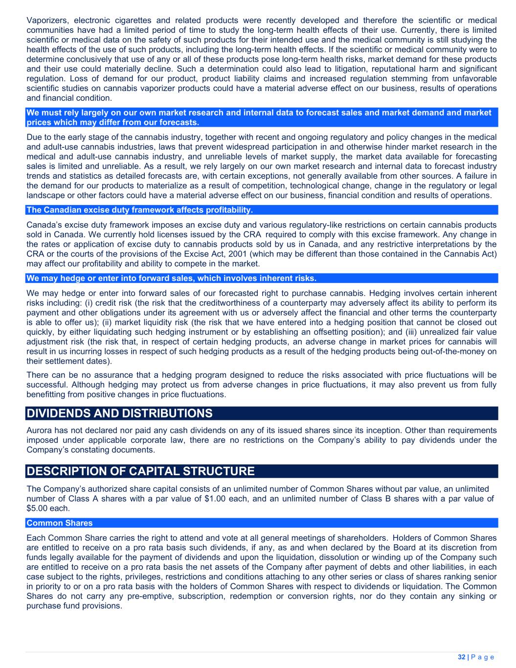 32 | P A G E我们必须在很大程度上依靠我们自己的市场研究和内部数据来预测销量和市场需求以及可能与我们的预测不同的市场价格。加拿大消费税框架影响盈利能力。我们可能会进行套期保值或进行远期销售,这涉及固有风险。股息和分配资本结构描述普通股蒸发器、电子烟和相关产品最近被开发出来,因此科学界或医学界有一段有限的时间来研究使用它们对健康的长期影响。目前,关于此类产品预定用途的安全性的科学或医学数据有限,医学界仍在研究使用此类产品的健康影响,包括长期健康影响。如果科学界或医学界最终确定使用任何或所有这些产品构成长期健康风险,市场对这些产品及其使用的需求可能会大幅下降。这样的认定还可能导致诉讼、名誉损害和重大监管。对我们产品的需求损失、产品责任索赔以及对大麻蒸发器产品的不利科学研究导致的监管增加可能对我们的业务、经营业绩和财务状况产生重大不利影响。由于大麻行业处于早期阶段,加上医疗和成人用大麻行业最近和正在进行的监管和政策变化、阻止广泛参与或以其他方式阻碍医疗和成人用大麻行业市场研究的法律以及不可靠的市场供应水平,可用于预测销售的市场数据有限且不可靠。因此,我们在很大程度上依赖于我们自己的市场研究和内部数据来预测行业趋势和统计数据,因为除了某些例外,详细的预测通常无法从其他来源获得。由于竞争、技术变革、监管或法律环境的变化或其他因素,对我们产品的需求未能实现,可能会对我们的业务、财务状况和经营业绩产生重大不利影响。加拿大的消费税框架对在加拿大销售的某些大麻产品征收消费税和各种类似监管的限制。我们目前持有CRA颁发的符合这一消费税框架要求的许可证。我们在加拿大销售的大麻产品的税率或消费税适用的任何变化,以及CRA或法院对2001年《消费税法》条款的任何限制性解释(可能与《大麻法》所载条款不同)都可能影响我们的盈利能力和市场竞争能力。我们可能会对我们预测的购买大麻的权利进行对冲或进行远期销售。套期保值涉及某些固有风险,包括:(i)信用风险(交易对手的信誉可能对其履行其与我们协议项下的付款和其他义务的能力产生不利影响或对交易对手能够向我们提供的财务和其他条款产生不利影响的风险);(ii)市场流动性风险(我们通过清算该套期保值工具或通过建立抵消头寸而建立的套期保值头寸无法迅速平仓的风险);(iii)未实现公允价值调整风险(就某些套期保值产品而言,大麻市场价格的不利变化将导致我们就此类对冲产品产生损失,因为对冲产品在其结算日处于价外状态)。无法保证旨在降低与价格波动相关的风险的对冲计划会成功。虽然套期保值可能保护我们免受价格波动的不利变化,但也可能使我们无法充分受益于价格波动的积极变化。Aurora自成立以来未就其任何已发行股份宣派或派付任何现金股息。除根据适用的公司法施加的要求外,根据公司的监管文件,公司支付股息的能力没有任何限制。该公司的法定股本包括无限数量的无面值普通股、无限数量的每股面值为1.00美元的A类股以及无限数量的每股面值为5.00美元的B类股。每一普通股都有权出席所有股东大会并参加投票。普通股持有人有权按比例从合法可用于支付股息的资金和清算时获得董事会酌情宣布的股息(如有), 公司解散或清盘,这些有权按比例收取支付债务和其他负债后的公司净资产,在每种情况下,均受任何其他系列或类别的股份所附带的权利、特权、限制和条件的约束,这些股份在股息或清算方面优先于或按比例与普通股持有人有关。普通股不附带任何优先认购权、认购权、赎回权或转换权,也不包含任何下沉或购买基金条款。