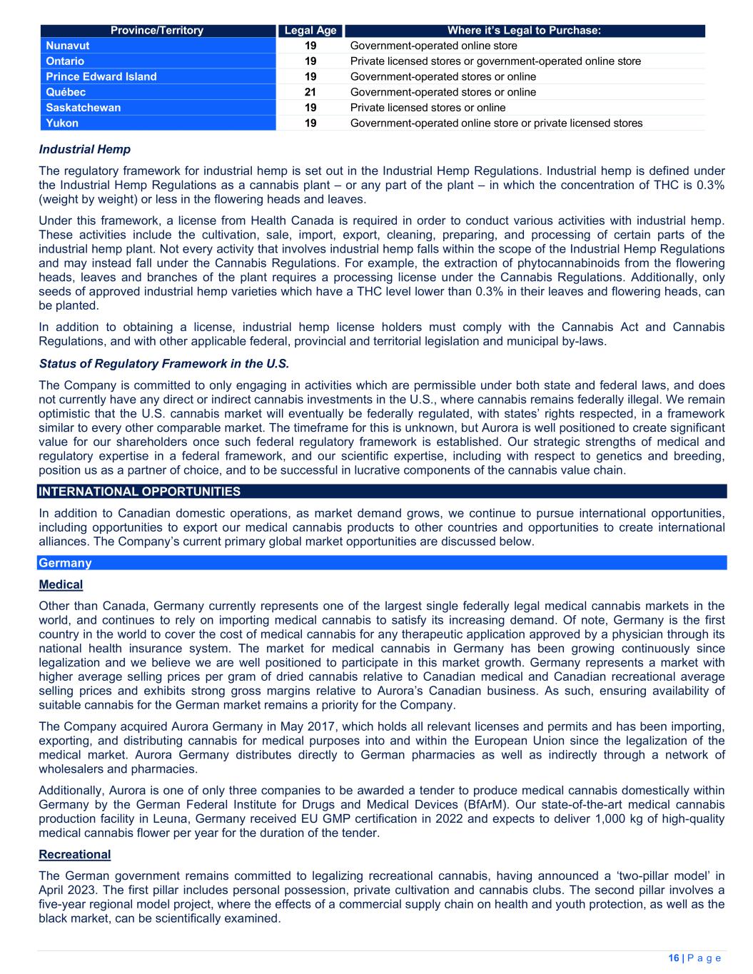 16 | P a g e省/地区合法购买的法定年龄:努纳武特19政府经营的网上商店安大略19私人特许商店或政府经营的网上商店爱德华王子岛19政府经营的商店或网上Qu é bec 21政府经营的商店或网上萨斯喀彻温省19私人特许商店或网上Yukon 19政府经营的网上商店或私人特许商店工业大麻的监管框架载于《工业大麻条例》。根据《工业大麻法规》,工业大麻被定义为一种大麻植物——或植物的任何部分——其中开花头和叶片中的THC浓度为0.3%(按重量计)或更低。在这一框架下,需要获得加拿大卫生部的许可,才能与工业大麻开展各种活动。这些活动包括工业大麻植物某些部分的种植、销售、进口、出口、清洗、制备、加工等。并非每一项涉及工业大麻的活动都属于工业大麻法规的范围,反而可能属于大麻法规的范围。例如,从植物的开花头、叶子和分支中提取植物大麻素需要根据《大麻条例》获得加工许可证。此外,只有批准的工业大麻品种的种子,其叶片和开花头的THC水平低于0.3%,才能种植。除了获得许可证外,工业大麻许可证持有者还必须遵守《大麻法》和《大麻条例》,以及其他适用的联邦、省和地区立法和市级章程。美国监管框架现状该公司承诺只从事州和联邦法律允许的活动,目前在美国没有任何直接或间接的大麻投资,在美国,大麻仍然是联邦非法的。我们仍然乐观地认为,美国大麻市场最终将受到联邦监管,各州的权利得到尊重,框架与其他所有可比市场相似。这方面的时间框架不得而知,但一旦建立这样的联邦监管框架,Aurora就能够为我们的股东创造重大价值。我们在联邦框架内的医疗和监管专业知识的战略优势,以及我们的科学专业知识,包括在遗传学和育种方面的专业知识,使我们成为首选合作伙伴,并在大麻价值链中利润丰厚的组成部分取得成功。国际机会除了加拿大国内业务外,随着市场需求的增长,我们继续寻求国际机会,包括向其他国家出口我们的医用大麻产品的机会以及建立国际联盟的机会。下文将讨论公司目前的主要全球市场机会。德国医疗除加拿大外,德国目前是世界上最大的单一联邦合法医用大麻市场之一,并继续依赖进口医用大麻来满足其日益增长的需求。值得注意的是,德国是世界上第一个为医生通过其国家医疗保险系统批准的任何治疗应用支付医用大麻费用的国家。自合法化以来,德国的医用大麻市场一直在持续增长,我们相信我们有能力参与这一市场增长。德国是一个市场,相对于加拿大医疗和加拿大娱乐平均销售价格,每克干大麻的平均销售价格更高,并且相对于Aurora的加拿大业务表现出强劲的毛利率。因此,确保为德国市场提供合适的大麻仍然是公司的优先事项。该公司于2017年5月收购了Aurora Germany,后者持有所有相关许可证和许可,自医疗市场合法化以来一直在欧盟内部和内部进口、出口和分销用于医疗目的的大麻。Aurora Germany直接向德国药店分销,也通过批发商和药店网络间接分销。此外,Aurora是获得德国联邦药品和医疗器械研究所(BFARM)在德国境内生产医用大麻招标的仅有的三家公司之一。我们位于德国Leuna的最先进的医用大麻生产设施于2022年获得了欧盟GMP认证,预计在招标期间每年将交付1,000公斤高质量医用大麻花。休闲娱乐德国政府仍致力于将休闲大麻合法化,并于2023年4月宣布了“双支柱模式”。第一支柱包括个人占有, 私人种植和大麻俱乐部。第二个支柱涉及一个为期五年的区域模型项目,在该项目中,可以科学地检查商业供应链对健康和青少年保护以及黑市的影响。