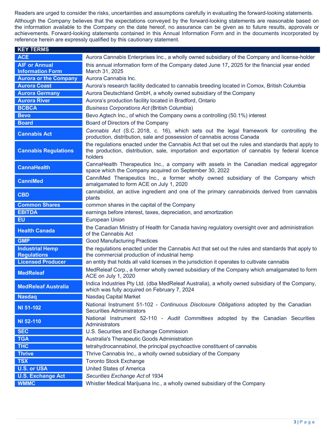3 |敦促P A G E读者在评估前瞻性陈述时仔细考虑风险、不确定性和假设。尽管公司认为,根据公司在本协议发布之日可获得的信息,前瞻性陈述所传达的预期是合理的,但无法对未来的结果、批准或成就做出任何保证。本年度信息表和以引用方式并入本文的文件中包含的前瞻性陈述受到本警示性声明的明确限定。关键条款ACE Aurora Cannabis Enterprises Inc.,公司的全资附属公司及许可证持有人AIF或年度资料表本公司日期为2025年6月17日、截至2025年3月31日止财政年度的年度资料表格Aurora或公司Aurora Cannabis Inc. Aurora Coast Aurora位于不列颠哥伦比亚省Comox的专门用于大麻育种的研究设施Aurora Germany Aurora Deutschland GmbH,公司Aurora River Aurora位于安大略省布拉德福德的生产设施的全资子公司BCBCA Business Corporations Act(British Columbia)Bevo Bevo Agtech Inc.,其中,公司拥有《公司大麻法大麻法》(S.C. 2018,c.16)的控股(50.1%)权益董事会,该法案规定了在加拿大各地控制大麻生产、分销、销售和拥有的法律框架《大麻法》规定了根据《大麻法》颁布的规定,其中规定了适用于联邦许可证持有人CannaHealth CannaHealth Therapeutics Inc.生产、分销、销售、进口和出口大麻的规则和标准,该公司于9月30日收购了一家在加拿大医疗聚合空间拥有资产的公司,2022 CanniMed CanniMed Therapeutics Inc.,公司前全资子公司,于2020年7月1日合并形成ACE,CBD大麻二酚是一种活性成分,是源自大麻植物的主要大麻素之一,公司资本中的普通股EBITDA息税折旧前利润,和摊销欧盟欧盟卫生部加拿大加拿大卫生部对《大麻法》进行监管监督和管理GMP良好生产规范工业大麻法规根据《大麻法》颁布的法规,其中规定了适用于工业大麻许可生产商商业生产的规则和标准,该实体在其经营的管辖范围内持有种植大麻MedReleaf MedReleaf Corp.的所有有效许可证,该公司的前全资子公司于7月1日合并成立了ACE,2020 MedReleaf Australia Indica Industries Pty Ltd.(DBA MedReleaf Australia),公司的全资子公司,于2024年2月7日被完全收购,纳斯达克丨纳斯达克资本市场NI 51-102 National Instrument 51-102-加拿大证券管理局采用的持续披露义务NI 52-110 National Instrument 52-110-加拿大证券管理局采用的审计委员会SEC美国证券交易委员会TGA澳大利亚治疗用品管理局THC四氢大麻酚,大麻Thrive Thrive Cannabis Inc.的主要精神活性成分,公司的全资子公司TSX多伦多证券交易所美国或美国1934年美国交易法证券交易法WMMC Whistler Medical Marijuana Inc.,公司的全资子公司