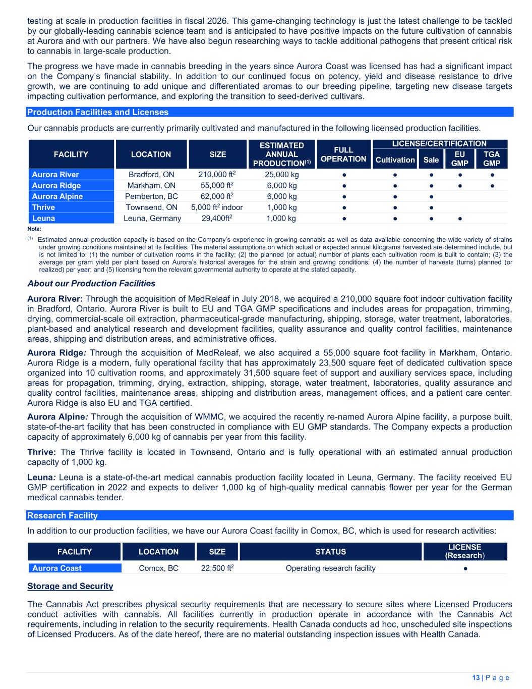 13 | 2026财年在生产设施中进行大规模P A G E测试。这项改变游戏规则的技术只是我们全球领先的大麻科学团队要应对的最新挑战,预计将对Aurora和我们的合作伙伴未来的大麻种植产生积极影响。我们还开始研究如何应对在大规模生产中对大麻构成严重风险的其他病原体。自Aurora Coast获得许可以来的几年里,我们在大麻养殖方面取得的进展对公司的财务稳定性产生了重大影响。除了我们继续关注效力、产量和抗病性以推动增长外,我们还在继续为我们的育种管道添加独特和差异化的香气,瞄准影响栽培性能的新疾病目标,并探索向种子衍生品种的过渡。生产设施和许可证我们的大麻产品目前主要在以下许可生产设施中种植和制造。设施位置大小估计年生产量(1)全操作许可证/认证栽培销售欧盟GMP TGA GMP Aurora River Bradford,在210,000ft2 25,000 kg ● ● ● ● ● Aurora Ridge Markham,在55,000 ft2 6,000 kg ● ● ● ● Aurora Alpine Pemberton,BC 62,000 ft2 6,000 kg ● ● ● Thrive Townsend,在5,000 ft2室内1,000 kg ● ● ● Leuna Leuna,德国29,400ft2 1,000公斤● ● ● ●注:(1)估计年产能是基于公司种植大麻的经验以及有关其设施维持的生长条件下种类繁多的毒株的现有数据。确定实际或预期年收获公斤数所依据的材料假设包括但不限于:(1)设施中的培养室数量;(2)每个培养室建造以容纳的植物的计划(或实际)数量;(3)基于Aurora对菌株和生长条件的历史平均值的每株植物的平均每克产量;(4)每年计划(或实现)的收获(轮)数量;(5)获得相关政府当局的许可,以规定的能力运营。关于我们的生产设施Aurora River:通过2018年7月收购MedReleaf,我们在安大略省布拉德福德获得了一个210,000平方英尺的室内种植设施。Aurora River按照欧盟和TGA GMP规范建造,包括繁殖、修剪、干燥、商业规模采油、医药级制造、航运、储存、水处理、实验室、植物基和分析研发设施、质量保证和质量控制设施、维护区、运输和分配区以及行政办公室等区域。Aurora Ridge:通过收购MedReleaf,我们还在安大略省万锦市获得了一个5.5万平方英尺的设施。Aurora Ridge是一个现代化、全面运营的设施,拥有约23,500平方英尺的专用栽培空间,组织为10个培育室,以及约31,500平方英尺的支持和辅助服务空间,包括繁殖、修剪、干燥、提取、运输、储存、水处理、实验室、质量保证和质量控制设施、维护区、运输和分配区、管理办公室和患者护理中心。Aurora Ridge还获得了欧盟和TGA认证。Aurora Alpine:通过收购WMMC,我们获得了最近重新命名的Aurora Alpine设施,这是一个按照欧盟GMP标准建造的专门建造的最先进的设施。该公司预计该设施的大麻产能约为每年6,000公斤。Thrive:Thrive工厂位于安大略省汤森,已全面投入运营,预计年产能为1,000公斤。Leuna:Leuna是位于德国Leuna的最先进的医用大麻生产设施。该设施于2022年获得欧盟GMP认证,预计每年将为德国医用大麻招标交付1,000公斤优质医用大麻花。研究设施除了我们的生产设施外,我们还有位于不列颠哥伦比亚省科莫克斯的Aurora Coast设施,用于研究活动:设施位置大小状态许可证(研究)Aurora Coast Comox,不列颠哥伦比亚省22,500平方英尺运营研究设施●储存和安全《大麻法》规定了必要的实物安全要求,以确保获得许可的生产商使用大麻开展活动的场所的安全。目前正在生产的所有设施都按照《大麻法》的要求运作,包括与安全要求有关的要求。加拿大卫生部对持牌生产商进行不定期的临时现场检查。截至本报告之日,加拿大卫生部不存在重大未决检查问题。