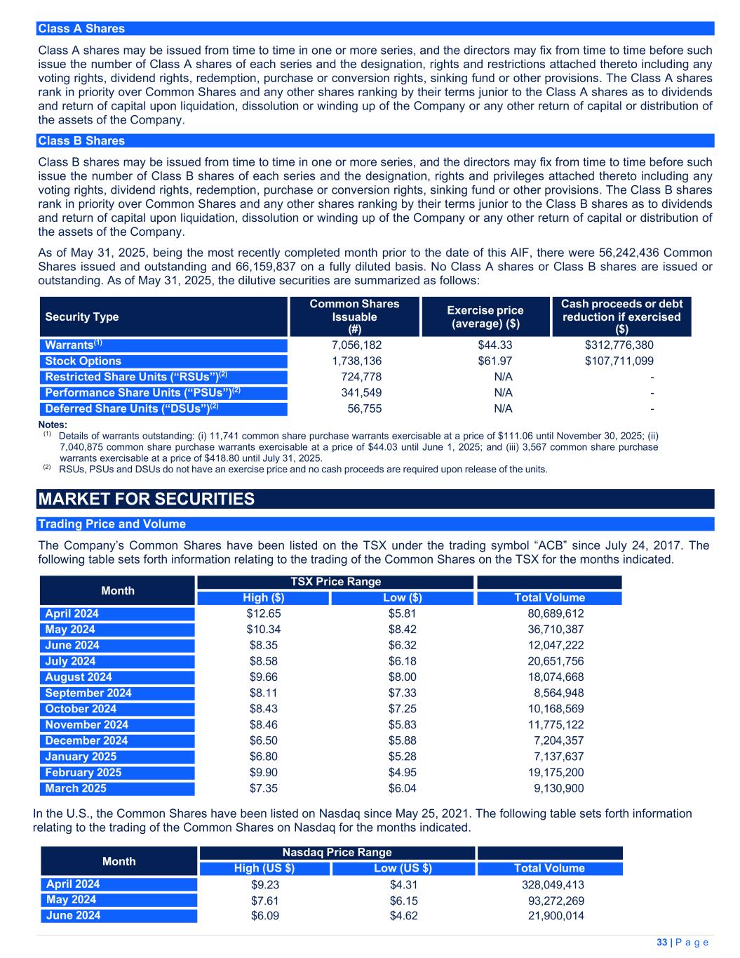 33 |证券交易价格和交易量的P A G E B类股票市场A类股票可不时以一个或多个系列发行,董事可在该发行前不时确定每个系列的A类股票数量及其所附的指定、权利和限制,包括任何投票权、股息权利、赎回、购买或转换权利、偿债基金或其他规定。A类股份在公司清算、解散或清盘时的股息和资本回报或公司资产的任何其他资本回报或分配方面,优先于普通股和按条款排名低于A类股份的任何其他股份。B类股份可不时以一个或多个系列发行,董事可在该发行前不时订定各系列B类股份的数目及其所附带的指定、权利及特权,包括任何投票权、分红权、赎回、购买或转换权、偿债基金或其他条文。B类股份在公司清算、解散或清盘时的股息和资本回报或公司资产的任何其他资本回报或分配方面,优先于普通股和按条款排名低于B类股份的任何其他股份。截至2025年5月31日,作为本次AIF日期前最近完成的一个月,已发行和流通的普通股为56,242,436股,完全稀释后为66,159,837股。没有发行或流通的A类股或B类股。截至2025年5月31日,稀释性证券汇总如下:可发行证券类型普通股(#)行使价(平均)($)如果行使现金收益或债务减少($)认股权证(1)7,056,182美元44.33美元312,776,380美元股票期权1,738,136美元61.97美元107,711,099美元限制性股票单位(“RSU”)(2)724,778不适用-履约股份单位(“PSU”)(2)341,549不适用-递延股份单位(“DSU”)(2)56,755不适用-注:(1)未行使认股权证详情:(i)11,741份可在2025年11月30日之前以111.06美元的价格行使的普通股购买认股权证;(ii)7,040,875份可行使的2025年;及(iii)3,567份普通股认购权证,可于2025年7月31日前以418.80美元的价格行使。(2)RSU、PSU和DSU没有行权价,在单位解除时不需要现金收益。该公司的普通股自2017年7月24日起在多伦多证券交易所上市,交易代码为“ACB”。下表列出了与所示月份的TSX普通股交易有关的信息。月TSX价格区间High($)Low($)Total Volume April 2024 $ 12.65 $ 5.8 180,689,612May 2024 $ 10.34 $ 8.4236,710,387 June 2024 $ 8.35 $ 6.32 12,047,222July 2024 $ 8.58 $ 6.18 20,651,756August 2024 $ 9.66 $ 8.00 18,074,668September 2024 $ 8.11 $ 7.338,564,948October 2024 $ 8.43 $ 7.25 10,168,569November 2024 $ 8.46 $ 5.83 11,775,122December 2024 $ 6.50 $ 5.887,204,357January 2025 $ 6.80 $ 5.287,137,637下表列出有关所示月份在纳斯达克的普通股买卖的资料。月纳斯达克价格区间最高价(美元)最低价(美元)总成交量2024年4月$ 9.23 $ 4.31328,049,413 $ 7.61 $ 6.1593,272,269 $ 6.09 $ 4.62 21,900,014 May 2024 June 2024 A类股