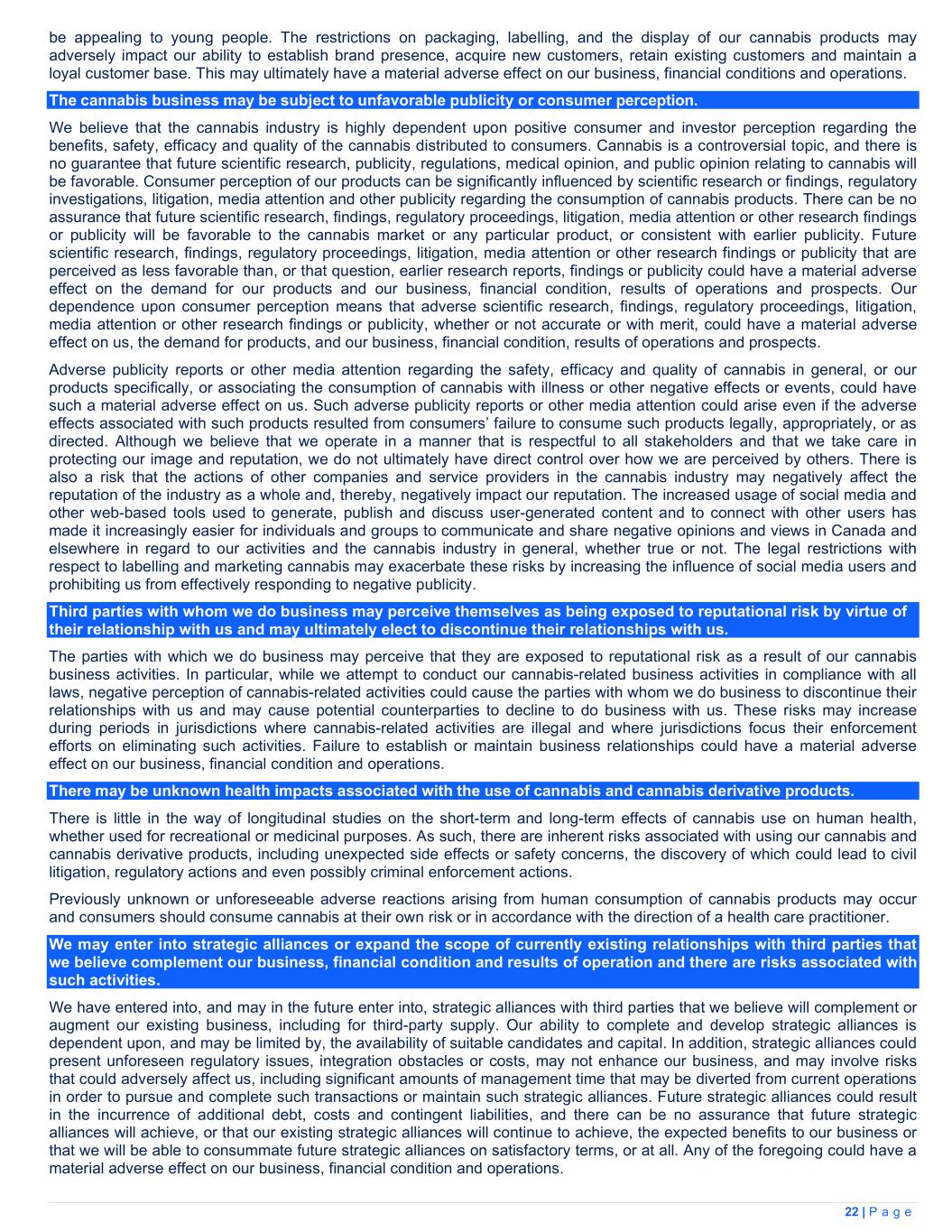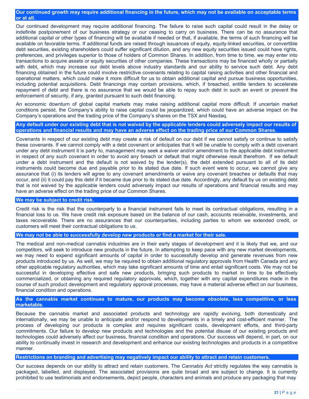 21 | P A G E我们现有债务项下的任何未被适用的贷方豁免的违约都可能对我们的经营业绩和财务业绩产生不利影响,并可能对我们普通股的交易价格产生不利影响。我们可能会受到信用风险的影响。我们可能无法成功开发新产品或为其销售找到市场。随着大麻市场的不断成熟,我们的产品可能会变得过时、竞争力下降,或者更难上市。对品牌和广告的限制可能会对我们吸引和留住客户的能力产生负面影响。我们的持续发展可能需要额外的融资。未能筹集到这些资金可能会导致我们的业务战略延迟或无限期推迟或我们停止开展业务。无法保证在需要时将提供额外资本或其他类型的融资,或在可获得的情况下,将以优惠条款提供此类融资的条款。如果通过发行股票、股票挂钩证券或可转换债务证券筹集额外资金,现有股东可能会遭受重大稀释,任何新发行的股票证券都可能拥有优于普通股持有人的权利、优先权和特权。此外,我们可能不时订立交易以收购其他公司的资产或股本证券。这些交易可能全部或部分以债务融资,这可能会使我们的债务水平超过行业标准,并提高我们偿还此类债务的能力。未来获得的任何债务融资可能涉及与筹资活动以及其他财务和运营事项有关的限制性契约,这可能使我们更难获得额外资本和寻求商业机会,包括潜在的收购。债务融资可能包含条款,这些条款如果被违反,将使贷方有权加速偿还债务,并且无法保证我们将能够在此类事件中偿还此类债务或阻止根据此类债务融资授予的任何担保(如果有的话)的强制执行。全球资本市场的经济下滑可能会使筹集额外资金变得更加困难。如果不确定的市场条件持续存在,可能会危及公司筹集资金的能力,从而可能对公司的经营以及公司股票在多伦多证券交易所和纳斯达克的交易价格产生不利影响。如果我们不能满足或继续满足这些契约,与我们现有债务有关的契约可能会对我们的债务产生违约风险。如果我们不能遵守债务契约或预期其将无法遵守其作为缔约方的任何债务工具项下的债务契约,管理层可就任何此类契约寻求对适用债务工具的豁免和/或修订,以避免可能因此而导致的任何违约或违约。如果我们在一项债务工具下发生违约,而贷款人未放弃违约,则根据其所有债务工具展期的债务可能会在其规定的到期日期之前到期应付。如果发生此类事件,我们无法保证(i)其贷方将同意任何契约修订或放弃可能发生的任何契约违约或违约,以及(ii)如果债务在其规定的到期日期之前到期,它可以支付这笔债务。因此,我们对现有债务的任何违约如果不被适用的贷方豁免,可能会对我们的经营业绩和财务业绩产生不利影响,并可能对我们普通股的交易价格产生不利影响。信用风险是指金融工具的交易对手未能履行其合同义务,导致我们遭受财务损失的风险。根据我们的现金、应收账款、投资和可收回税款的余额,我们有信用风险敞口。无法保证我们的交易对手,包括我们提供信贷的各方,或客户将履行其对我们的合同义务。医用和非医用大麻行业正处于发展的早期阶段,我们和我们的竞争对手很可能会在未来寻求引入新产品。在试图跟上任何新的市场发展步伐时,我们可能需要花费大量资金,以便成功开发并从我们推出的新产品中获得收入。此外,我们可能需要从加拿大卫生部和任何其他适用的监管机构获得额外的监管批准,这可能需要大量时间并需要大量成本。我们可能无法成功开发有效和安全的新产品,无法及时将此类产品推向市场以有效商业化,或无法获得任何必要的监管批准,这, 连同在此类产品开发和监管批准过程中进行的任何资本支出,可能会对我们的业务、财务状况和运营产生重大不利影响。由于大麻市场及相关产品和技术在国内和国际上都在迅速发展,我们可能无法及时预测和/或以具有成本效益的方式应对事态发展。开发我们产品的过程是复杂的,需要大量的成本、开发努力和第三方承诺。我们未能开发新产品和技术以及我们现有产品和技术的潜在废弃可能会对我们的业务、财务状况和运营产生不利影响。我们的成功将部分取决于我们持续投资于研发并以具有竞争力的方式增强我们现有技术和产品的能力。我们的成功取决于我们吸引和留住客户的能力。《大麻法》对大麻的包装、标签和展示方式进行了严格监管。相关条款相当宽泛,可能会发生变化。目前禁止使用感言和背书,描绘人、人物和动物,并制作任何可能我们的持续增长可能需要未来额外融资的包装,这些融资可能无法以可接受的条款或根本无法获得。
