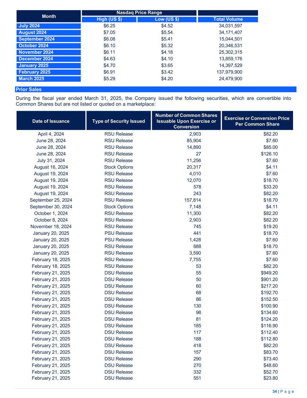 34 | P A G E前一个销售月纳斯达克价格区间高(美元)低(美元)总成交量2024年7月6.25美元4.5234,031,5972024年8月7.05美元5.54美元34,171,4072024年9月6.08美元5.41美元15,044,5012024年10月6.10美元5.32美元20,346,531美元2024年11月6.11美元4.18美元25,302,315美元2024年12月4.63美元4.10美元13,859,1762025年1月4.70美元3.65美元14,397,5292025年2月6.91美元3.42美元137,979,900美元2025年3月5.29美元4.2024,479,900美元截至2025年3月31日的财政年度,公司发行了以下证券,可转换为普通股但未在市场上上市或报价:发行日期证券类型已发行普通股数量可在行使或转换行使或转换价格每股普通股时发行2024年4月4日RSU发行2,903美元82.20美元2024年6月28日RSU发行85,904美元7.60美元2024年6月28日RSU发行14,890美元85.00美元2024年6月28日RSU发行27美元126.10美元2024年7月31日RSU发行11,256美元7.60美元2024年8月16日股票期权20,317美元4.11美元2024年8月19日RSU发行4,010美元7.60美元2024年8月19日RSU发行12,070美元18.70美元8月19日,2024 RSU Release 578 $ 33.20 August 19,2024 RSU Release 243 $ 82.20 September 25,2024 RSU Release 157,814 $ 18.70 September 30,2024 Stock Options 7,148 $ 4.11 October 1,2024 RSU Release 11,300 $ 82.20 October 8,2024 RSU Release 2,903 $ 82.20 November 18,2024 RSU Release 745 $ 19.20 January 20,2025PSU Release 441 $ 18.70 January 20,2025PSU Release 1,428 $ 7.60 January 20,2025RSU Release 688 $ 18.70 January 20,2025RSU2025 DSU Release 50 $ 901.20 February 21,2025 DSU Release 60 $ 217.20 February 21,2025 DSU Release 68 $ 192.70 February 21,2025 DSU Release 86 $ 152.50 February 21,2025 DSU Release 130 $ 100.90 February 21,2025 DSU Release 98 $ 134.60 February 21,2025 DSU Release 81 $ 124.20 February 21,2025 DSU Release 185 $ 116.90 February 21,2025 DSU Release 117 $ 112.40 February 21,2025 DSU Release 188 $ 112.80 February 21,2025 DSU Release 418 $ 82.20 February 21,2025 DS2025年DSU发布332 $ 52.70 2025年2月21日DSU发布551 $ 23.80