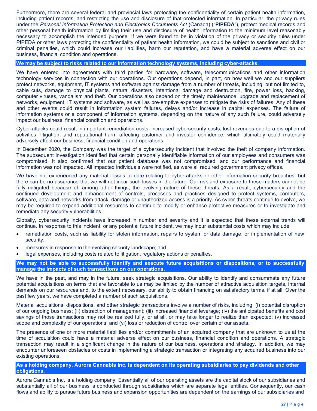 27 | P A G E我们可能无法成功识别和执行未来的收购或处置,或成功管理此类交易对我们运营的影响。作为一家控股公司,Aurora Cannabis Inc.对其经营中的子公司负有支付股息和其他义务的依赖。此外,有几项联邦和省级法律保护某些患者健康信息的机密性,包括患者记录,并限制该受保护信息的使用和披露。特别是《个人信息保护和电子文件法(加拿大)》(“PIPEDA”)下的隐私规则,通过将医疗记录和其他个人健康信息的使用和披露限制在实现预期目的合理必要的最低水平来保护这些信息。如果我们被发现违反PIPEDA或其他保护患者健康信息保密的法律规定的隐私或安全规则,我们可能会受到制裁和民事或刑事处罚,这可能会增加我们的责任,损害我们的声誉,并对我们的业务、财务状况和运营产生重大不利影响。我们可能会受到与我们的信息技术系统相关的风险,包括网络攻击。我们与第三方就与我们的运营相关的硬件、软件、电信和其他信息技术服务订立了协议。我们的运营部分取决于我们和我们的供应商如何保护网络、设备、IT系统和软件免受多种威胁的损害,包括但不限于电缆切断、实体工厂受损、自然灾害、故意损坏和破坏、火灾、电力损失、黑客攻击、计算机病毒、故意破坏和盗窃。我们的运营还依赖于网络、设备、IT系统和软件的及时维护、升级和更换,以及减轻故障风险的先发制人的费用。任何这些事件和其他事件都可能导致信息系统故障、延迟和/或资本支出增加。信息系统或信息系统的一个组成部分发生故障,取决于任何此类故障的性质,可能会对我们的业务、财务状况和运营产生不利影响。网络攻击可能导致重要的补救成本、增加的网络安全成本、因活动中断、诉讼造成的收入损失以及影响客户和投资者信心的声誉损害,最终可能对我们的业务、财务状况和运营产生重大不利影响。2020年12月,公司成为涉及窃取公司信息的网络安全事件的目标。随后的调查发现,我们的员工和消费者的某些个人身份信息被泄露。它还证实,我们的患者数据库没有受到损害,我们的业绩和财务信息没有受到影响。所有受影响的个人都收到了通知,所有被要求的政府隐私办公室也都收到了通知。迄今为止,我们没有经历任何与网络攻击或其他信息安全漏洞有关的重大损失,但无法保证我们未来不会蒙受此类损失。除其他外,由于这些威胁不断演变的性质,我们在这些问题上的风险和风险无法完全减轻。因此,网络安全以及继续发展和加强旨在保护系统、计算机、软件、数据和网络免受攻击、破坏或未经授权的访问的控制、流程和做法是一个优先事项。随着网络威胁的不断演变,我们可能需要花费额外的资源来继续修改或加强保护措施,或者调查和修复任何安全漏洞。全球范围内,网络安全事件的数量和严重程度都有所增加,预计这些外部趋势将持续下去。为应对这一事件,或任何潜在的未来事件,我们可能会产生大量成本,其中可能包括:补救成本,例如对被盗信息的责任、对系统或数据损坏的修复,或实施新的安全;针对不断变化的安全环境采取的措施;以及法律费用,包括与诉讼、监管行动或处罚相关的成本。我们过去有,将来也有可能,寻求战略性收购。我们以对我们有利的条款识别和完成任何未来潜在收购的能力可能会受到有吸引力的收购目标的数量、对我们资源的内部需求以及在必要情况下我们以令人满意的条款获得融资的能力(如果有的话)的限制。在过去几年中,我们完成了一些这样的收购。物资收购、处置等战略交易涉及多项风险, 包括:(i)我们正在进行的业务可能受到干扰;(ii)分散管理层的注意力;(iii)增加财务杠杆;(iv)这些交易的预期收益和成本节约可能无法完全实现,或根本无法实现,或可能需要比预期更长的时间才能实现;(v)我们的业务范围和复杂性增加;以及(vi)失去或减少对我们某些资产的控制权。被收购公司在收购时存在一项或多项我们不知道的重大负债和/或承诺可能对我们的业务、财务状况和运营产生重大不利影响。战略交易可能会导致我们的业务、运营和战略性质发生重大变化。此外,在实施战略交易或将任何收购的业务整合到我们现有的业务中时,我们可能会遇到无法预见的障碍或成本。Aurora Cannabis公司是一家控股公司。基本上我们所有的运营资产都是我们子公司的股本,我们几乎所有的业务都是通过作为独立法人实体的子公司进行的。因此,我们的现金流和追求未来业务和扩张机会的能力取决于我们子公司的收益和