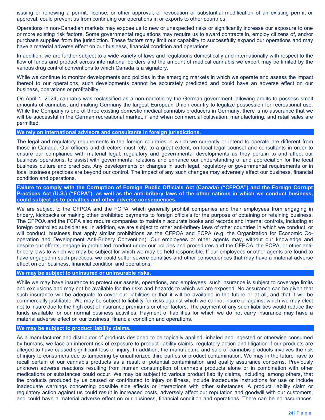 24 | P a g e我们依赖国际顾问和外国司法管辖区的顾问。如果不遵守《外国公职人员腐败法(加拿大)》(“CFPOA”)和《外国腐败行为法(美国)》(“FCPA”),以及我们开展业务的其他国家的反贿赂法律,我们可能会受到处罚和其他不利后果。我们可能会面临未投保或无法投保的风险。我们可能会受到产品责任索赔。签发或更新许可证、许可证或其他批准,或撤销或大幅修改现有许可证或批准,可能会阻止我们继续在其他国家开展业务或向其他国家出口。在非加拿大市场的操作可能会使我们面临新的或意外的风险,或显着增加我们对一个或多个现有风险因素的敞口。一些政府法规可能要求我们在该司法管辖区授予合同、雇用公民和/或从该司法管辖区购买供应品。这些因素可能会限制我们成功扩展业务的能力,并可能对我们的业务、财务状况和运营产生重大不利影响。此外,在资金和产品跨国际边界流动方面,我们进一步受到国内和国际范围广泛的法律法规的约束,我们出口的医用大麻数量可能受到加拿大签署的各种药物管制公约的限制。虽然我们继续监测我们经营所在的新兴市场的发展和政策,并评估其对我们运营的影响,但这些发展无法准确预测,并可能对我们的业务、运营或盈利能力产生不利影响。2024年4月1日,大麻被德国政府重新归类为非麻醉品,允许成年人拥有少量大麻,并使德国成为最大的合法拥有用于娱乐用途的欧盟国家。虽然该公司是德国现有的三家国内医用大麻生产商之一,但无法保证,如果商业种植、制造和零售销售被允许,我们将在德国娱乐市场取得成功。我们目前或打算开展业务的外国的法律法规要求与加拿大的法律法规要求不同。我们的管理人员和董事必须在很大程度上依赖当地的法律顾问和顾问,以确保我们遵守与我们的业务运营相关并影响我们的业务运营的重要法律、监管和政府发展,协助处理政府关系,并增强我们对当地商业文化和做法的理解和欣赏。此类法律、监管或政府要求或当地商业惯例的任何发展或变化都超出我们的控制范围。任何此类变化的影响可能会对我们的业务、财务状况和运营产生不利影响。我们受CFPOA和FCPA的约束,它们一般禁止公司及其员工为获得或保留业务而向外国官员进行贿赂、回扣或其他被禁止的付款。CFPOA和FCPA还要求公司保持准确的账簿和记录以及内部控制,包括在外国控股子公司。此外,我们受制于我们开展或将开展业务的其他国家的其他反贿赂法律,这些法律适用与CFPOA和FCPA(例如经济合作与发展组织反贿赂公约)类似的禁令。我们的员工或其他代理人可能会在我们不知情的情况下,尽管我们做出了努力,但仍会根据我们的政策和程序以及CFPOA、FCPA或我们可能受其约束的其他反贿赂法律从事被禁止的行为,我们可能会对此负责。如果我们的雇员或其他代理人被发现从事此类行为,我们可能会遭受严厉的处罚和其他可能对我们的业务、财务状况和运营产生重大不利影响的后果。虽然我们可能有保险来保护我们的资产、运营和员工,但这类保险受到承保范围限制和除外责任的限制,可能无法用于我们所面临的风险和危害。无法保证此类保险将足以覆盖我们的负债,或未来或根本无法获得,并且在商业上是合理的。对于我们无法投保的风险或由于保险费成本高或其他因素而可能选择不投保的风险,我们可能会承担责任。支付任何此类负债将减少可用于我们正常业务活动的资金。支付我们未携带保险的负债可能会对我们的业务产生重大不利影响, 财务状况和经营情况。作为设计用于局部应用、吸入和摄入或以其他方式供人类食用的产品的制造商和分销商,如果我们的产品被指控造成重大损失或伤害,我们将面临面临面临产品责任索赔、监管行动和诉讼的固有风险。此外,制造和销售大麻产品涉及因未经授权的第三方篡改或产品污染而对消费者造成伤害的风险。由于潜在的污染和质量保证问题,我们未来可能不得不召回我们的某些大麻产品。人类单独或与其他药物或物质联合食用大麻产品可能会发生以前未知的不良反应。我们可能会受到各种产品责任索赔,包括(其中包括)我们生产的产品导致或促成伤害或疾病、包括不充分的使用说明或包括关于可能的副作用或与其他物质相互作用的不充分警告。针对我们的产品责任索赔或监管行动可能导致成本增加,对我们与客户的声誉和商誉产生不利影响,并可能对我们的业务、财务状况和运营产生重大不利影响。不能有任何保证