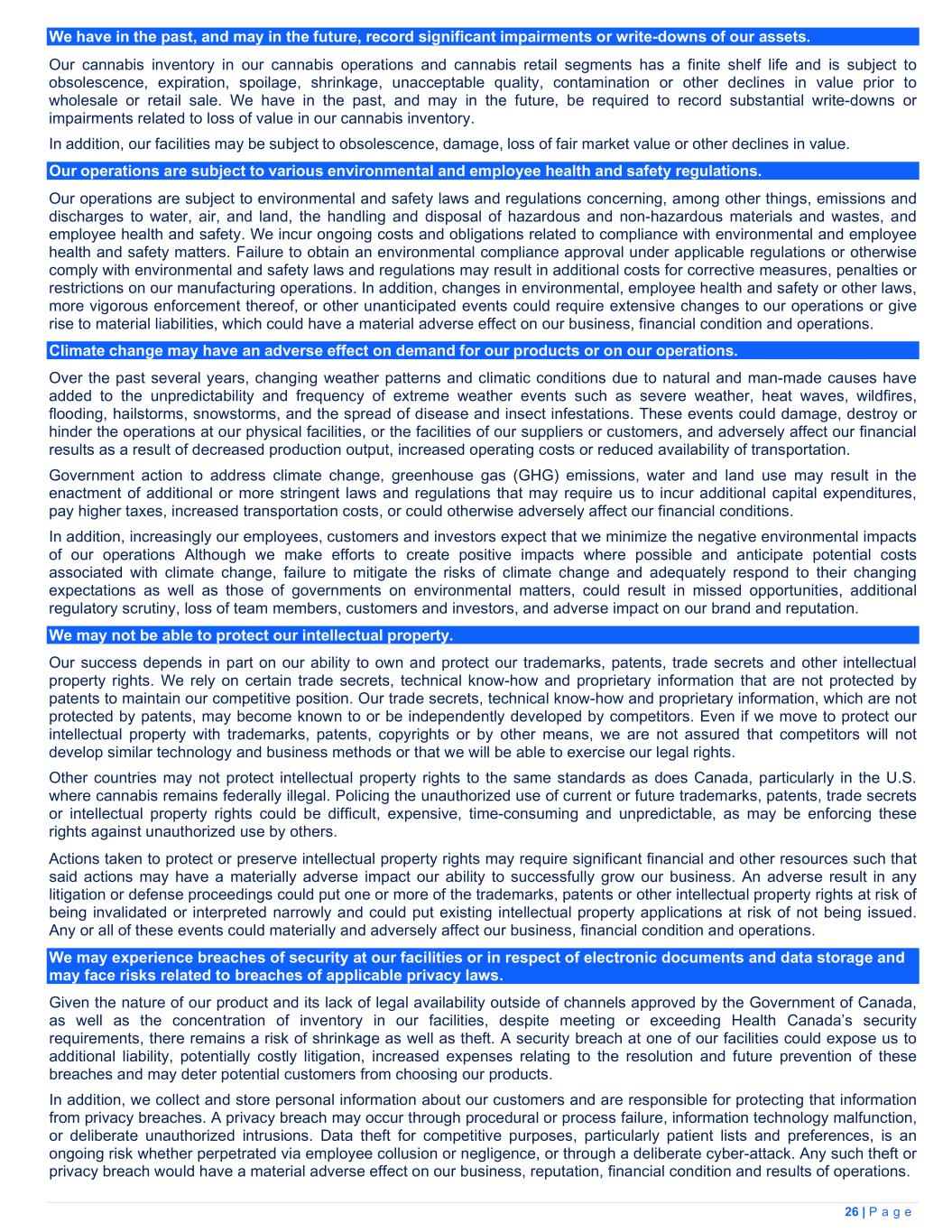 26 | P A G E我们的运营受制于各种环境和员工健康与安全法规。气候变化可能对我们产品的需求或我们的运营产生不利影响。我们可能无法保护我们的知识产权。我们可能会在我们的设施或电子文件和数据存储方面遇到安全漏洞,并可能面临与违反适用的隐私法相关的风险。我们在大麻业务和大麻零售部门的大麻库存具有有限的保质期,在批发或零售销售之前会受到过时、过期、变质、缩水、质量不可接受、污染或其他价值下降的影响。我们过去以及将来可能被要求在我们的大麻库存中记录与价值损失相关的大量减记或减值。此外,我们的设施可能会被淘汰、损坏、失去公平市场价值或其他价值下降。我们的运营受环境和安全法律法规的约束,其中涉及向水、空气和土地的排放和排放,危险和非危险材料和废物的处理和处置,以及员工的健康和安全。我们承担与遵守环境和员工健康与安全事项相关的持续成本和义务。未能根据适用法规获得环境合规批准或以其他方式遵守环境和安全法律法规可能会导致我们的制造业务的纠正措施、处罚或限制的额外成本。此外,环境、员工健康和安全或其他法律的变化、更有力的执行或其他意外事件可能需要对我们的运营进行广泛的改变或产生重大责任,这可能对我们的业务、财务状况和运营产生重大不利影响。几年来,由于自然和人为原因导致的不断变化的天气模式和气候条件,增加了恶劣天气、热浪、野火、洪水、冰雹、暴风雪、病虫害蔓延等极端天气事件的不可预见性和频率。这些事件可能会损害、破坏或阻碍我们的实体设施或我们的供应商或客户的设施的运营,并由于生产产量下降、运营成本增加或运输可用性降低而对我们的财务业绩产生不利影响。政府应对气候变化、温室气体(GHG)排放、水和土地使用的行动可能会导致颁布额外或更严格的法律法规,这可能要求我们产生额外的资本支出、支付更高的税款、增加运输成本,或可能对我们的财务状况产生不利影响。此外,我们的员工、客户和投资者越来越多地期望我们将业务对环境的负面影响降至最低。尽管我们努力在可能的情况下创造积极影响并预测与气候变化相关的潜在成本,但未能减轻气候变化风险并充分应对他们以及政府对环境问题的预期变化,可能会导致错失机会、额外的监管审查、团队成员、客户和投资者的流失,并对我们的品牌和声誉产生不利影响。我们的成功部分取决于我们拥有和保护我们的商标、专利、商业秘密和其他知识产权的能力。我们依靠某些不受专利保护的商业秘密、技术诀窍和专有信息来维持我们的竞争地位。我们的商业秘密、技术诀窍和专有信息,不受专利保护,可能会被竞争对手知晓或被竞争对手独立开发。即使我们采取行动以商标、专利、版权或其他方式保护我们的知识产权,我们也不能保证竞争对手不会开发类似的技术和商业方法或我们将能够行使我们的合法权利。其他国家可能不会像加拿大那样以同样的标准保护知识产权,特别是在美国,大麻仍然是联邦非法的。对未经授权使用当前或未来的商标、专利、商业秘密或知识产权进行监管可能是困难、昂贵、耗时且不可预测的,就像针对他人未经授权使用而强制执行这些权利一样。为保护或维护知识产权而采取的行动可能需要大量资金和其他资源,因此上述行动可能会对我们成功发展业务的能力产生重大不利影响。任何诉讼或辩护程序中的不利结果可能会将一个或多个商标, 专利或其他知识产权面临被无效或狭义解释的风险,并可能使现有的知识产权申请面临无法发布的风险。任何或所有这些事件都可能对我们的业务、财务状况和运营产生重大不利影响。鉴于我们产品的性质及其在加拿大政府批准的渠道之外缺乏合法可用性,以及库存集中在我们的设施中,尽管达到或超过了加拿大卫生部的安全要求,但仍然存在缩水和被盗的风险。我们其中一个设施的安全漏洞可能会使我们面临额外的责任、可能代价高昂的诉讼、与解决这些漏洞和未来预防相关的费用增加,并可能阻止潜在客户选择我们的产品。此外,我们收集和存储有关客户的个人信息,并负责保护这些信息不受隐私侵犯。隐私泄露可能通过程序或流程故障、信息技术故障或故意的未经授权的入侵而发生。出于竞争目的的数据盗窃,特别是患者名单和偏好,无论是通过员工串通或疏忽,还是通过蓄意的网络攻击,都是一种持续存在的风险。任何此类盗窃或隐私泄露将对我们的业务、声誉、财务状况和经营业绩产生重大不利影响。我们过去以及将来可能会对我们的资产录得重大减值或减记。