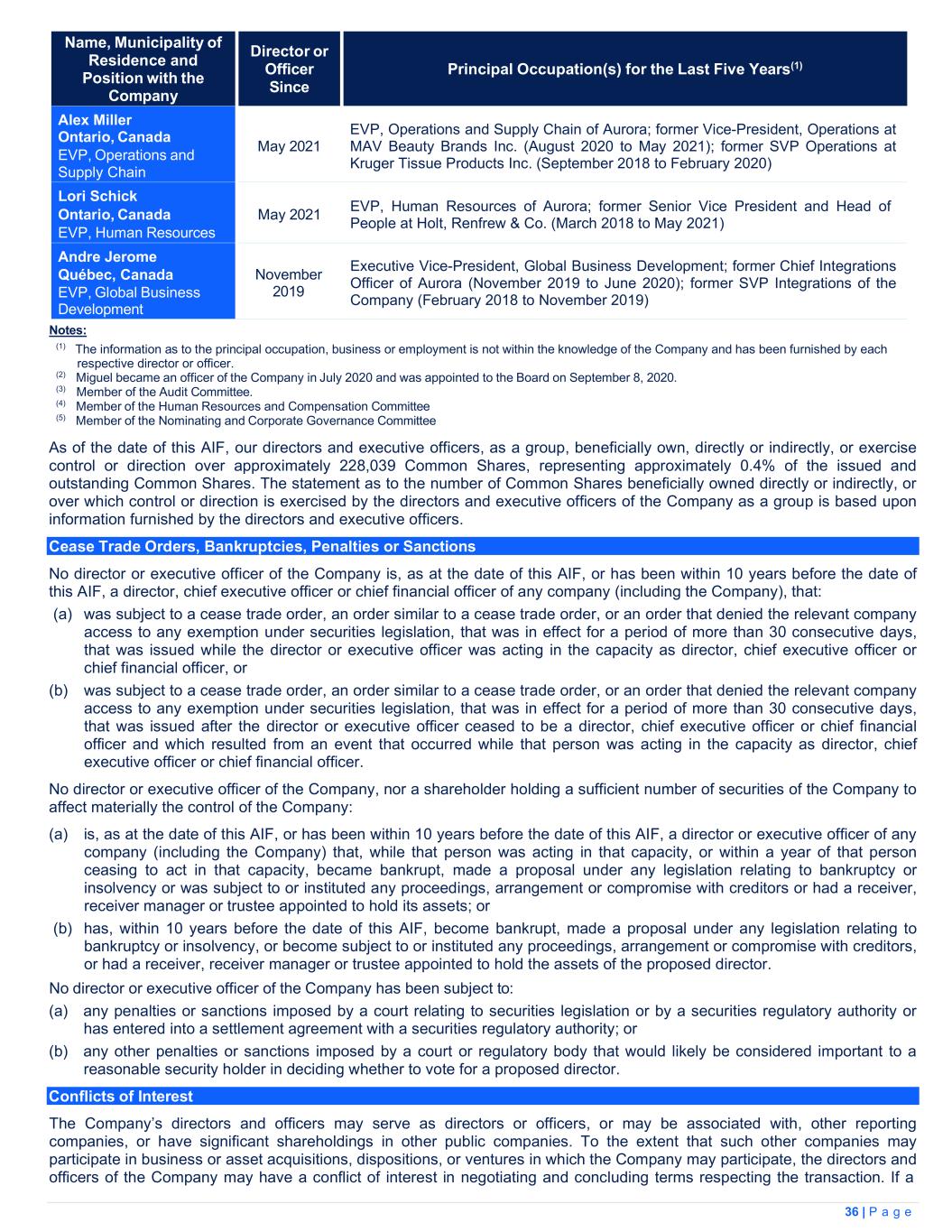 36 | P a g e姓名、居住地和自过去五年主要职业以来在公司董事或高级管理人员中的职位(1)Alex Miller Ontario,加拿大执行副总裁、运营和供应链2021年5月Aurora的运营和供应链执行副总裁;MAV Beauty Brands Inc.前运营副总裁(2020年8月至2021年5月);Kruger Tissue Products Inc.前运营高级副总裁(2018年9月至2020年2月)Lori Schick Ontario,加拿大执行副总裁、人力资源2021年5月执行副总裁、Aurora人力资源;Holt前高级副总裁兼人事主管,Renfrew & Co.(2018年3月至2021年5月)Andre Jerome Qu é bec,加拿大执行副总裁,全球业务发展2019年11月执行副总裁,全球业务发展;前Aurora首席整合官(2019年11月至2020年6月);前公司集成高级副总裁(2018年2月至2019年11月)注:(1)有关主要职业、业务或雇佣的信息不在公司知情范围内,并已由各自的董事或高级管理人员提供。(2)Miguel于2020年7月成为公司高级职员,并于2020年9月8日获委任为董事会成员。(三)审计委员会委员。(4)人力资源和薪酬委员会成员(5)提名和企业管治委员会成员截至本AIF日期,我们的董事和执行官作为一个整体,直接或间接实益拥有或行使对约228,039股普通股的控制或指示,约占已发行在外普通股的0.4%。关于直接或间接实益拥有的普通股数量,或公司董事和执行官作为一个集团对其行使控制或指示的普通股数量的声明是基于董事和执行官提供的信息。停止交易令、破产、处罚或制裁于本AIF日期,公司的任何董事或执行人员均不是或在本AIF日期前的10年内,是任何公司(包括公司)的董事、首席执行官或首席财务官:(a)受停止交易令、类似停止交易令的命令或根据证券法拒绝有关公司获得任何豁免的命令的规限,而该等命令已连续超过30日有效,在董事或执行官以董事、首席执行官或首席财务官身份行事时发出的,或(b)受停止交易令、类似于停止交易令的命令或拒绝相关公司根据证券法获得任何豁免的命令的约束,该命令连续超过30天有效,是在董事或执行官不再担任董事后发出的,首席执行官或首席财务官,并因该人以董事、首席执行官或首席财务官身份行事时发生的事件而导致。公司的任何董事或执行人员,或持有足够数目公司证券的股东,概不会因以下情况而对公司的控制权产生重大影响:(a)于本AIF日期,或在本AIF日期前10年内,是任何公司(包括公司)的董事或执行人员,而该人以该身份行事期间,或在该人停止以该身份行事后一年内,破产,根据任何与破产或无力偿债有关的法例提出建议,或受制于或提起与债权人的任何程序、安排或妥协,或指定接管人、接管人管理人或受托人持有其资产;或(b)已在本AIF日期前10年内破产,根据任何与破产或无力偿债有关的法例提出建议,或成为受制于或提起与债权人的任何程序、安排或妥协,或已指定接管人、接管人管理人或受托人持有拟任董事的资产。本公司的任何董事或执行人员均未受到:(a)法院就证券立法或证券监管机构施加的任何处罚或制裁,或已与证券监管机构订立和解协议;或(b)法院或监管机构施加的任何其他处罚或制裁,可能被认为对合理的证券持有人在决定是否投票给拟议董事时具有重要意义。利益冲突公司的董事和高级管理人员可能担任其他报告公司的董事或高级管理人员,或可能与其他报告公司有关联,或在其他公众公司拥有重要股权。在此类其他公司可能参与业务或资产收购的范围内, 公司可能参与的处置或风险投资,公司董事和高级管理人员在谈判和达成有关交易的条款时可能存在利益冲突。如果a