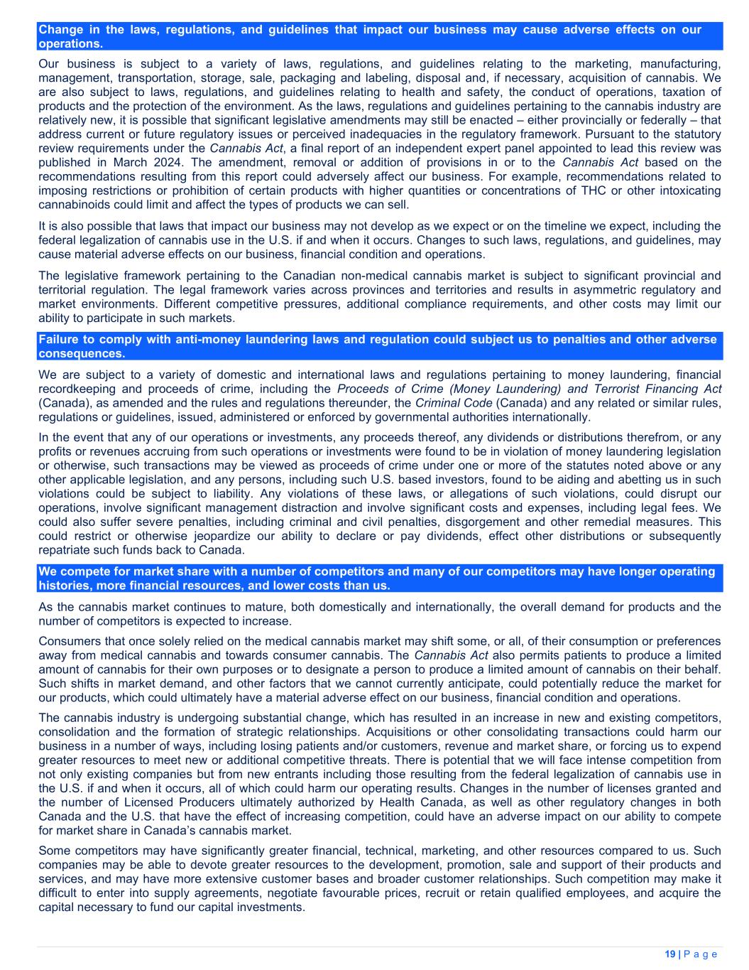 19 | P A G E不遵守反洗钱法律法规可能会使我们受到处罚和其他不利后果。我们与许多竞争对手争夺市场份额,我们的许多竞争对手可能比我们拥有更长的经营历史、更多的财务资源和更低的成本。我们的业务受制于与大麻的营销、制造、管理、运输、储存、销售、包装和标签、处置以及(如有必要)收购有关的各种法律、法规和准则。我们还受制于有关健康和安全、经营行为、产品税收和环境保护的法律、法规和指导方针。由于与大麻行业有关的法律、法规和指南相对较新,可能仍会颁布重要的立法修正案——无论是在省一级还是在联邦一级——以解决当前或未来的监管问题或监管框架中被认为存在的不足之处。根据《大麻法》规定的法定审查要求,被任命领导这一审查的独立专家小组的最后报告于2024年3月公布。根据本报告产生的建议对《大麻法》或《大麻法》中的条款进行修订、删除或添加条款可能会对我们的业务产生不利影响。例如,有关对含有较高数量或浓度的THC或其他令人陶醉的大麻素的某些产品施加限制或禁止的建议可能会限制并影响我们可以销售的产品类型。也有可能影响我们业务的法律可能不会像我们预期的那样或在我们预期的时间线上发展,包括美国联邦将大麻使用合法化(如果发生的话)。此类法律、法规和准则的变更,可能会对我们的业务、财务状况和运营造成重大不利影响。与加拿大非医用大麻市场有关的立法框架受到重要的省和地区监管。各省区的法律框架各不相同,导致监管和市场环境不对称。不同的竞争压力、额外的合规要求以及其他成本可能会限制我们参与此类市场的能力。我们受制于与洗钱、金融记录保存和犯罪所得有关的各种国内和国际法律法规,包括经修订的《犯罪所得(洗钱)和恐怖主义融资法案(加拿大)》及其下的规则和条例、《刑法典》(加拿大)以及由国际政府当局发布、管理或执行的任何相关或类似的规则、条例或准则。如果我们的任何业务或投资、其任何收益、由此产生的任何股息或分配,或此类业务或投资产生的任何利润或收入被发现违反洗钱立法或其他规定,根据上述一项或多项法规或任何其他适用立法,此类交易可能被视为犯罪所得,任何被发现协助和教唆我们从事此类违规行为的人,包括此类美国投资者,都可能承担责任。任何违反这些法律的行为,或对此类违规行为的指控,都可能扰乱我们的运营,涉及重大的管理分心,并涉及大量成本和开支,包括法律费用。我们还可能遭受严厉的处罚,包括刑事和民事处罚、非法所得和其他补救措施。这可能会限制或以其他方式危及我们宣布或支付股息、实施其他分配或随后将此类资金汇回加拿大的能力。随着大麻市场不断成熟,无论是在国内还是在国际上,对产品的总体需求和竞争者的数量预计都会增加。曾经完全依赖医用大麻市场的消费者可能会将部分或全部消费或偏好从医用大麻转向消费大麻。《大麻法》还允许患者为自己的目的生产有限数量的大麻,或指定一个人代表他们生产有限数量的大麻。市场需求的这种转变,以及我们目前无法预料的其他因素,可能会降低我们产品的市场,最终可能对我们的业务、财务状况和运营产生重大不利影响。大麻行业正在经历实质性变革,这导致新的和现有的竞争者增加、整合和战略关系的形成。收购或其他合并交易可能会以多种方式损害我们的业务,包括失去患者和/或客户、收入和市场份额, 或迫使我们花费更多资源来应对新的或额外的竞争威胁。有可能,我们将面临不仅来自现有公司的激烈竞争,而且来自新进入者的激烈竞争,包括那些因美国联邦大麻使用合法化而产生的竞争,如果这种情况发生,所有这些都可能损害我们的经营业绩。加拿大卫生部最终授权的许可数量和许可生产商数量的变化,以及加拿大和美国的其他监管变化可能会增加竞争,这可能会对我们在加拿大大麻市场竞争市场份额的能力产生不利影响。一些竞争对手可能拥有比我们大得多的资金、技术、营销和其他资源。这类公司或许能够投入更多资源用于其产品和服务的开发、推广、销售和支持,并可能拥有更广泛的客户基础和更广泛的客户关系。这种竞争可能会使我们难以签订供应协议、谈判优惠价格、招聘或留住合格员工,以及获得为我们的资本投资提供资金所需的资本。影响我们业务的法律、法规和准则的变化可能会对我们的运营造成不利影响。