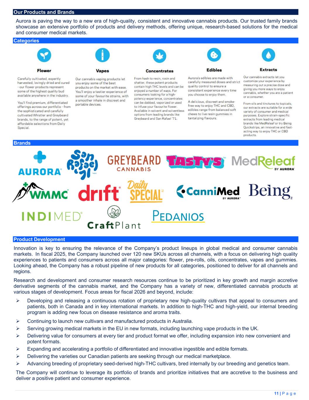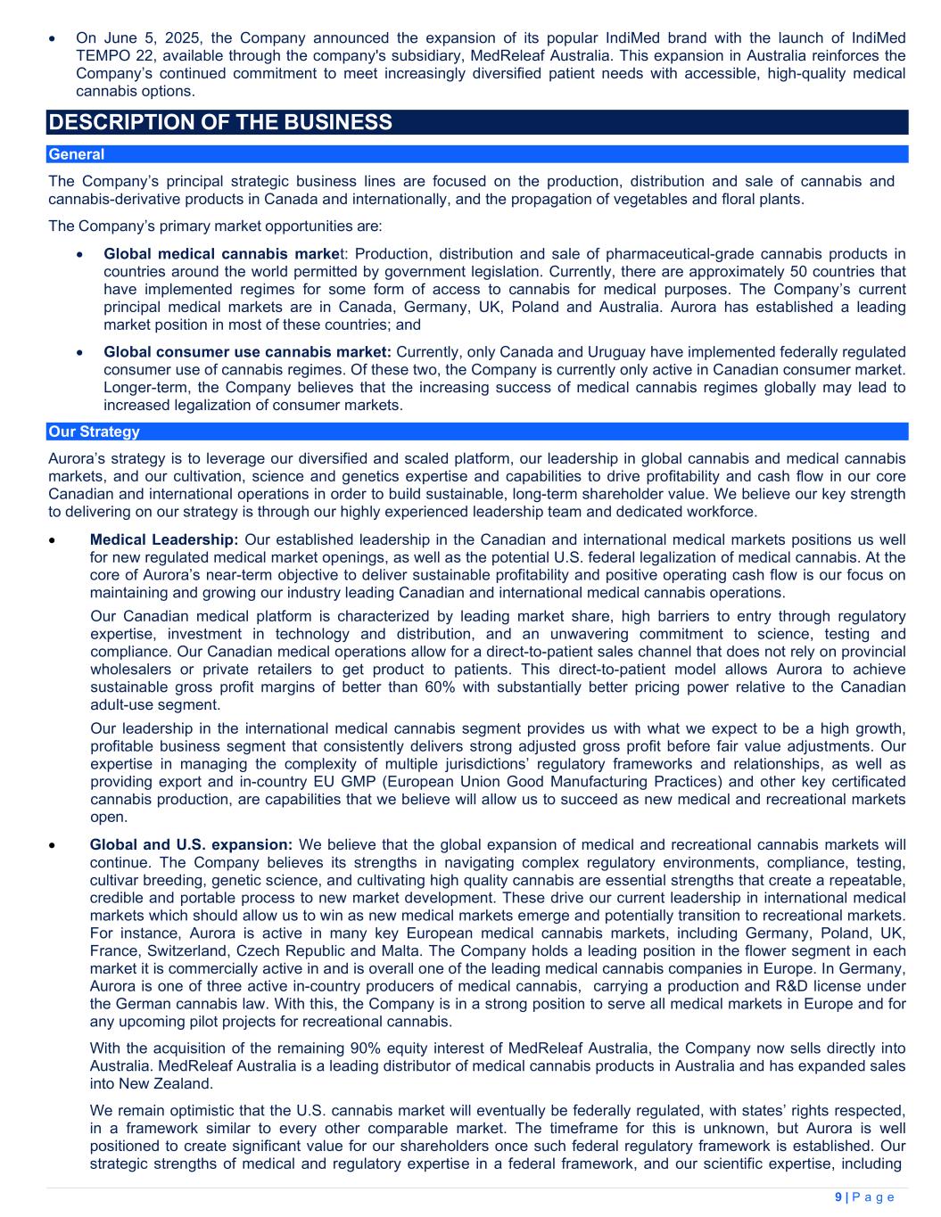 9 | P A G E业务描述General Our Strategy 2025年6月5日,公司宣布扩大其广受欢迎的IndiMed品牌,推出IndiMed TEMPO 22,可通过公司的子公司MedReleaf Australia购买。澳大利亚的这一扩张加强了该公司的持续承诺,即通过可获得的、高质量的医用大麻选择来满足日益多样化的患者需求。该公司的主要战略业务线专注于在加拿大和国际上生产、分销和销售大麻和大麻衍生产品,以及蔬菜和花卉植物的繁殖。公司的主要市场机会是:全球医用大麻市场:在政府立法允许的世界各国生产、分销和销售医药级大麻产品。目前,大约有50个国家实施了某种形式的医疗用途大麻获取制度。该公司目前的主要医疗市场在加拿大、德国、英国、波兰和澳大利亚。Aurora已在这些国家中的大多数国家建立了领先的市场地位;以及全球消费者使用大麻市场:目前,只有加拿大和乌拉圭实施了联邦监管的消费者使用大麻制度。在这两者中,该公司目前仅活跃于加拿大消费市场。从长期来看,该公司认为,全球范围内医用大麻制度的日益成功可能会导致消费市场的日益合法化。Aurora的战略是利用我们多元化和规模化的平台、我们在全球大麻和医用大麻市场的领导地位,以及我们的种植、科学和遗传学专业知识和能力,推动我们在加拿大和国际核心业务的盈利能力和现金流,以建立可持续的长期股东价值。我们相信,我们实现战略的关键优势在于我们经验丰富的领导团队和敬业的员工队伍。医疗领导:我们在加拿大和国际医疗市场建立的领导地位使我们能够很好地应对新的受监管的医疗市场开放,以及潜在的美国联邦医疗大麻合法化。Aurora实现可持续盈利能力和正经营现金流的近期目标的核心是,我们专注于维持和发展我们行业领先的加拿大和国际医用大麻业务。我们的加拿大医疗平台的特点是市场份额领先,通过监管专业知识进入的高壁垒,对技术和分销的投资,以及对科学、测试和合规的坚定不移的承诺。我们的加拿大医疗业务允许直接面向患者的销售渠道,不依赖省级批发商或私人零售商将产品送到患者手中。这种直接面向患者的模式使得Aurora能够实现高于60%的可持续毛利率,并且相对于加拿大成人使用细分市场具有明显更好的定价能力。我们在国际医用大麻领域的领先地位为我们提供了我们所期望的高增长、盈利的业务领域,在公允价值调整前始终提供强劲的调整后毛利润。我们在管理多个司法管辖区监管框架和关系的复杂性以及提供出口和国内欧盟GMP(欧盟良好生产规范)和其他关键认证大麻生产方面的专业知识,我们相信这些能力将使我们能够随着新的医疗和娱乐市场的开放而取得成功。全球和美国扩张:我们认为医疗和娱乐大麻市场的全球扩张将继续。该公司认为,其在驾驭复杂的监管环境、合规、测试、品种育种、基因科学和培育高质量大麻方面的优势是创造可重复、可信和可移植的新市场发展过程的必要优势。这些推动了我们目前在国际医疗市场的领导地位,这应该让我们能够在新的医疗市场出现并可能过渡到娱乐市场时获胜。例如,Aurora活跃于欧洲许多关键的医用大麻市场,包括德国、波兰、英国、法国、瑞士、捷克共和国和马耳他。该公司在其商业活跃的每个市场的花卉领域都处于领先地位,总体上是欧洲领先的医用大麻公司之一。在德国,Aurora是国内三家活跃的医用大麻生产商之一,持有德国大麻法规定的生产和研发许可证。有了这个, 该公司处于有利地位,可以为欧洲的所有医疗市场以及即将开展的任何休闲大麻试点项目提供服务。随着收购MedReleaf Australia剩余90%股权,公司现直接向澳大利亚销售。MedReleaf Australia是澳大利亚领先的医用大麻产品分销商,并已将销售扩展到新西兰。我们仍然乐观地认为,美国大麻市场最终将受到联邦监管,各州的权利得到尊重,框架与其他所有可比市场相似。这方面的时间框架不得而知,但一旦建立这样的联邦监管框架,Aurora就能够为我们的股东创造重大价值。我们在联邦框架内的医疗和监管专业知识的战略优势,以及我们的科学专业知识,包括