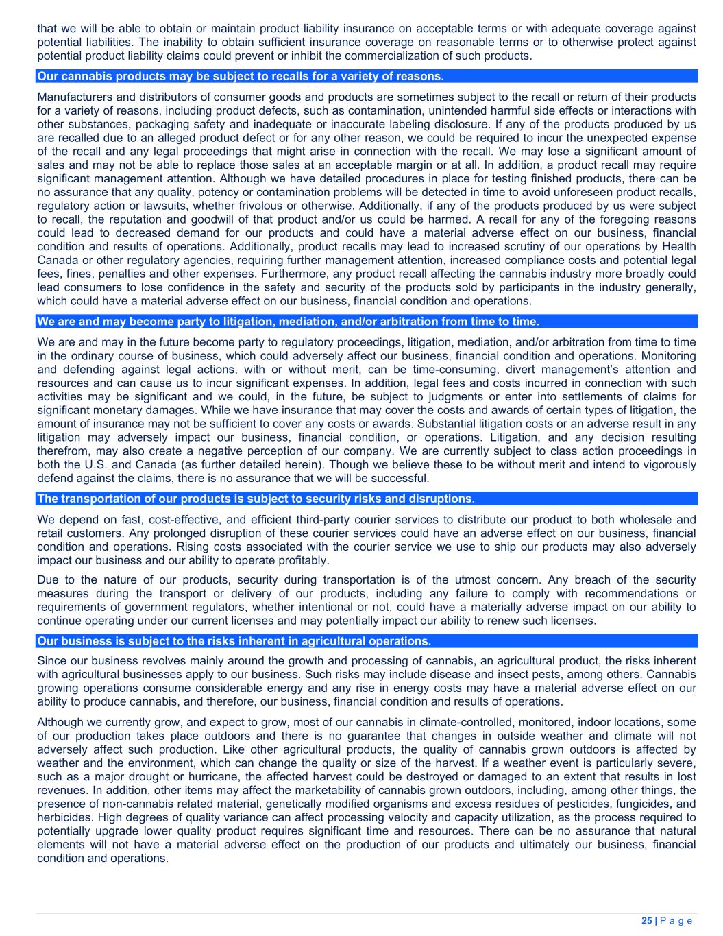 25 | P A G E我们的大麻产品可能会因多种原因被召回。我们是并可能不时成为诉讼、调解和/或仲裁的一方。我们产品的运输受到安全风险和中断的影响。我们的业务受制于农业经营中固有的风险。我们将能够以可接受的条款获得或维持产品责任保险或为潜在责任提供足够的保障。无法以合理的条款获得足够的保险范围或以其他方式保护免受潜在的产品责任索赔可能会阻止或抑制此类产品的商业化。消费品和产品的制造商和分销商有时会因多种原因被召回或退回其产品,包括产品缺陷,例如污染、意外的有害副作用或与其他物质的相互作用、包装安全以及标签披露不充分或不准确。如果我们生产的任何产品由于所谓的产品缺陷或任何其他原因被召回,我们可能会被要求承担召回的意外费用以及可能与召回相关的任何法律诉讼。我们可能会损失大量销售额,可能无法以可接受的利润率或根本无法取代这些销售额。此外,产品召回可能需要管理层的高度重视。虽然我们有测试成品的详细程序,但不能保证任何质量、效力或污染问题都会被及时检测出来,以避免意外的产品召回、监管行动或诉讼,无论是轻率的还是其他的。此外,如果我们生产的任何产品被召回,该产品和/或我们的声誉和商誉可能会受到损害。由于上述任何原因的召回可能导致对我们产品的需求减少,并可能对我们的业务、财务状况和经营业绩产生重大不利影响。此外,产品召回可能会导致加拿大卫生部或其他监管机构加强对我们运营的审查,需要管理层进一步关注,增加合规成本以及潜在的法律费用、罚款、处罚和其他费用。此外,任何更广泛地影响大麻行业的产品召回都可能导致消费者对行业参与者所售产品的安全性和安全性失去信心,这可能对我们的业务、财务状况和运营产生重大不利影响。我们现在和将来可能在日常业务过程中不时成为监管程序、诉讼、调解和/或仲裁的一方,这可能会对我们的业务、财务状况和运营产生不利影响。对法律行为进行监督和辩护,无论有无可取之处,都可能耗费时间,转移管理层的注意力和资源,并可能导致我们产生大量费用。此外,与此类活动相关的法律费用和成本可能是巨大的,我们未来可能会受到判决或就重大金钱损失达成索赔和解。虽然我们有保险,可能涵盖某些类型的诉讼的费用和裁决,但保险金额可能不足以支付任何费用或裁决。重大诉讼费用或任何诉讼的不利结果可能会对我们的业务、财务状况或运营产生不利影响。诉讼,以及由此产生的任何决定,也可能造成对我们公司的负面看法。我们目前在美国和加拿大都面临集体诉讼程序(如本文进一步详述)。尽管我们认为这些毫无价值,并打算对索赔进行有力的辩护,但无法保证我们一定会成功。我们依靠快速、高性价比、高效率的第三方快递服务,将我们的产品分销给批发和零售客户。这些快递服务的任何长期中断都可能对我们的业务、财务状况和运营产生不利影响。与我们用来运送产品的快递服务相关的成本上升也可能对我们的业务和我们的盈利运营能力产生不利影响。由于我们产品的性质,运输过程中的安全是最令人关注的问题。在我们的产品运输或交付过程中违反安全措施的任何行为,包括未能遵守政府监管机构的建议或要求,无论是否有意,都可能对我们在当前许可下继续运营的能力产生重大不利影响,并可能潜在地影响我们更新此类许可的能力。由于我们的业务主要围绕大麻这一农产品的生长和加工, 农业业务固有的风险适用于我们的业务。这些风险可能包括病虫害等。大麻种植业务消耗大量能源,能源成本的任何上升都可能对我们生产大麻的能力产生重大不利影响,从而对我们的业务、财务状况和经营业绩产生重大不利影响。尽管我们目前种植并预计会种植,但我们的大部分大麻都在气候控制、监测、室内地点,我们的一些生产发生在室外,无法保证外部天气和气候的变化不会对此类生产产生不利影响。与其他农产品一样,户外种植的大麻的质量受到天气和环境的影响,这会改变收成的质量或大小。如果天气事件特别严重,例如重大干旱或飓风,受影响的收成可能会遭到破坏或破坏,从而导致收入损失。此外,其他物品可能会影响户外种植的大麻的适销性,除其他外,包括存在非大麻相关材料、转基因生物以及杀虫剂、杀菌剂和除草剂的过量残留。高度的质量差异会影响加工速度和产能利用率,因为潜在升级较低质量产品所需的过程需要大量时间和资源。无法保证自然元素不会对我们的产品生产以及最终我们的业务、财务状况和运营产生重大不利影响。