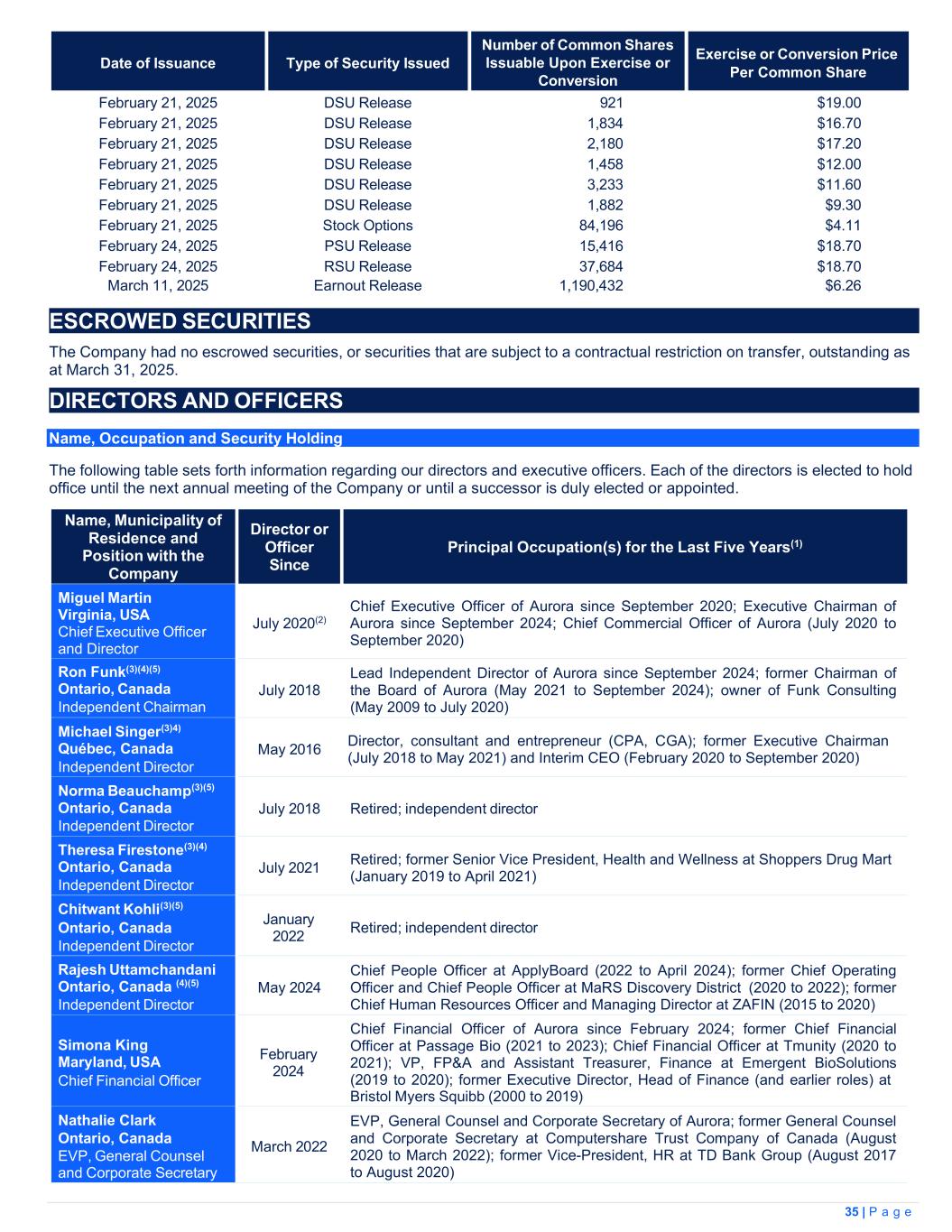 35 | P A G E发行日期证券类型已发行普通股数量在行使或转换行使或转换价格时可发行每普通股2025年2月21日DSU发行921美元19.00美元2025年2月21日DSU发行1,834美元16.70美元2025年2月21日DSU发行2,180美元17.20美元2025年2月21日DSU发行1,458美元12.00美元2025年2月21日DSU发行3,233美元11.60美元2025年2月21日DSU发行1,882美元9.30美元2025年2月21日股票期权84,196美元4.11美元2025年2月24日PSU发行15,416美元18.70美元2025年2月24日RSU发行37,684美元18.70美元3月11日,2025年收益发布1,190,432份6.26美元的托管证券截至2025年3月31日,公司没有未偿付的托管证券或受转让合同限制的证券。董事和高级管理人员的姓名、职业和安全持有下表列出了有关我们的董事和执行官的信息。每名董事均获推选任职,任期至公司下届年会或正式选出或委任继任者为止。过去五年主要职业以来公司董事或高级管理人员的姓名、居住地和职务(1)Miguel Martin Virginia,美国首席执行官兼董事2020年7月(2)Aurora首席执行官自2020年9月;Aurora执行主席自2024年9月;Aurora首席商务官(2020年7月至2020年9月)Ron Funk(3)(4)(5)加拿大安大略省独立主席2018年7月Aurora自2024年9月以来首席独立董事;Aurora前董事会主席(2021年5月至2024年9月);Funk Consulting的所有者(2009年5月至2020年7月)Michael Singer(3)4)魁北克,加拿大独立董事May 2016董事、顾问和企业家(CPA、CGA);前执行主席(2018年7月至2021年5月)和临时首席执行官(2020年2月至2020年9月)Norma Beauchamp(3)(5)加拿大安大略省独立董事2018年7月退休;独立董事Theresa Firestone(3)(4)加拿大安大略省独立董事2021年7月退休;前Shoppers Drug Mart健康与保健高级副总裁(2019年1月至2021年4月)Chitwant Kohli(3)(5)加拿大安大略省独立董事2022年1月退休;独立董事Rajesh UttamChandani Ontario,加拿大(4)(5)独立董事May 2024 ApplyBoard首席人事官(2022年至2024年4月);MaRS Discovery District前首席运营官和首席人事官(2020年至2022年);ZAFIN前首席人力资源官和董事总经理(2015年至2020年)Simona King Maryland,美国,2024年2月起担任Aurora的Passage Bio的前首席财务官;TERM3的前TERM2(2021年至2023年);Tmunity的首席财务官(2020年至2021年);Emergent BioSolutions财务副总裁、FP & A和助理财务主管(2019年至2020年);前执行董事,百时美施贵宝(2000年至2019年)财务主管(及更早的职务)Nathalie Clark Ontario,加拿大执行副总裁、总法律顾问和公司秘书2022年3月Aurora执行副总裁、总法律顾问和公司秘书;加拿大ComputerShare Trust Company前总法律顾问和公司秘书(2020年8月至2022年3月);道明银行集团前副总裁、人力资源(2017年8月至2020年8月)