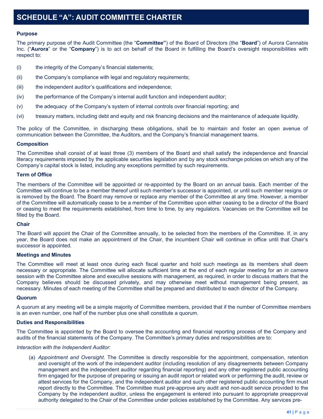 41 | PAG E宗旨Aurora Cannabis Inc.(“Aurora Cannabis Inc.”)(“Aurora”或“公司”)董事会(“董事会”)审计委员会(“委员会”)的主要宗旨是代表董事会履行董事会在以下方面的监督责任:(i)公司财务报表的完整性;(ii)公司遵守法律法规要求;(iii)独立核数师的资格和独立性;(iv)公司内部审计职能和独立核数师的履行情况;(v)公司财务报告内部控制制度是否充分;(vi)财务事项,包括债务和股权以及风险融资决策和维持充足的流动性。在履行这些义务时,委员会的政策应是维持和促进委员会、审计员和公司财务管理团队之间的公开沟通渠道。组成委员会应由至少三(3)名董事会成员组成,并应满足适用的证券法和公司任何股本上市的任何证券交易所政策规定的独立性和金融知识要求,包括此类要求允许的任何例外情况。委员会成员的任期将由董事会每年任命或重新任命。委员会的每一名成员将继续担任其成员,直至该成员的继任者被任命,或直至该成员辞职或被董事会罢免。委员会可随时罢免或更换委员会任何成员。然而,委员会成员在不再担任董事会董事或不再满足任何监管机构不时规定的要求时,将自动不再是委员会成员。委员会的空缺将由联委会填补。主席董事会将每年任命委员会主席,从委员会成员中选出。如果在任何一年,联委会没有任命主席,则现任主席将继续任职,直至任命该主席的继任者。会议和会议纪要委员会将在每个财政季度至少举行一次会议,并举行其成员认为必要或适当的会议。委员会将在每次例会结束时分配足够的时间,单独与委员会进行秘密会议,并按要求与管理层进行执行会议,以便讨论公司认为应私下讨论的事项,否则可能会在必要时在管理层不在场的情况下举行会议。委员会每次会议的会议纪录须拟备,并分发予公司每名董事。法定人数任何会议的法定人数将是委员会成员的简单多数,但如果委员会成员人数为偶数,则人数的二分之一加一即构成法定人数。职责及责任委员会由董事会委任,负责监督公司的会计及财务报告程序及审计公司的财务报表。委员会的主要职责是:与独立审计员的互动:(a)任命和监督。委员会直接负责独立审计师的任命、报酬、保留和监督工作(包括解决公司管理层和独立审计师之间关于财务报告的任何分歧)以及为编制或发布审计报告或相关工作或为公司执行审计、审查或证明服务而聘用的任何其他注册会计师事务所,独立审计师和此类其他注册会计师事务所必须直接向委员会报告。委员会必须预先批准独立审计员向公司提供的任何审计和非审计服务,除非聘用是根据委员会制定的政策授予委员会主席的适当预先批准权力进行的。Any services pre-schedule“a”:audit committee charter