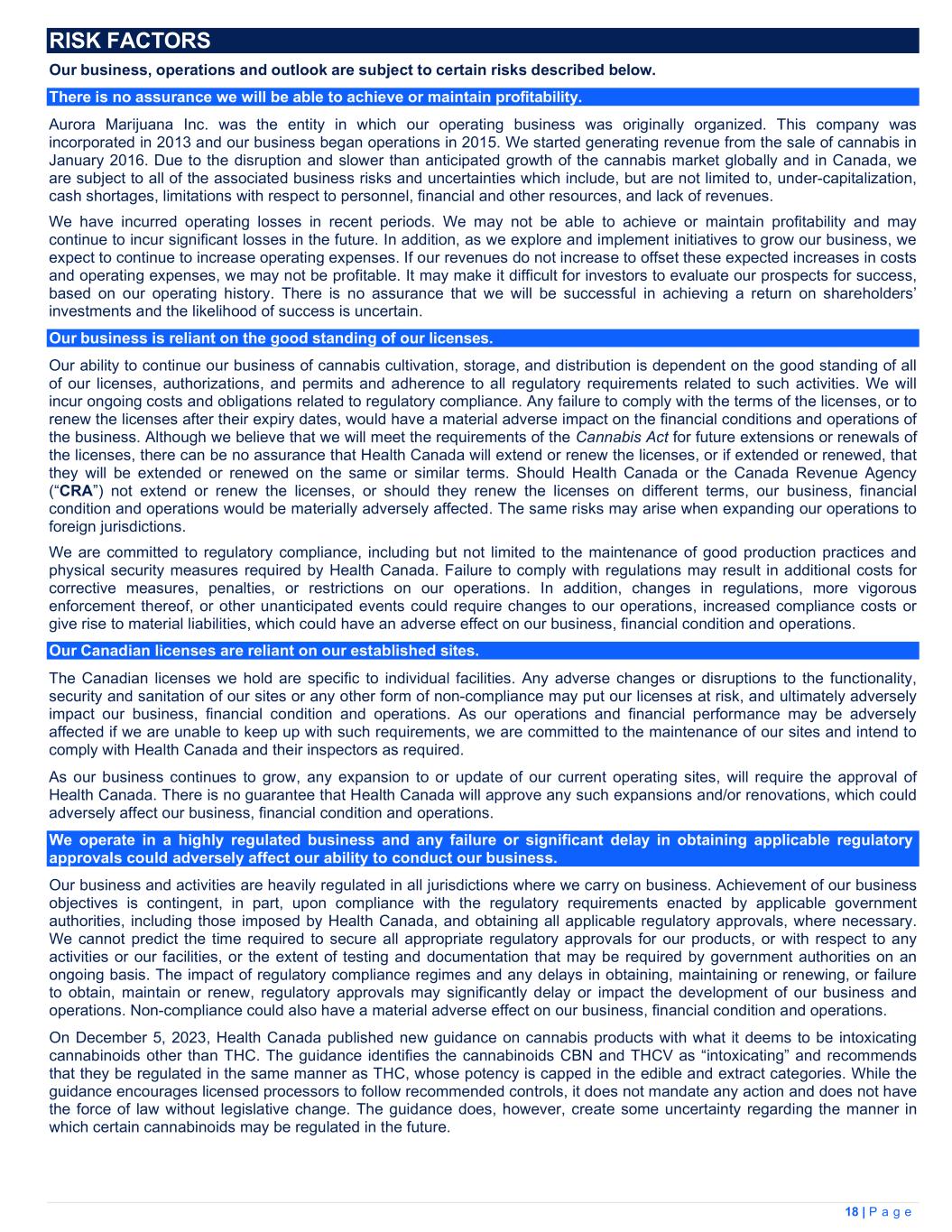 18 | P A G E无法保证我们将能够实现或保持盈利。我们的业务依赖于我们的许可证的良好信誉。我们的加拿大许可证依赖于我们已建立的站点。我们经营的业务受到高度监管,在获得适用的监管批准方面的任何失败或重大延迟都可能对我们开展业务的能力产生不利影响。我们的业务、运营和前景受到以下描述的某些风险的影响。Aurora Marijuana Inc.是我们最初组织经营业务的实体。这家公司成立于2013年,我们的业务于2015年开始运营。我们从2016年1月开始通过销售大麻获得收入。由于全球和加拿大大麻市场的中断和增长慢于预期,我们受到所有相关业务风险和不确定性的影响,这些风险和不确定性包括但不限于资本不足、现金短缺、人员、财务和其他资源方面的限制以及缺乏收入。我们在最近几个时期发生了经营亏损。我们可能无法实现或保持盈利,并可能在未来继续产生重大亏损。此外,随着我们探索和实施业务增长的举措,我们预计将继续增加运营费用。如果我们的收入没有增加以抵消这些预期的成本和运营费用的增加,我们可能无法盈利。这可能会使投资者难以根据我们的经营历史评估我们的成功前景。无法保证我们将成功实现股东投资回报,成功的可能性不确定。我们继续开展大麻种植、储存和分销业务的能力取决于我们所有许可证、授权和许可的良好信誉,以及遵守与此类活动相关的所有监管要求。我们将承担与监管合规相关的持续成本和义务。任何未能遵守许可证条款,或在许可证到期后续期,将对业务的财务状况和运营产生重大不利影响。尽管我们认为我们将满足《大麻法》对未来许可证延期或更新的要求,但无法保证加拿大卫生部将延长或更新许可证,或者如果延长或更新,它们将以相同或类似的条款延长或更新。如果加拿大卫生部或加拿大税务局(“CRA”)不延长或更新许可证,或者他们以不同条款更新许可证,我们的业务、财务状况和运营将受到重大不利影响。在将我们的业务扩展到外国司法管辖区时,可能会出现同样的风险。我们致力于监管合规,包括但不限于维持加拿大卫生部要求的良好生产规范和实体安全措施。不遵守规定可能会导致纠正措施、处罚或限制我们的运营的额外成本。此外,法规的变化、更有力的执行或其他意外事件可能需要改变我们的运营、增加合规成本或产生重大负债,这可能对我们的业务、财务状况和运营产生不利影响。我们持有的加拿大许可证具体针对个别设施。对我们网站的功能、安全和卫生的任何不利变化或中断或任何其他形式的不合规行为都可能使我们的许可证面临风险,并最终对我们的业务、财务状况和运营产生不利影响。由于如果我们无法跟上此类要求,我们的运营和财务业绩可能会受到不利影响,我们致力于维护我们的站点,并打算按要求遵守加拿大卫生部及其检查员的规定。随着我们业务的持续增长,对我们现有运营场所的任何扩展或更新,都需要获得加拿大卫生部的批准。无法保证加拿大卫生部将批准任何可能对我们的业务、财务状况和运营产生不利影响的此类扩建和/或翻新。我们的业务和活动在我们开展业务的所有司法管辖区都受到严格监管。我们业务目标的实现部分取决于遵守适用的政府当局制定的监管要求,包括加拿大卫生部规定的要求,并在必要时获得所有适用的监管批准。我们无法预测为我们的产品或任何活动或我们的设施获得所有适当监管批准所需的时间, 或政府当局可能持续要求的测试和文件的范围。监管合规制度的影响以及在获得、维持或更新方面的任何延迟,或未能获得、维持或更新监管批准,可能会显着延迟或影响我们的业务和运营的发展。不遵守规定也可能对我们的业务、财务状况和运营产生重大不利影响。2023年12月5日,加拿大卫生部发布了关于含有其认为是除THC外的令人陶醉的大麻素的大麻产品的新指南。该指南认定大麻素CBN和THCV“令人陶醉”,并建议以与可食用和提取物类别中的效力上限的THC相同的方式对其进行监管。虽然该指南鼓励获得许可的加工商遵循建议的控制措施,但它没有强制要求采取任何行动,并且在没有立法变更的情况下没有法律效力。然而,该指南确实为未来某些大麻素的监管方式带来了一些不确定性。风险因素
