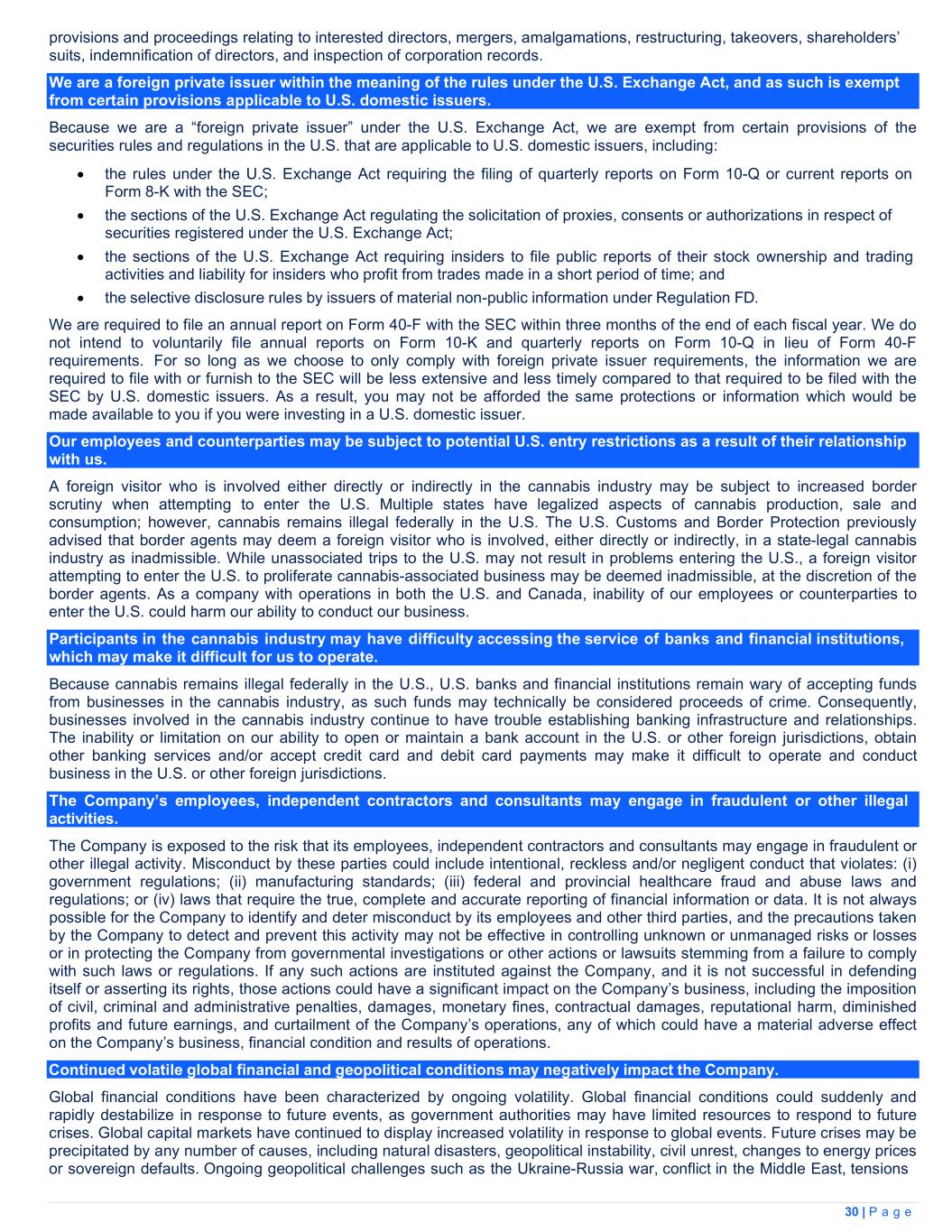 30 | P A G E我们是美国《交易法》规则所指的外国私人发行人,因此不受适用于美国国内发行人的某些条款的约束。我们的员工和交易对手可能会因为与我们的关系而受到潜在的美国入境限制。大麻行业的参与者可能难以获得银行和金融机构的服务,这可能使我们难以经营。公司的雇员、独立承建商和顾问可能从事欺诈或其他非法活动。有关利害关系董事、合并、合并、重组、接管、股东诉讼、赔偿董事和查阅公司记录的规定和程序。因为我们是美国《交易法》规定的“外国私人发行人”,我们不受适用于美国国内发行人的美国证券规则和条例的某些规定的约束,其中包括:美国《交易法》规定的要求向SEC提交表格10-Q的季度报告或表格8-K的当前报告的规则;美国《交易法》中规范代理征集的条款,关于根据《美国交易法》注册的证券的同意或授权;《美国交易法》中要求内部人就其股票所有权和交易活动以及从短时间内进行的交易获利的内部人的责任提交公开报告的条款;以及FD条例下重大非公开信息发行人的选择性披露规则。我们被要求在每个财政年度结束后的三个月内向SEC提交40-F表格的年度报告。我们不打算自愿提交10-K表格的年度报告和10-Q表格的季度报告,以代替40-F表格的要求。只要我们选择只遵守外国私人发行人的要求,与美国国内发行人要求向SEC提交的信息相比,我们被要求向SEC提交或提供的信息将不那么广泛,也不那么及时。因此,如果您投资于美国国内发行人,您可能无法获得与您相同的保护或信息。直接或间接参与大麻行业的外国游客在试图进入美国时可能会受到更严格的边境审查。多个州已将大麻生产、销售和消费的各个方面合法化;然而,大麻在美国联邦仍然是非法的。美国海关和边境保护局此前表示,边境特工可能会认为直接或间接参与国家合法大麻产业的外国访客不可接受。虽然非关联的赴美旅行可能不会导致进入美国的问题,但外国访客试图进入美国以扩散与大麻相关的业务可能被视为不可接受,由边境人员酌情决定。作为一家在美国和加拿大都有业务的公司,我们的员工或交易对手无法进入美国可能会损害我们开展业务的能力。由于大麻在美国联邦仍然是非法的,美国的银行和金融机构仍然对接受大麻行业企业的资金持谨慎态度,因为这类资金在技术上可能被视为犯罪所得。因此,涉及大麻行业的企业继续难以建立银行基础设施和关系。无法或限制我们在美国或其他外国司法管辖区开立或维持银行账户、获得其他银行服务和/或接受信用卡和借记卡付款的能力,可能会使我们难以在美国或其他外国司法管辖区经营和开展业务。公司面临员工、独立承包商和顾问可能从事欺诈或其他非法活动的风险。这些方面的不当行为可能包括故意、鲁莽和/或疏忽行为,违反:(i)政府法规;(ii)制造标准;(iii)联邦和省级医疗保健欺诈和滥用法律法规;或(iv)要求真实、完整和准确报告财务信息或数据的法律。公司并不总是能够识别和阻止员工和其他第三方的不当行为,公司为发现和防止这种活动而采取的预防措施可能无法有效控制未知或未管理的风险或损失,或无法保护公司免受因未能遵守此类法律或法规而引起的政府调查或其他行动或诉讼。如对公司提起任何该等诉讼,而其未能成功进行自我辩护或主张其权利, 这些行动可能对公司的业务产生重大影响,包括施加民事、刑事和行政处罚、损害赔偿、罚款、合同损害、名誉损害、利润和未来收益减少以及限制公司运营,其中任何一项都可能对公司的业务、财务状况和经营业绩产生重大不利影响。持续波动的全球金融和地缘政治状况可能会对公司产生负面影响。全球金融状况的特点是持续波动。由于政府当局应对未来危机的资源可能有限,全球金融状况可能会因应未来事件而突然迅速破坏稳定。全球资本市场继续表现出加剧的波动性,以应对全球事件。未来的危机可能由多种原因促成,包括自然灾害、地缘政治不稳定、内乱、能源价格变化或主权违约。持续的地缘政治挑战,如乌俄战争、中东冲突、紧张局势