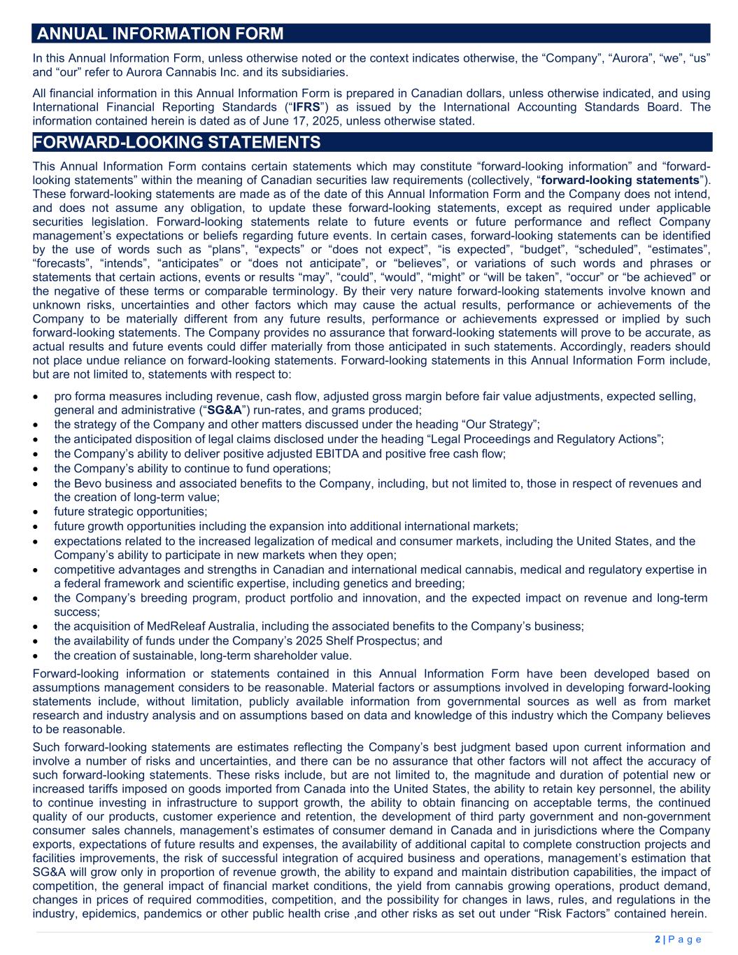 2 |本年度信息表中的P a g e年度信息表,除另有说明或上下文另有说明外,“公司”、“Aurora”、“我们”、“我们”和“我们的”均指Aurora Cannabis Inc.及其子公司。本年度信息表中的所有财务信息均以加元编制,除非另有说明,并采用国际会计准则理事会颁布的国际财务报告准则(“IFRS”)。除非另有说明,本文所载信息的日期截至2025年6月17日。前瞻性陈述本年度信息表包含某些陈述,这些陈述可能构成加拿大证券法要求含义内的“前瞻性信息”和“前瞻性陈述”(统称为“前瞻性陈述”)。这些前瞻性陈述是在本年度信息表日期作出的,公司不打算也不承担任何义务更新这些前瞻性陈述,除非适用的证券法要求。前瞻性陈述与未来事件或未来业绩相关,反映了公司管理层对未来事件的预期或信念。在某些情况下,前瞻性陈述可以通过使用诸如“计划”、“预期”或“不预期”、“预期”、“预算”、“计划”、“估计”、“预测”、“打算”、“预期”或“不预期”或“相信”等词语来识别,或某些行动、事件或结果“可能”、“可能”、“将”、“可能”或“将采取”、“发生”或“将实现”或这些术语或类似术语的否定词和短语或陈述的变体。就其本质而言,前瞻性陈述涉及已知和未知的风险、不确定性和其他因素,这些因素可能导致公司的实际结果、业绩或成就与此类前瞻性陈述明示或暗示的任何未来结果、业绩或成就存在重大差异。该公司不保证前瞻性陈述将被证明是准确的,因为实际结果和未来事件可能与此类陈述中的预期存在重大差异。因此,读者不应过分依赖前瞻性陈述。本年度信息表中的前瞻性陈述包括但不限于以下方面的陈述:备考指标,包括收入、现金流、公允价值调整前的调整后毛利率、预期销售、一般和行政(“SG & A”)运行率,和克生产;在“我们的战略”标题下讨论的公司战略和其他事项;在“法律程序和监管行动”标题下披露的法律索赔的预期处置;公司交付正的调整后EBITDA和正的自由现金流的能力;公司继续为运营提供资金的能力;Bevo业务和对公司的相关利益,包括但不限于,那些与收入和创造长期价值有关的;未来的战略机会;未来的增长机会,包括向更多国际市场的扩张;与包括美国在内的医疗和消费市场日益合法化相关的预期,以及公司在新市场开放时参与新市场的能力;在加拿大和国际医用大麻方面的竞争优势和优势,联邦框架内的医疗和监管专业知识以及科学专业知识,包括遗传学和育种;公司的育种计划、产品组合和创新,以及对收入和长期成功的预期影响;收购MedReleaf Australia,包括对公司业务的相关利益;公司2025年货架招股说明书下的资金可用性;以及创造可持续的、长期的股东价值。本年度信息表中包含的前瞻性信息或陈述是根据管理层认为合理的假设制定的。制定前瞻性陈述所涉及的重大因素或假设包括但不限于来自政府来源的公开信息以及来自市场研究和行业分析的信息,以及基于公司认为合理的该行业的数据和知识的假设。此类前瞻性陈述是反映公司基于当前信息的最佳判断的估计,涉及许多风险和不确定性,无法保证其他因素不会影响此类前瞻性陈述的准确性。这些风险包括但不限于对从加拿大进口到美国的商品可能征收新的或增加的关税的幅度和持续时间, 留住关键人员的能力、继续投资于基础设施以支持增长的能力、以可接受的条件获得融资的能力、我们产品的持续质量、客户体验和保留、第三方政府和非政府消费者销售渠道的发展、管理层对加拿大和公司出口的司法管辖区的消费者需求的估计、对未来结果和费用的预期、完成建设项目和设施改进的额外资本的可用性、成功整合所收购业务和运营的风险,管理层估计,SG & A的增长将仅取决于收入增长的比例、扩大和维持分销能力的能力、竞争的影响、金融市场状况的一般影响、大麻种植业务的收益、产品需求、所需商品的价格变化、竞争、以及行业法律、规则和法规发生变化的可能性、流行病、流行病或其他公共卫生危机,以及此处包含的“风险因素”中列出的其他风险。