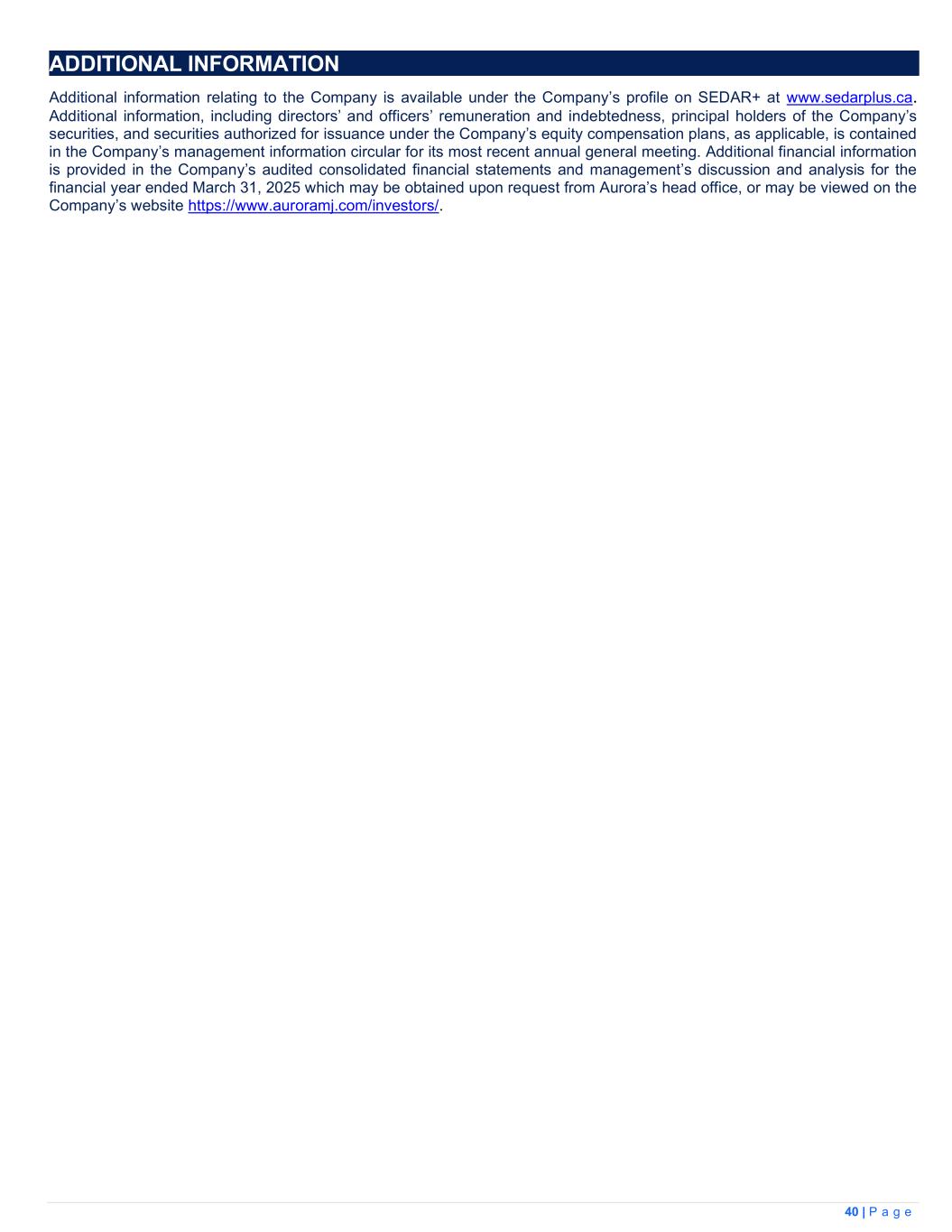 40 | P a g e更多信息有关公司的更多信息可在SEDAR +上的公司简介中查阅,网址为www.sedarplus.ca。其他信息,包括董事和高级职员的薪酬和债务、公司证券的主要持有人以及根据公司股权补偿计划授权发行的证券(如适用),均载于公司最近一次年度股东大会的管理层信息通告。额外财务资料载于公司截至2025年3月31日止财政年度的经审核综合财务报表及管理层的讨论及分析,可向Aurora总部索取,或可于公司网站https://www.auroramj.com/investors/查阅。