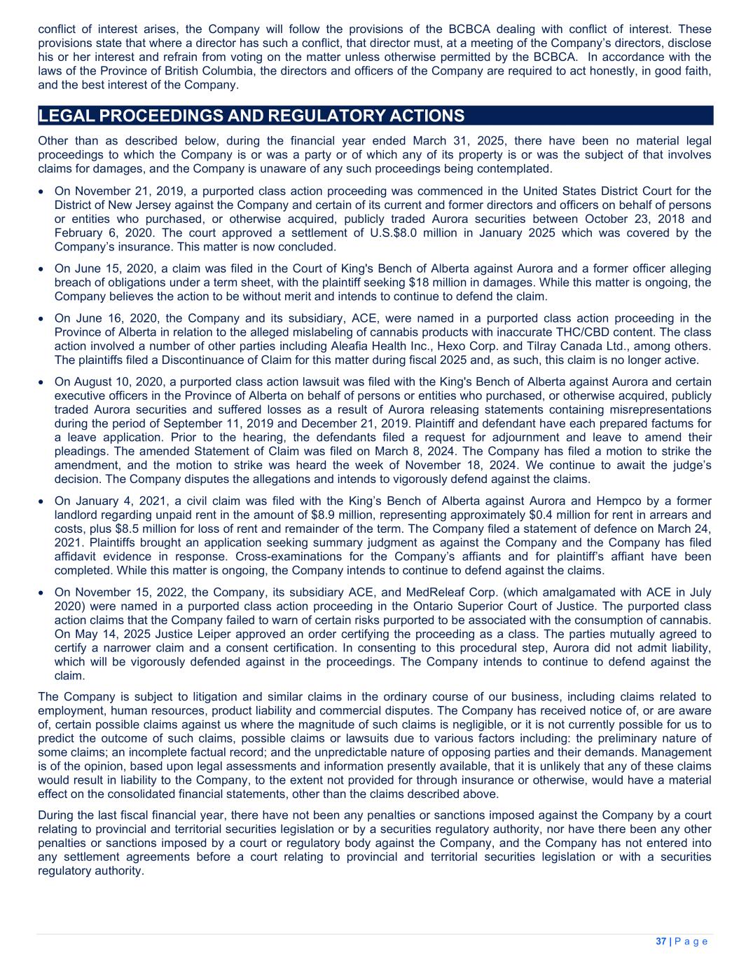 37 | P A G E出现利益冲突,公司将按照BCBCA的规定处理利益冲突。这些条款规定,如果董事有此类冲突,该董事必须在公司董事会议上披露他或她的利益,并且除非BCBCA另有许可,否则不得就该事项进行投票。根据不列颠哥伦比亚省的法律,公司的董事和高级管理人员必须诚实行事,本着诚信和公司的最大利益。除下文所述外的法律程序及监管行动,于截至2025年3月31日止财政年度内,并无公司是或曾经是一方的重大法律程序或其任何财产是或曾经是涉及损害赔偿索赔的标的的重大法律程序,且公司并不知悉正在考虑的任何该等程序。2019年11月21日,代表在2018年10月23日至2020年2月6日期间购买或以其他方式获得公开交易的Aurora证券的个人或实体,在美国新泽西州地区法院对公司及其某些现任和前任董事和高级职员启动了所谓的集体诉讼程序。法院于2025年1月批准了一项800万美元的和解协议,该协议由公司保险承保。这件事现在了结。2020年6月15日,阿尔伯塔省国王法庭向Aurora和一名前官员提出索赔,指控其违反了条款清单规定的义务,原告要求赔偿1800万美元。虽然此事正在进行中,但该公司认为该诉讼毫无根据,并打算继续为索赔进行辩护。2020年6月16日,该公司及其子公司ACE在阿尔伯塔省的一项据称集体诉讼程序中被点名,该诉讼涉及涉嫌对含有不准确的THC/CBD含量的大麻产品进行错误标签。该集体诉讼涉及多个其他方,包括Aleafia Health Inc.、HEXO Corp.和Tilray Canada Ltd.等。原告在2025财年期间就此事提出了终止索赔,因此,这一索赔不再有效。2020年8月10日,Aurora代表购买或以其他方式获得公开交易的Aurora证券的个人或实体向艾伯塔省国王法庭提起了所谓的集体诉讼,并因Aurora在2019年9月11日和2019年12月21日期间发布包含虚假陈述的声明而蒙受损失。原告和被告各自准备了请假申请的事实材料。开庭前,被告提出休庭请求,准许修改诉状。修正后的索赔声明于2024年3月8日提交。公司已提出动议,要求就修正案进行罢工,并于2024年11月18日当周听取罢工动议。我们继续等待法官的裁决。该公司对指控提出异议,并打算对索赔进行有力的抗辩。2021年1月4日,一名前房东就未付租金890万美元向艾伯塔省国王法庭提出民事索赔,涉及未付租金890万美元,约合40万美元的拖欠租金和费用,外加850万美元的租金损失和剩余期限。公司于2021年3月24日提交了答辩状。原告提出申请,要求对公司作出即决判决,公司已提交誓章证据作为回应。公司誓章及原告誓章的质证工作已完成。在此事项进行期间,公司打算继续针对索赔进行抗辩。2022年11月15日,该公司、其子公司ACE和MedReleaf Corp.(于2020年7月与ACE合并)在安大略省高等法院的所谓集体诉讼程序中被点名。所谓的集体诉讼声称,该公司未能就声称与大麻消费相关的某些风险发出警告。2025年5月14日,Leiper法官批准了一项命令,证明该程序为集体诉讼。双方相互同意对较窄的索赔和同意证明进行认证。在同意这一程序性步骤中,Aurora没有承认责任,这将在诉讼程序中得到有力的辩护。公司打算继续抗辩索赔。公司在我们的日常业务过程中受到诉讼和类似索赔,包括与雇佣、人力资源、产品责任和商业纠纷有关的索赔。公司已收到通知,或已知悉针对我们的某些可能索赔,而此类索赔的规模可以忽略不计, 或由于多种因素,包括:部分索赔的初步性质;不完整的事实记录;以及对方当事人及其诉求的不可预见性,我们目前无法预测此类索赔、可能的索赔或诉讼的结果。管理层认为,根据法律评估和目前可获得的信息,这些索赔中的任何一项都不太可能导致对公司的赔偿责任,只要不是通过保险或其他方式提供的,就会对综合财务报表产生重大影响,但上述索赔除外。于上一个财政年度内,并无任何有关省及地区证券法例的法院或证券监管机构对公司作出的任何处罚或制裁,亦无任何法院或监管机构对公司作出的任何其他处罚或制裁,公司亦无就有关省及地区证券法例的法院或与证券监管机构订立任何和解协议。