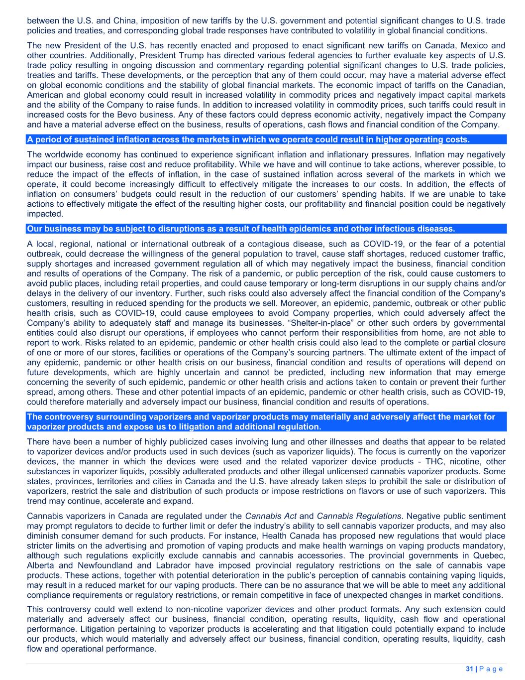 31 |我们经营所在市场的持续通胀可能会导致更高的经营成本。我们的业务可能会因健康流行病和其他传染病而受到干扰。围绕汽化器和汽化器产品的争议可能会对汽化器产品市场产生重大不利影响,并使我们面临诉讼和额外监管。美国和中国之间,美国政府征收新关税以及美国贸易政策和条约可能发生的重大变化,以及相应的全球贸易反应,都导致了全球金融状况的波动。美国新任总统近日颁布并提议对加拿大、墨西哥等国实施重大新关税。此外,特朗普总统已指示各联邦机构进一步评估美国贸易政策的关键方面,导致正在就美国贸易政策、条约和关税的潜在重大变化进行讨论和评论。这些事态发展,或认为其中任何一种情况都可能发生,可能对全球经济状况和全球金融市场的稳定产生重大不利影响。关税对加拿大、美国和全球经济的经济影响可能导致大宗商品价格波动加剧,并对资本市场和公司融资能力产生负面影响。除了大宗商品价格波动加剧外,这类关税还可能导致Bevo业务的成本增加。任何这些因素都可能抑制经济活动,对公司产生负面影响,并对公司的业务、经营业绩、现金流和财务状况产生重大不利影响。全球经济持续承受着显著的通胀和通胀压力。通货膨胀可能会对我们的业务产生负面影响,提高成本并降低盈利能力。尽管我们已经并将继续采取行动,尽可能减少通货膨胀影响的影响,但在我们经营所在的几个市场出现持续通货膨胀的情况下,有效缓解我们成本的增加可能会变得越来越困难。此外,通货膨胀对消费者预算的影响可能会导致我们客户的消费习惯减少。如果我们不能采取行动有效减轻由此导致的更高成本的影响,我们的盈利能力和财务状况可能会受到负面影响。本地、区域、国家或国际爆发传染性疾病,例如新冠肺炎,或对潜在疫情爆发的恐惧,可能会降低一般民众的出行意愿、造成人手短缺、客户流量减少、供应短缺和政府监管加强,所有这些都可能对公司的业务、财务状况和经营业绩产生负面影响。大流行的风险,或公众对风险的看法,可能导致客户避开公共场所,包括零售物业,并可能导致我们的供应链暂时或长期中断和/或延迟交付我们的库存。此外,此类风险还可能对公司客户的财务状况产生不利影响,从而导致我们销售产品的支出减少。此外,流行病、大流行病、爆发或其他公共卫生危机,如新冠疫情,可能会导致员工避开公司物业,这可能会对公司配备充足人员和管理业务的能力产生不利影响。如果无法在家中履行职责的员工无法上班,政府实体的“就地避难”或其他此类命令也可能扰乱我们的运营。与流行病、大流行病或其他健康危机相关的风险也可能导致我们的一个或多个商店、设施或公司采购合作伙伴的业务完全或部分关闭。任何流行病、大流行病或其他健康危机对我们的业务、财务状况和经营业绩的最终影响程度将取决于未来的发展,这些发展具有高度不确定性,无法预测,包括可能出现的有关此种流行病、大流行病或其他健康危机的严重性的新信息以及为遏制或防止其进一步传播而采取的行动等。因此,流行病、大流行病或其他健康危机的这些和其他潜在影响,例如新冠肺炎,可能对我们的业务、财务状况和经营业绩产生重大不利影响。出现了一些高度宣传的涉及肺部和其他疾病和死亡的案例,这些案例似乎与蒸发器装置和/或此类装置中使用的产品(如蒸发器液体)有关。目前的焦点是蒸发器装置, 装置的使用方式及相关的蒸发器装置产品-THC、尼古丁、蒸发器液体中的其他物质、可能掺假的产品和其他非法的无证大麻蒸发器产品。加拿大和美国的一些州、省、地区和城市已经采取措施,禁止销售或分销蒸发器,限制此类产品的销售和分销或对此类蒸发器的口味或使用施加限制。这一趋势或将延续、加速并扩大。加拿大的大麻蒸发器受《大麻法》和《大麻条例》监管。负面的公众情绪可能会促使监管机构决定进一步限制或推迟该行业销售大麻蒸发器产品的能力,还可能减少消费者对这类产品的需求。例如,加拿大卫生部提出了新的法规,将对电子烟产品的广告和促销设置更严格的限制,并强制要求电子烟产品的健康警告,尽管这类法规明确排除了大麻和大麻配件。魁北克省、阿尔伯塔省、纽芬兰省和拉布拉多省的省政府对大麻电子烟产品的销售实施了省级监管限制。这些行动,加上公众对含有雾化液体的大麻的看法可能恶化,可能会导致我们的雾化产品市场减少。无法保证我们将能够满足任何额外的合规要求或监管限制,或在面对市场条件的意外变化时保持竞争力。这一争议很可能会延伸到非尼古丁蒸发器设备和其他产品形式。任何此类延期都可能对我们的业务、财务状况、经营业绩、流动性、现金流和经营业绩产生重大不利影响。与蒸发器产品有关的诉讼正在加速,诉讼可能会扩大到包括我们的产品,这将对我们的业务、财务状况、经营业绩、流动性、现金流和经营业绩产生重大不利影响。