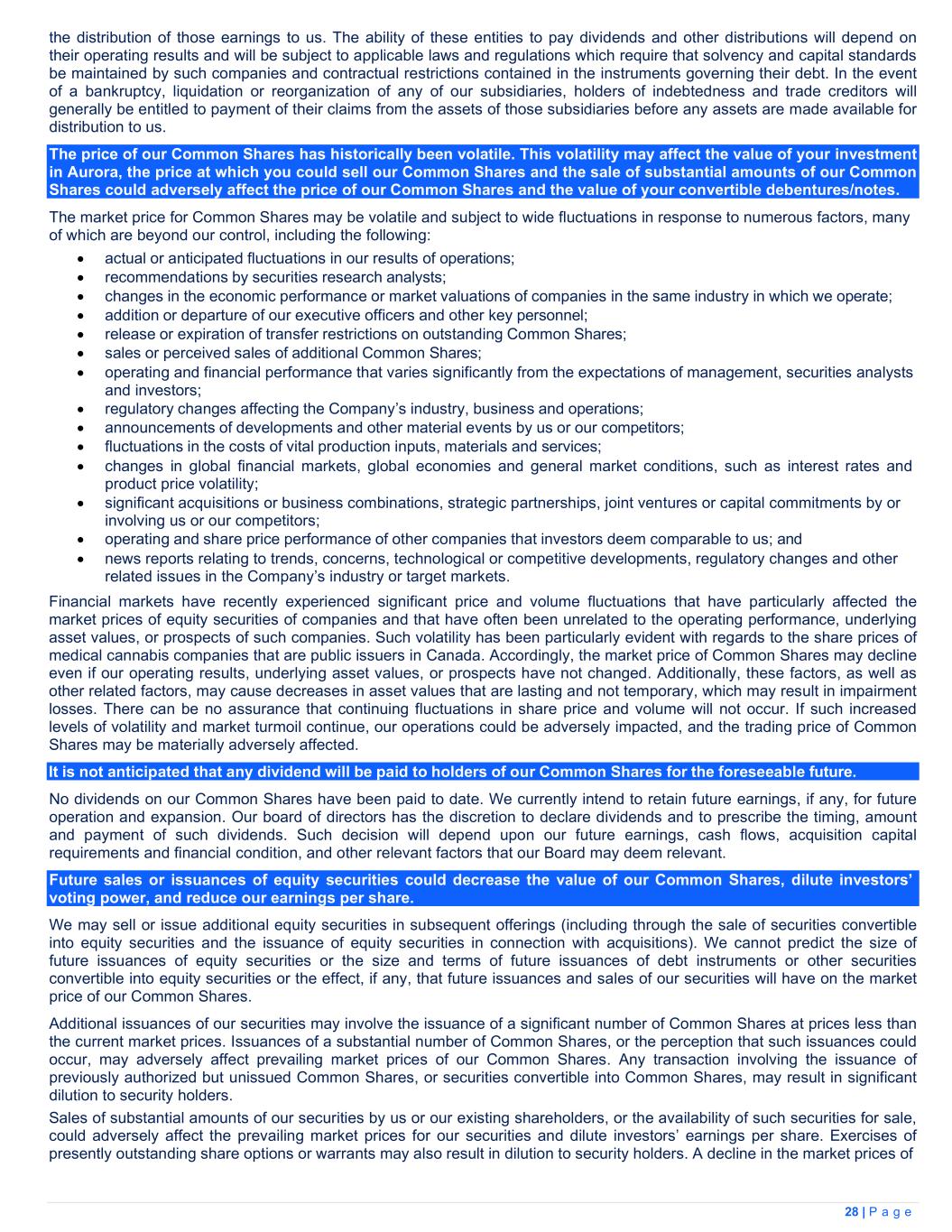 28 |从历史上看,我们普通股的价格一直在波动。这种波动可能会影响贵公司在Aurora的投资价值,贵公司可以出售我们普通股的价格以及大量出售我们的普通股可能会对我们普通股的价格和贵公司可转换债券/票据的价值产生不利影响。未来出售或发行股本证券可能会降低我们普通股的价值,稀释投资者的投票权,并减少我们的每股收益。这些收益分配给我们。这些实体支付股息和其他分配的能力将取决于其经营业绩,并将受到适用法律法规的约束,这些法律法规要求这些公司维持偿付能力和资本标准,以及管理其债务的工具中包含的合同限制。如果我们的任何子公司发生破产、清算或重组,债务持有人和贸易债权人一般将有权在任何资产可供分配给我们之前从这些子公司的资产中获得其债权的偿付。普通股的市场价格可能会波动,并会因应众多因素而出现宽幅波动,其中许多因素是我们无法控制的,包括以下内容:我们经营业绩的实际或预期波动;证券研究分析师的建议;我们经营所在的同行业公司的经济表现或市场估值的变化;我们的执行官和其他关键人员的新增或离职;已发行普通股的转让限制解除或到期;额外普通股的出售或预期出售;与管理层、证券分析师和投资者的预期存在显着差异的经营和财务业绩;影响公司所处行业的监管变化,业务和运营;我们或我们的竞争对手宣布发展和其他重大事件;重要生产投入、材料和服务的成本波动;全球金融市场、全球经济和一般市场状况的变化,例如利率和产品价格波动;我们或我们的竞争对手进行或涉及的重大收购或业务合并、战略合作伙伴关系、合资企业或资本承诺;投资者认为与我们相当的其他公司的运营和股价表现;以及与趋势、关注、技术或竞争发展有关的新闻报道,公司所处行业或目标市场的监管变化及其他相关问题。金融市场最近经历了重大的价格和数量波动,这尤其影响了公司股本证券的市场价格,并且往往与这类公司的经营业绩、基础资产价值或前景无关。对于在加拿大公开发行的医用大麻公司的股价而言,这种波动尤为明显。因此,即使我们的经营业绩、基础资产价值或前景没有改变,普通股的市场价格也可能下降。此外,这些因素以及其他相关因素可能会导致资产价值的下降是持续的而不是暂时的,这可能会导致减值损失。不能保证股价和成交量的持续波动不会发生。如果这种加剧的波动和市场动荡持续下去,我们的运营可能会受到不利影响,普通股的交易价格可能会受到重大不利影响。预计在可预见的未来不会向我们普通股的持有者支付任何股息。到目前为止,我们的普通股没有支付股息。我们目前打算保留未来的收益,如果有的话,用于未来的运营和扩张。我们的董事会有酌情权宣布股息,并规定股息的时间、金额和支付。这样的决定将取决于我们未来的收益、现金流、收购资本要求和财务状况,以及我们董事会可能认为相关的其他相关因素。我们可能会在后续发行中出售或发行额外的股本证券(包括通过出售可转换为股本证券的证券和发行与收购有关的股本证券)。我们无法预测未来发行股本证券的规模或未来发行债务工具或其他可转换为股本证券的证券的规模和条款或影响(如有), 未来发行和出售我们的证券将对我们普通股的市场价格产生影响。我们的证券的额外发行可能涉及以低于当前市场价格的价格发行大量普通股。发行大量普通股,或认为可能发生此类发行,可能会对我们普通股的现行市场价格产生不利影响。任何涉及发行先前已获授权但未发行的普通股或可转换为普通股的证券的交易,都可能导致证券持有人的重大稀释。我们或我们的现有股东出售大量我们的证券,或有此类证券可供出售,可能会对我们证券的现行市场价格产生不利影响,并稀释投资者的每股收益。行使目前尚未行使的购股权或认股权证也可能导致对证券持有人的稀释。的市场价格下降