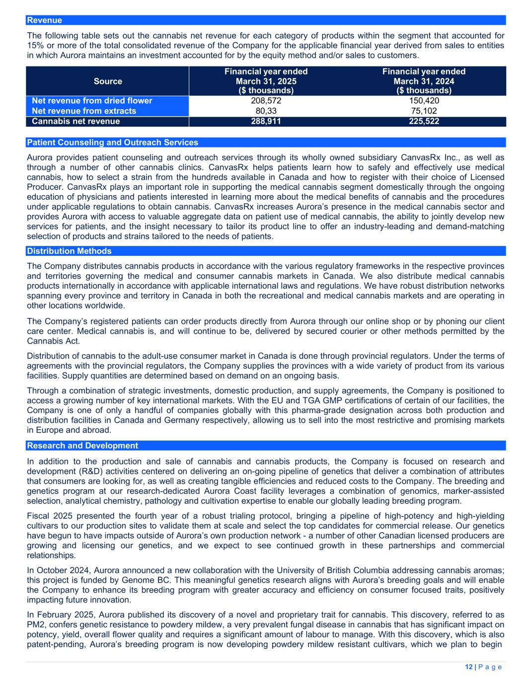 12 | P A G E患者咨询和外展服务分销方法研发下表列出了分部内各类别产品的大麻净收入占适用财政年度公司综合总收入15%或以上的部分,这些收入来源于向Aurora保持投资的实体的销售和/或向客户的销售。来源截至2025年3月31日的财政年度(千美元)截至2024年3月31日的财政年度(千美元)干花净收入208,572150,420提取物净收入80,3375,102 Cannabis净收入288,911225,522 Aurora通过其全资子公司CanvasRx Inc.以及其他一些大麻诊所提供患者咨询和外联服务。CanvasRx帮助患者学习如何安全有效地使用医用大麻,如何从加拿大现有的数百个毒株中选择一个毒株,以及如何向他们选择的许可生产商注册。CanvasRX通过对有兴趣更多地了解大麻的医疗益处以及根据适用法规获得大麻的程序的医生和患者进行持续教育,在支持国内的医用大麻部分方面发挥着重要作用。CanvasRx增加了Aurora在医用大麻领域的影响力,并为Aurora提供了获取有关患者使用医用大麻的宝贵汇总数据的途径、共同为患者开发新服务的能力,以及定制其产品线以提供针对患者需求的行业领先和需求匹配的产品和菌株选择所需的洞察力。该公司根据加拿大医疗和消费大麻市场相关省份和地区的各种监管框架分销大麻产品。我们还根据适用的国际法律法规在国际上分销医用大麻产品。我们在娱乐和医用大麻市场拥有遍布加拿大每个省和地区的强大分销网络,并在全球其他地区开展业务。公司的注册患者可以通过我们的网店或致电我们的客户护理中心直接从Aurora订购产品。医用大麻现在并将继续通过有担保的快递或《大麻法》允许的其他方式交付。向加拿大成人使用消费市场分销大麻是通过省级监管机构完成的。根据与省级监管机构的协议条款,公司通过其各种设施向各省供应种类繁多的产品。供应数量是根据持续的需求确定的。通过战略投资、国内生产和供应协议的结合,公司有能力进入越来越多的关键国际市场。凭借我们某些设施的欧盟和TGA GMP认证,该公司是全球少数几家分别在加拿大和德国的生产和分销设施中拥有这一制药级指定的公司之一,这使我们能够向欧洲和国外限制最严格和最有前景的市场进行销售。除了生产和销售大麻和大麻产品外,该公司还专注于研发(R & D)活动,其核心是提供持续的基因管道,提供消费者所期待的属性组合,以及为公司创造切实的效率和降低成本。我们研究专用的Aurora Coast设施的育种和遗传学项目利用了基因组学、标记辅助选择、分析化学、病理学和栽培专业知识的组合,以实现我们全球领先的育种项目。2025财年提出了一项稳健的试验方案的第四年,为我们的生产基地带来了一系列高效和高产品种,以大规模验证它们并选择商业发布的顶级候选者。我们的基因已经开始在Aurora自己的生产网络之外产生影响——许多其他加拿大许可生产商正在种植并许可我们的基因,我们希望看到这些合作伙伴关系和商业关系的持续增长。2024年10月,Aurora宣布与不列颠哥伦比亚大学开展新的合作,解决大麻香气问题;该项目由Genome BC资助。这项有意义的遗传学研究符合Aurora的育种目标,将使该公司能够在以消费者为中心的性状上以更高的精确度和效率增强其育种计划,从而对未来的创新产生积极影响。2025年2月,Aurora公布了其发现的一种新的大麻专有特性。这一发现,简称PM2, 赋予白粉病遗传抗性,这是一种在大麻中非常普遍的真菌病,对效力、产量、整体花卉质量有重大影响,需要大量劳动力来管理。有了这项也在申请专利的发现,Aurora的育种计划现在正在开发抗白粉病的品种,我们计划开始收入