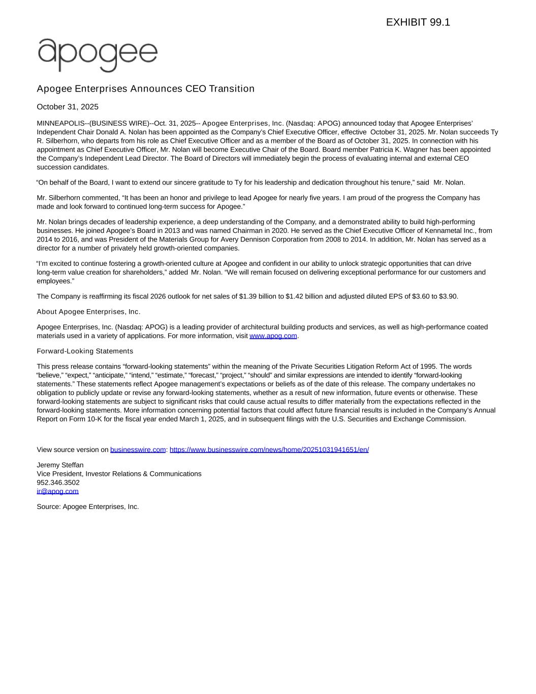 爱宝奇宣布首席执行官换届2025年10月31日明尼阿波利斯--(BUSINESS WIRE)--2025年10月31日--Apogee Enterprises, Inc.(纳斯达克:APOG)今天宣布,爱宝奇的独立主席Donald A. NolanTERM0 Donald A. Nolan TERM5已被任命为公司首席执行官,自2025年10月31日起生效。诺兰先生将接替自2025年10月31日起担任首席执行官和董事会成员的Ty R. Silberhorn。由于被任命为首席执行官,诺兰先生将成为董事会执行主席。董事会成员Patricia K. Wagner已被任命为公司的独立首席董事。董事会将立即开始评估内部和外部CEO继任人选的过程。诺兰表示:“我谨代表董事会向Ty表示衷心感谢,感谢他在整个任期内的领导和奉献精神。”Silberhorn先生评论说:“领导Apogee近五年是一种荣幸和荣幸。我为公司取得的进步感到自豪,并期待Apogee继续取得长期成功。”诺兰先生带来了数十年的领导经验、对公司的深刻理解,以及展现出的打造高绩效业务的能力。他于2013年加入Apogee董事会,并于2020年被任命为董事长。他曾于2014年至2016年担任Kennametal Inc.的首席执行官,并于2008年至2014年担任艾利丹尼森公司材料集团总裁。此外,诺兰先生还担任过多家私营成长型公司的董事。诺兰补充道:“我很高兴能继续在Apogee培养以增长为导向的文化,并对我们释放战略机会的能力充满信心,这些机会可以推动为股东创造长期价值。”“我们将继续专注于为我们的客户和员工提供卓越的业绩。”该公司重申2026财年净销售额预期为13.9亿美元至14.2亿美元,调整后摊薄后每股收益为3.60美元至3.90美元。关于Apogee Enterprises, Inc.Apogee Enterprises, Inc.(纳斯达克:APOG)是一家领先的建筑建筑产品和服务提供商,同时还提供应用于多种领域的高性能涂层材料。欲了解更多信息,请访问www.apog.com。前瞻性陈述本新闻稿包含1995年《私人证券诉讼改革法案》含义内的“前瞻性陈述”。“相信”、“预期”、“预期”、“打算”、“估计”、“预测”、“项目”、“应该”等类似表述旨在识别“前瞻性陈述”。这些声明反映了Apogee管理层截至本新闻稿发布之日的期望或信念。该公司不承担公开更新或修改任何前瞻性陈述的义务,无论是由于新信息、未来事件或其他原因。这些前瞻性陈述受到重大风险的影响,可能导致实际结果与前瞻性陈述中反映的预期存在重大差异。有关可能影响未来财务业绩的潜在因素的更多信息包含在该公司截至2025年3月1日的财政年度的10-K表格年度报告中,以及随后提交给美国证券交易委员会的文件中。在businesswire.com上查看源代码版本:https://www.businesswire.com/news/home/20251031941651/en/Jeremy Steffan投资者关系与传播副总裁952.346.3502 ir@apog.com来源:Apogee Enterprises, Inc.展览99.1