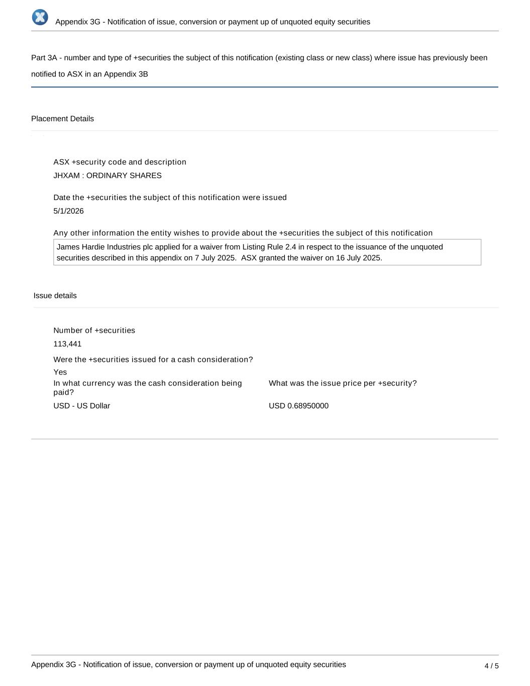 附录3G-未上市股本证券的发行、转换或缴款通知附录3G-发行通知,未上市股本证券的转换或缴款4/5第3A部分-本通知标的(现有类别或新类别)的+证券的数量和类型,其中问题先前已在附录3B中通知ASX配售详情ASX +证券代码和说明JHXAM:普通股日期本通知标的的+证券已发行2026年5月1日实体希望提供的有关本通知标的的+证券的任何其他信息詹姆斯哈迪 plc于2025年7月7日就本附录所述的未上市证券的发行申请了上市规则第2.4条的豁免。ASX于2025年7月16日授予该豁免。发行详情+证券数量113,441 +证券是以现金对价发行的吗?现金对价是用什么货币支付的?美元-美元每+证券发行价是多少?0.68 950000美元是