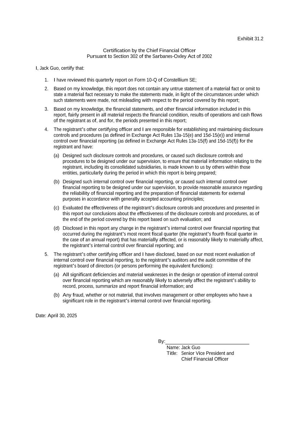 附件 31.2 首席财务官根据2002年《萨班斯-奥克斯利法案》第302条I,Jack Guo证明:1。我已审阅了这份关于Constellium SE表格10-Q的季度报告;2。据我所知,本报告不包含任何对重大事实的不真实陈述或遗漏陈述作出所作陈述所必需的重大事实,鉴于作出此类陈述的情况,对本报告所涵盖的期间没有误导;3。根据我所知,本报告所载的财务报表和其他财务信息,在所有重大方面公允地反映了截至本报告所列期间和期间的财务状况、经营成果和登记人的现金流量;4。注册人的其他认证人员和我负责为注册人建立和维护披露控制和程序(定义见《交易法》规则13a-15(e)和15d-15(e))以及财务报告内部控制(定义见《交易法》规则13a-15(f)和15d-15(f)),并已:(a)设计了此类披露控制和程序,或使此类披露控制和程序在我们的监督下设计,以确保与注册人有关的重要信息,包括其合并子公司,由这些实体内的其他人向我们公布,特别是在本报告编写期间;(b)设计了对财务报告的这种内部控制,或使财务报告的这种内部控制在我们的监督下设计,以便为财务报告的可靠性和根据公认会计原则为外部目的编制财务报表提供合理保证;(c)评估了注册人披露控制和程序的有效性,并在本报告中提出了我们关于披露控制和程序有效性的结论,截至本报告所述期间结束时基于此种评估;(d)在本报告中披露在注册人最近一个财政季度(如为年度报告,则为注册人的第四个财政季度)期间发生的对注册人财务报告内部控制产生重大影响或合理可能产生重大影响的任何变更;以及5。根据我们最近对财务报告内部控制的评估,我和注册人的其他核证人已向注册人的审计员和注册人董事会审计委员会(或履行同等职能的人员)披露:(a)财务报告内部控制的设计或运作中存在的所有重大缺陷和重大缺陷,这些缺陷和缺陷合理地可能会对注册人记录、处理、汇总和报告财务信息的能力产生不利影响;(b)任何欺诈行为,无论是否重大,涉及在注册人财务报告内部控制中具有重要作用的管理层或其他员工。日期:2025年4月30日作者:姓名:Jack Guo职务:高级副总裁兼首席财务官