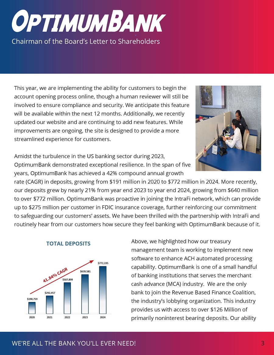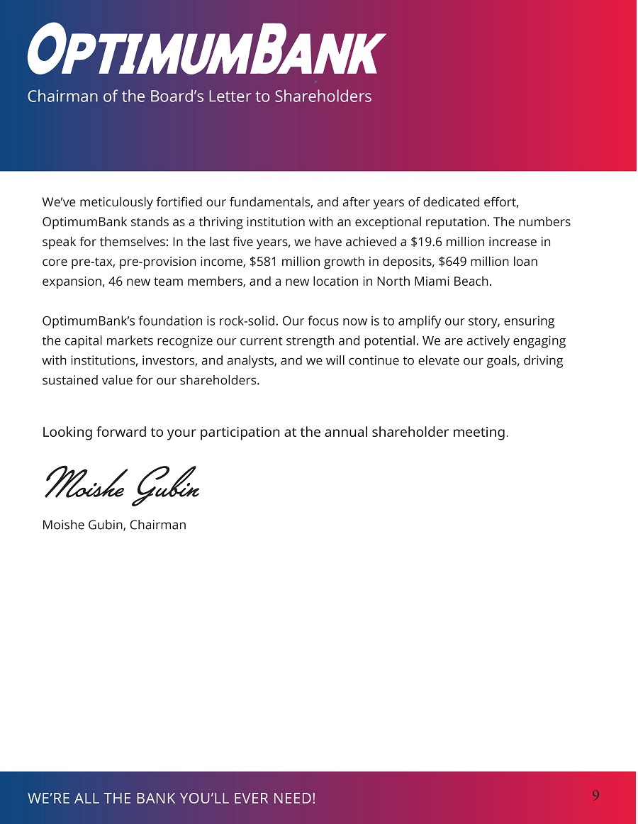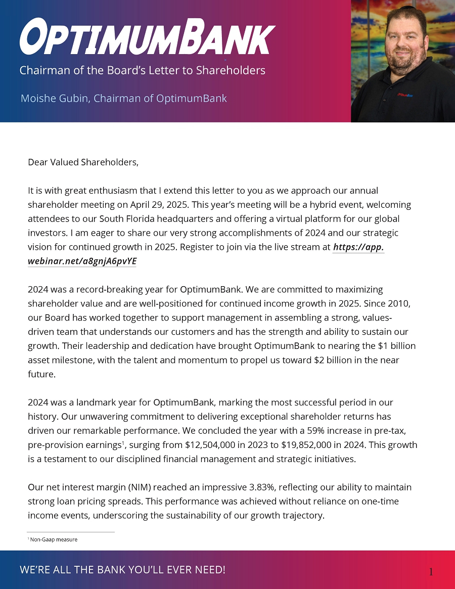 关于2025年4月29日召开的股东大会代理材料备查的重要通知。我们的2024年10-K表格委托书和年度报告可在https://optimumbankinvestors.com/上查阅