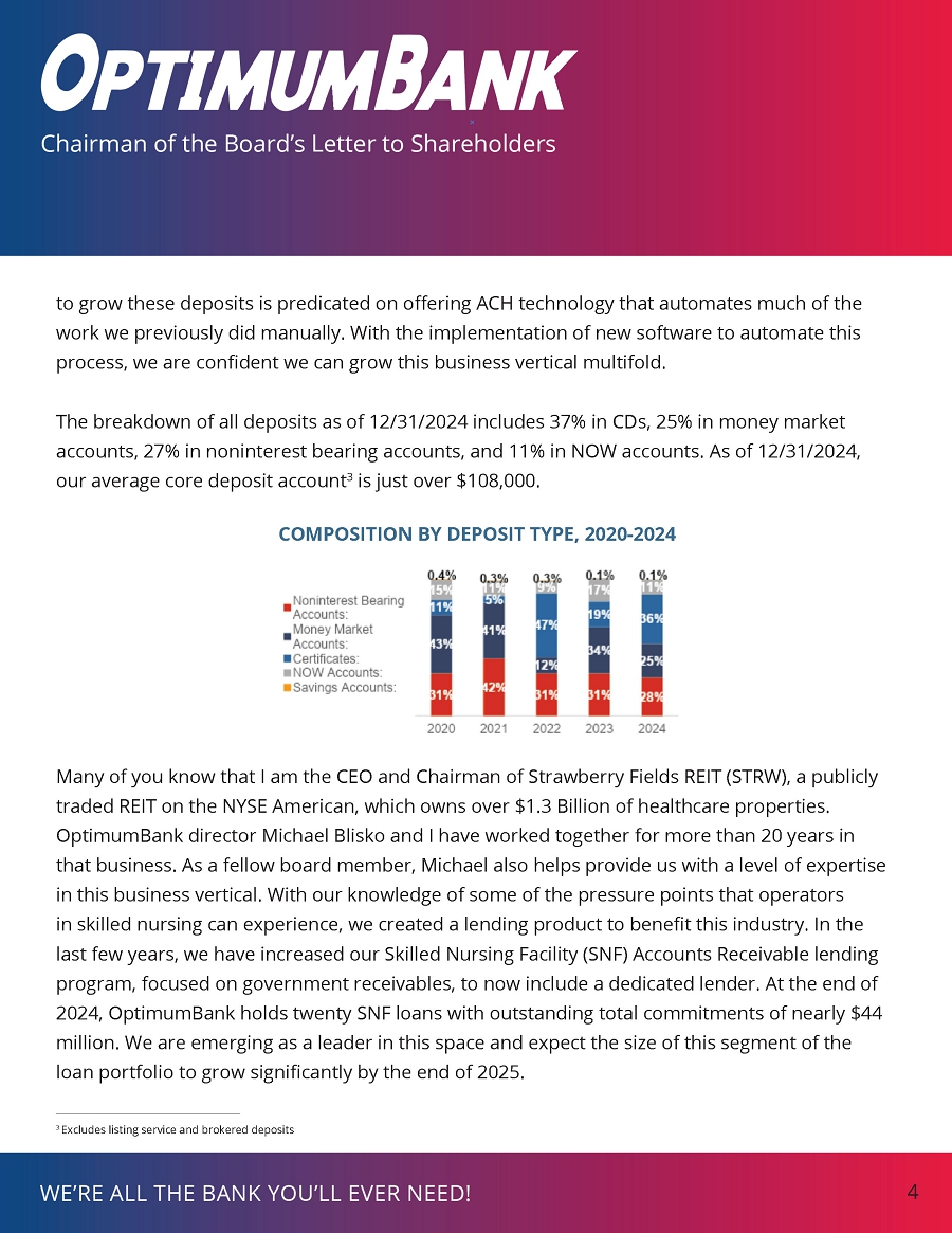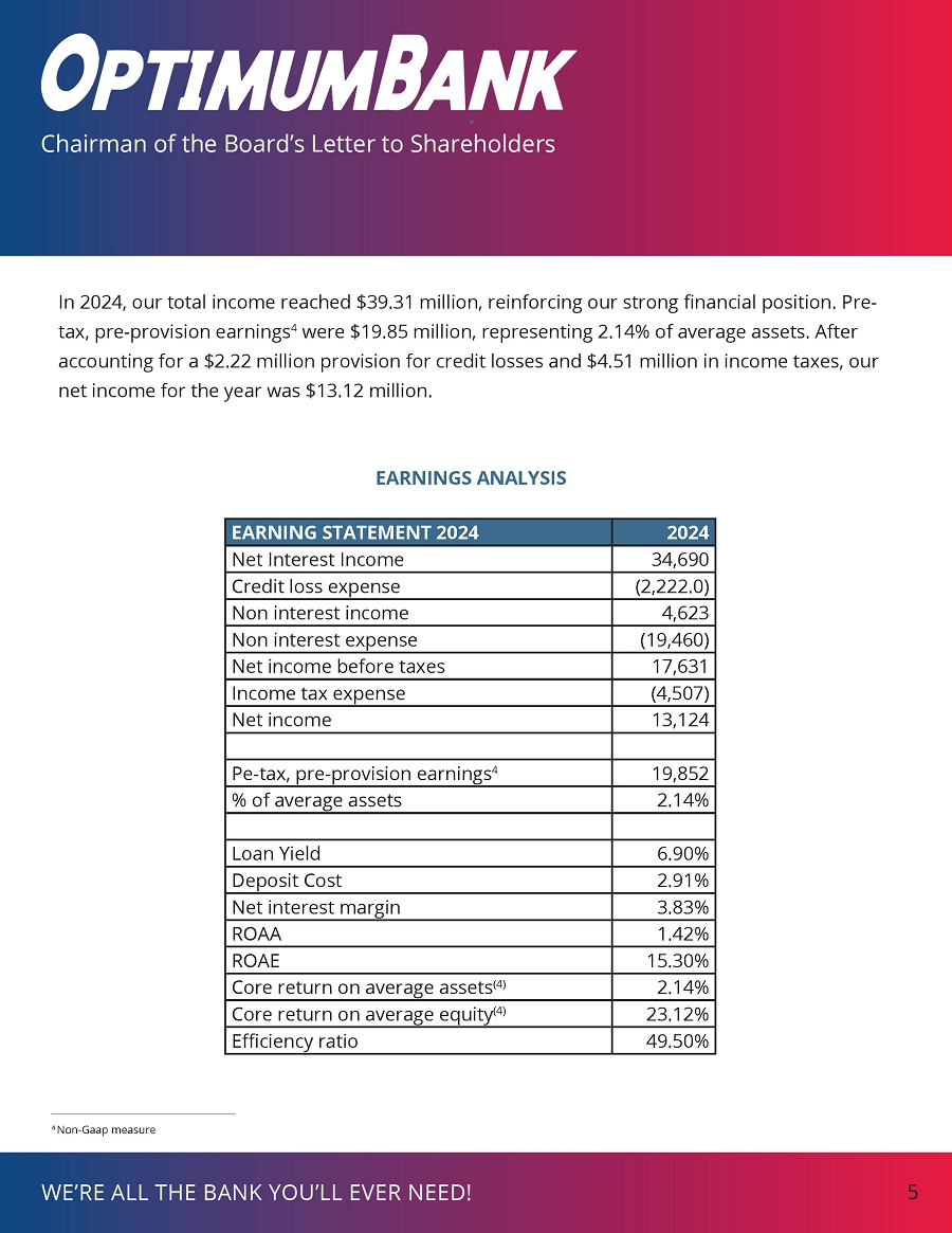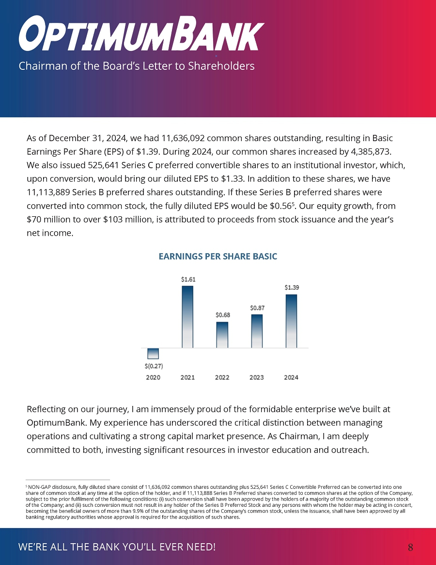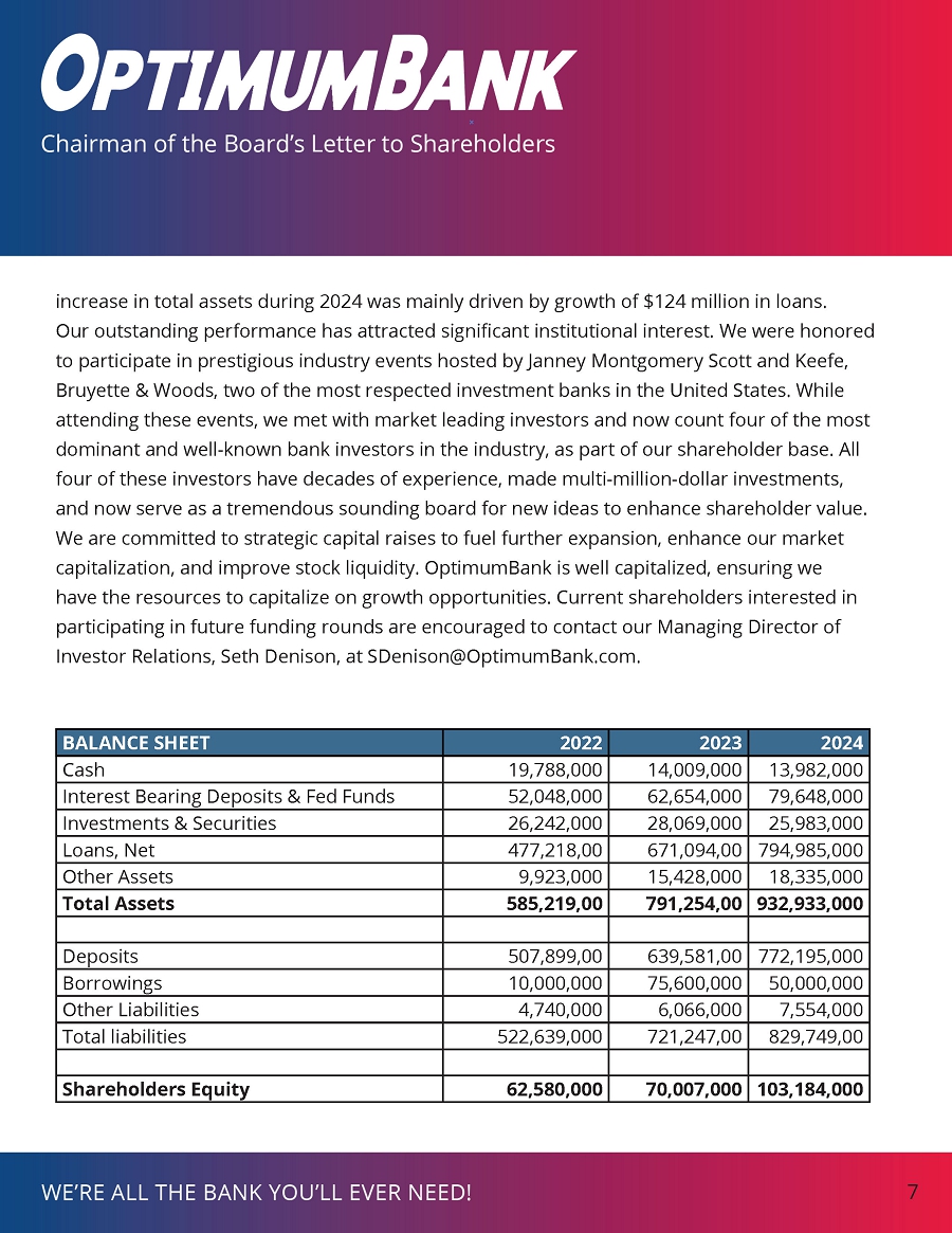 关于2025年4月29日召开的股东大会代理材料备查的重要通知。我们的2024年10-K表格委托书和年度报告可在https://optimumbankinvestors.com/上查阅