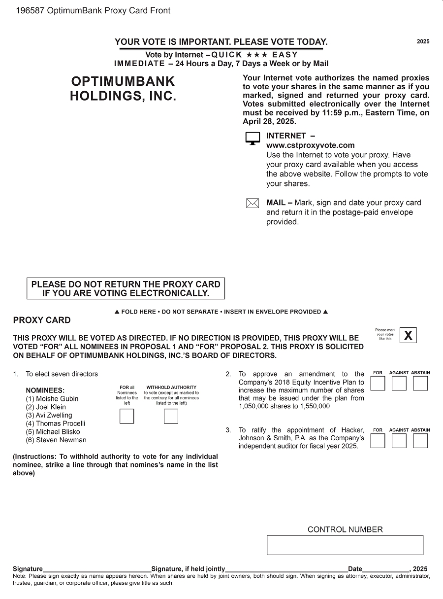 于2025年3月21日收市时登记在册的股东将有权在会议上根据所持每一股份的一票表决权进行投票。截至记录日期,Optimumbank Holding已发行普通股的登记股东总数约为1,490名,已发行普通股11,751,082股。