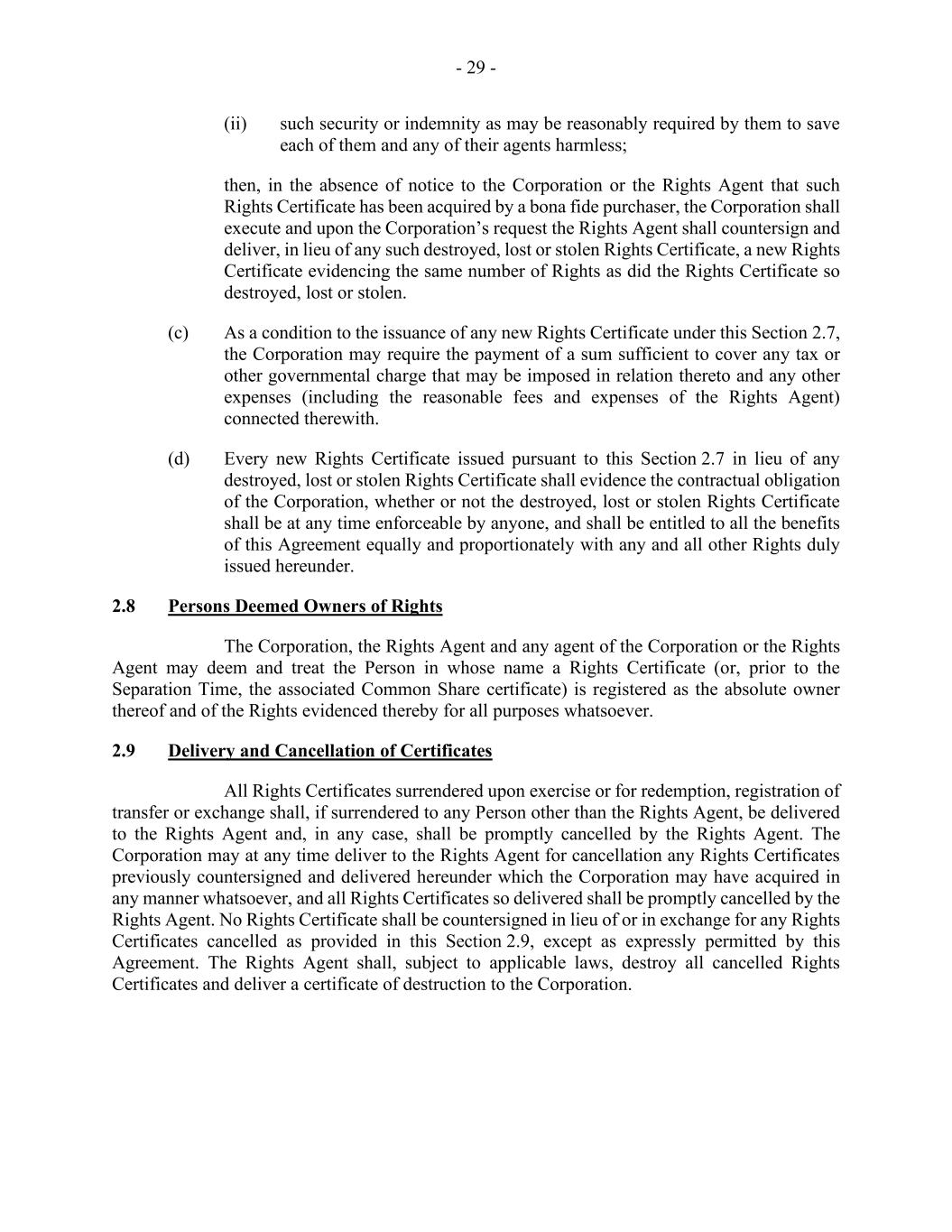 -29-(ii)他们为使每个人及其任何代理人免受损害而合理要求的担保或赔偿;然后,在没有通知公司或权利代理人该权利证书已由善意购买者取得的情况下,公司应签立并应公司的请求,权利代理人应会签并交付一份新的权利证书,以代替任何该等已销毁、遗失或被盗的权利证书,以证明与如此销毁、遗失或被盗的权利证书相同数量的权利。(c)作为根据本条第2.7条发出任何新的权利证书的条件,公司可要求支付一笔款项,足以支付可能就该等新权利证书征收的任何税项或其他政府收费,以及与该等新权利证书有关的任何其他开支(包括权利代理人的合理费用及开支)。(d)依据本条第2.7条发出的每一份新的权利证书,以代替任何已销毁、遗失或被盗的权利证书,须证明公司的合约义务,不论该已销毁、遗失或被盗的权利证书是否可在任何时间由任何人强制执行,并有权与根据本协议妥为发出的任何及所有其他权利平等及成比例地享有本协议的所有利益。2.8被视为权利所有人的人公司、权利代理人和公司的任何代理人或权利代理人可将权利证书(或在分立时间之前,相关的普通股证书)以其名义登记的人视为并将其视为其绝对所有人,以及为所有目的而由此证明的权利的绝对所有人。2.9证书的交付和注销在行使时或为赎回而交还的所有权利证书,转让或交换登记,如交还给权利代理人以外的任何人,应交付给权利代理人,无论如何,应由权利代理人及时注销。公司可随时向权利代理人交付公司可能以任何方式取得的任何先前在本协议下会签和交付的权利凭证以供注销,如此交付的所有权利凭证应由权利代理人迅速注销。除本协议明确允许的情况外,不得在权利证书上进行会签,以代替或交换本第2.9节规定取消的任何权利证书。权利代理人应在不违反适用法律的情况下,销毁所有已注销的权利证书,并向公司交付销毁证书。