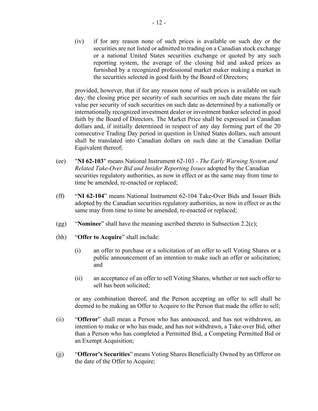 -12-(iv)如果由于任何原因在该日没有任何此类价格可用,或证券未在加拿大证券交易所或美国国家证券交易所上市或获准交易,或由任何此类报告系统报价,则由在董事会善意选择的证券中做市的公认专业做市商提供的收盘价和要价的平均值;但前提是,如果由于任何原因,在该日没有任何此类价格可用,此类证券在该日期的每份证券的收盘价是指由国家或国际认可的投资交易商或董事会善意选择的投资银行家确定的此类证券在该日期的每份证券的公允价值。市场价格应以加元表示,如果最初就构成所涉连续20个交易日期间的一部分的任何一天以美元确定,则该金额应在该日期按其等值加元换算成加元;(ee)“NI 62-103”是指加拿大证券监管机构采用的National Instrument 62-103-加拿大证券监管机构采用的预警系统和相关收购要约和内幕报告问题,如现在生效或可能不时修订,(ff)“NI 62-104”是指加拿大证券监管机构通过的National Instrument 62-104收购要约和发行人要约,如现在生效或可能不时修订、重新颁布或取代;(gg)“被提名人”应具有第2.2(c)款所赋予的含义;(hh)“收购要约”应包括:(i)购买要约或出售有表决权股份的要约邀请或作出该要约或邀请的意向的公开公告;(ii)接受出售有表决权股份的要约,无论该出售要约是否已被征求;或其任何组合,而接受出售要约的人须被视为向提出出售要约的人提出收购要约;(ii)“要约人”系指已宣布但未撤回作出意向或已作出且未撤回收购要约的人,但已完成许可出价的人除外,a竞争性许可出价或豁免收购;(jj)“要约人证券”指要约人在要约收购日期实益拥有的表决权股份;