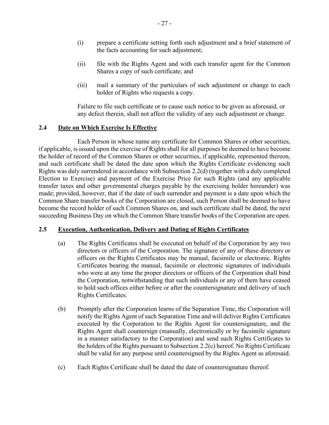 -27-(i)准备一份载列该等调整的证明,以及一份有关该等调整的事实的简短陈述;(ii)向权利代理人及每名普通股的转让代理人提交一份该等证明的副本;及(iii)将该等调整或变更的详情摘要邮寄给每名要求提供副本的权利持有人。未按上述方式提交该证明或导致发出该通知,或其中的任何缺陷,均不影响任何该等调整或变更的有效性。2.4行使生效的日期每名在行使权利时以其名义发行普通股或其他证券的证书(如适用)的人,就所有目的而言,均应被视为已成为在其上代表的普通股或其他证券(如适用)的记录持有人,而该证明书的日期须为根据第2.2(d)款(连同已妥为完成的行使选择)妥为交出证明该等权利的权利证明书及就该等权利支付行使价款(以及行使持有人根据本协议须支付的任何适用转让税及其他政府费用)的日期;但如该等交出及付款的日期为公司的普通股转让簿关闭的日期,该人应被视为已成为该等普通股的记录持有人,且该证明的日期应为公司普通股转让账簿开放的下一个营业日。2.5权利证书的执行、认证、交付和日期(a)权利证书应由公司的任何两名董事或高级人员代表公司签署。任何该等董事或高级人员在权利证书上的签署可采用手工、传真或电子方式。载有在任何时候担任公司适当董事或高级人员的个人的手工、传真或电子签字的权利证书对公司具有约束力,即使该等个人或其中任何一人在会签和交付该等权利证书之前或之后已停止担任该等职务。(b)在公司获悉分立时间后,公司将迅速将该分立时间通知权利代理人,并将由公司签立的权利证书交付权利代理人以供会签,而权利代理人须会签(以公司满意的方式以手工、电子或传真签署的方式),并根据本条例第2.2(c)款将该等权利证书送交权利持有人。任何权利证书在上述权利代理人会签前不得为任何目的有效。(c)每份权利证书应注明其会签日期。