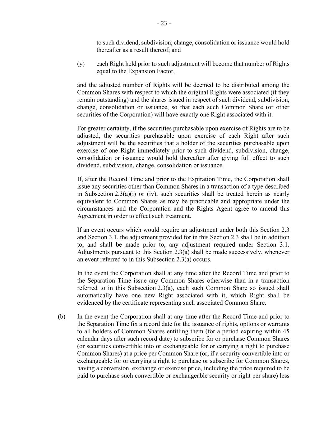 -23-就该等股息而言,分拆、变更、合并或发行将于其后举行;及(y)在该等调整前持有的每项权利将成为等于扩展因数的权利数目,而经调整的权利数目将被视为在与原权利相关的普通股(如果这些权利仍未发行)和就该等股息、分拆、变更、合并或发行而发行的股份之间分配,这样每一股这样的普通股(或公司的其他证券)将拥有与之相关的恰好一项权利。为了更大的确定性,如果要调整行使权利时可购买的证券,则在该调整后的每项权利行使时可购买的证券将是紧接在该股息、拆细、变更、合并或发行之前行使一项权利时可购买的证券的持有人在该股息、拆细、变更、合并或发行完全生效后此后将持有的证券。如果在记录时间之后和到期时间之前,公司应在第2.3(a)(i)或(iv)款所述类型的交易中发行普通股以外的任何证券,则该等证券应在此被视为在该情况下在切实可行和适当的情况下几乎等同于普通股,并且公司和权利代理人同意修订本协议以实现此种处理。如发生需要根据本条2.3款和第3.1款作出调整的事件,则本条2.3款所规定的调整应是对第3.1款所要求的任何调整的补充,并应在此之前作出。凡发生本款第2.3(a)款所提述的事件,须依据本条第2.3(a)款作出调整。如公司须在记录时间后及分立时间前的任何时间发行任何普通股,而不是在本款2.3(a)所提述的交易中发行,则如此发行的每一该等普通股应自动拥有一项与其相关的新权利,该权利须以代表该等相关普通股的证书作为证明。(b)如公司须在记录时间后及分立时间前的任何时间,订定向所有普通股股东发行权利、期权或认股权证的记录日期,使他们有权(在该记录日期后45个历日内届满的期间)按每股普通股的价格认购或购买普通股(或可转换为或可交换为或带有购买普通股权利的证券)(或,可转换为或可交换为或带有购买或认购普通股权利的证券,具有转换、交换或行使价格,包括购买该可转换或可交换证券或每股权利所需支付的价格)减